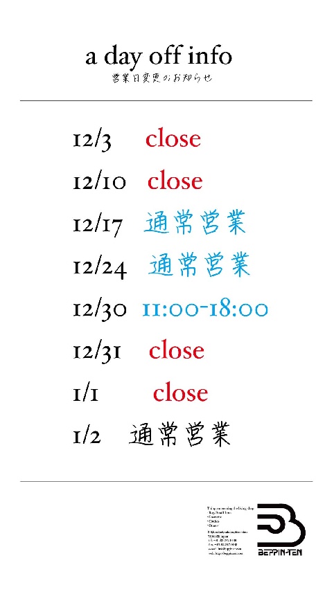 みなさんこんにちは♪本日は年末年始の営業日についてのお知らせです♪毎週水曜日が定休日のべっぴん店ですが、明日12/17(水)24日(水)は営業いたしております♪そして、年末年始ですが、12月30日(火)は年内最後の営業日となっております。最終日は11:00〜1 ...