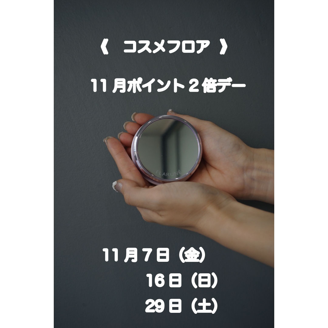 みなさんこんにちは♪日々のお肌のお手入れ楽しんでいらっしゃいますでしょうか?本日はコスメフロアより11月のポイント2倍デーのお知らせです♪ 11月7日(金) 16日(日) 29日(土)こちらの3日間でございます♪新商品がたくさん発売されますので是非この ...