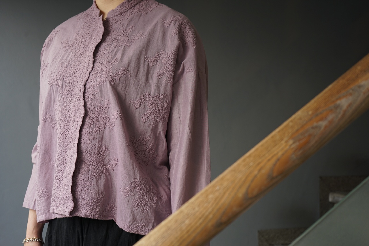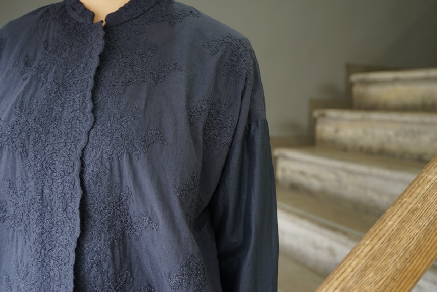 ヴィンテージ感のある繊細なレースが特徴でフロントのボタンは比翼仕立てのすっきりとしたデザイン。フロントボタンを閉めた時に隠れてしまう部分にもレースを使っているmizuiro indらしいこだわりの1枚です♪