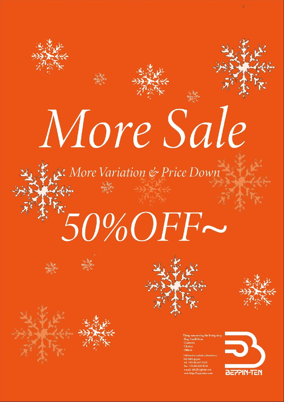 みなさんこんにちは♪ 本日はMORE SALEのお知らせです♪ 明日1月24日(土)より、 店内SALEアイテムがさらにマークダウンとなります。 2階&1階 バッグコーナーとお洋服売り場が対象です♪ 50%OFFになるアイテムも多数ございます! 気になっていたアイテムがもしかしたら マークダウンになっているかもしれませんね♪ ぜひ皆さまのご来店お待ちいたしております♪ また、オンラインショップは明日1/24(土)11:00頃より、 公開いたしますので、こちらもぜひご覧になってみてください♪