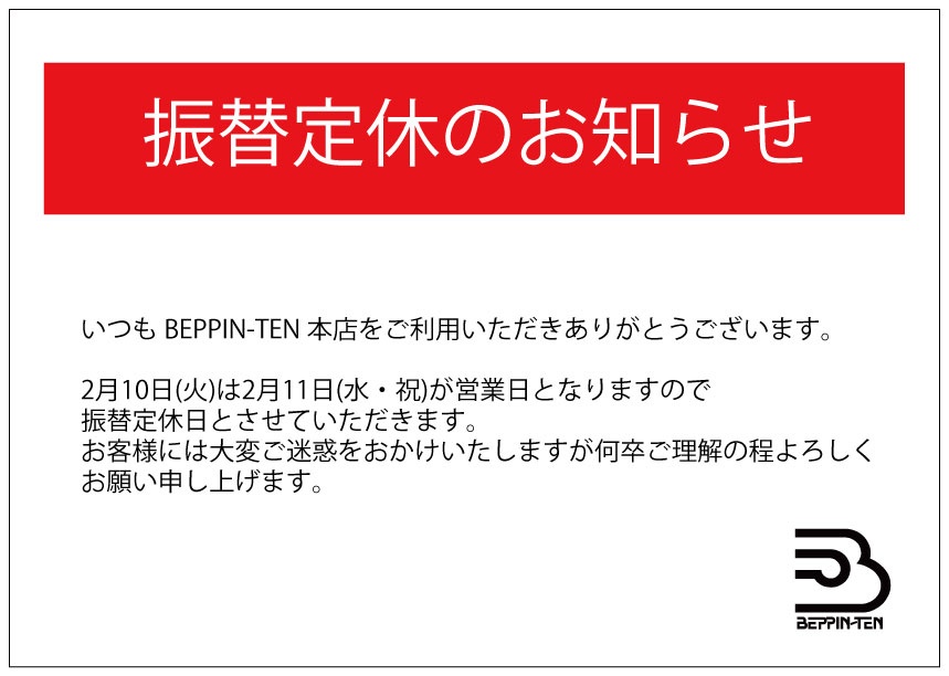 みなさんこんにちは♪2月営業日についてのお知らせです。べっぴん店は毎週水曜日を定休日とさせてきただいておりますが、2月11日(水・祝)は営業いたします♪そして、振り替えとしまして、2月10日(火)は定休日となります。お客様には大変ご迷惑をおかけいたしますが、ご ...