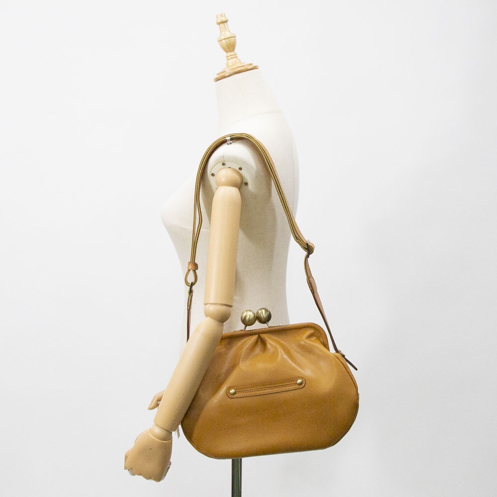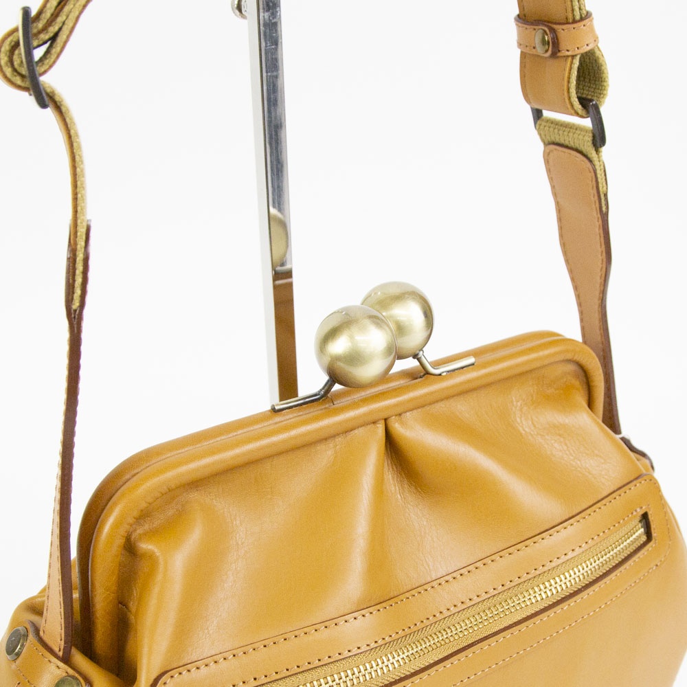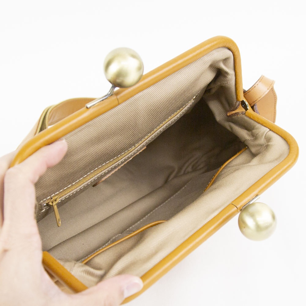 真鍮でできた大きならっきょう玉がアイコンのガマ口バッグです。 かわいい小さな外ポケット付です。 牛革で出来ているので、使うごとに味わいも出てきます。 裏地まで可愛い全年代の女性におすすめのバッグです。 クチ金には真鍮加工を施しており、革同様に経年変化が起きます。 中の裏地もさりげなく可愛く、使うのが毎日楽しくなりそうですね。