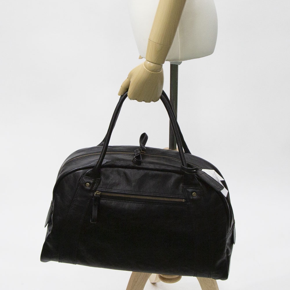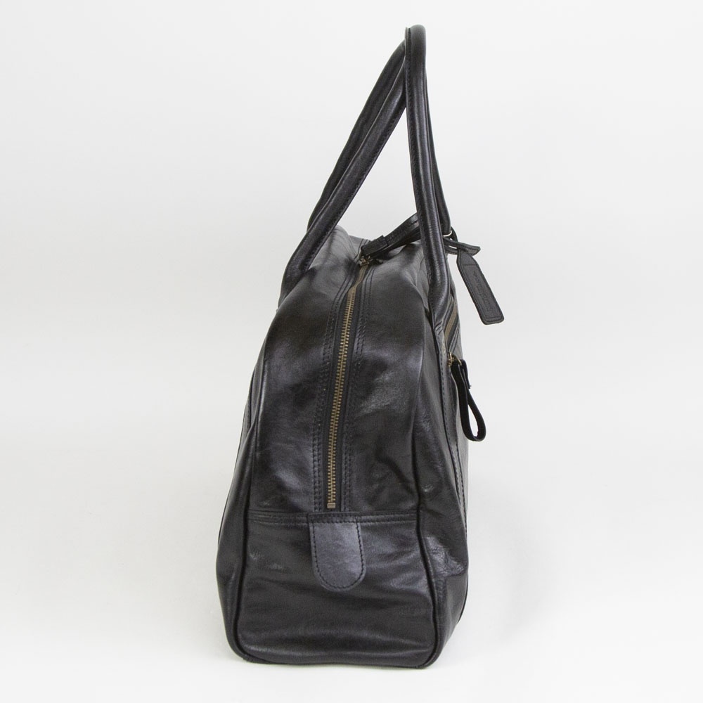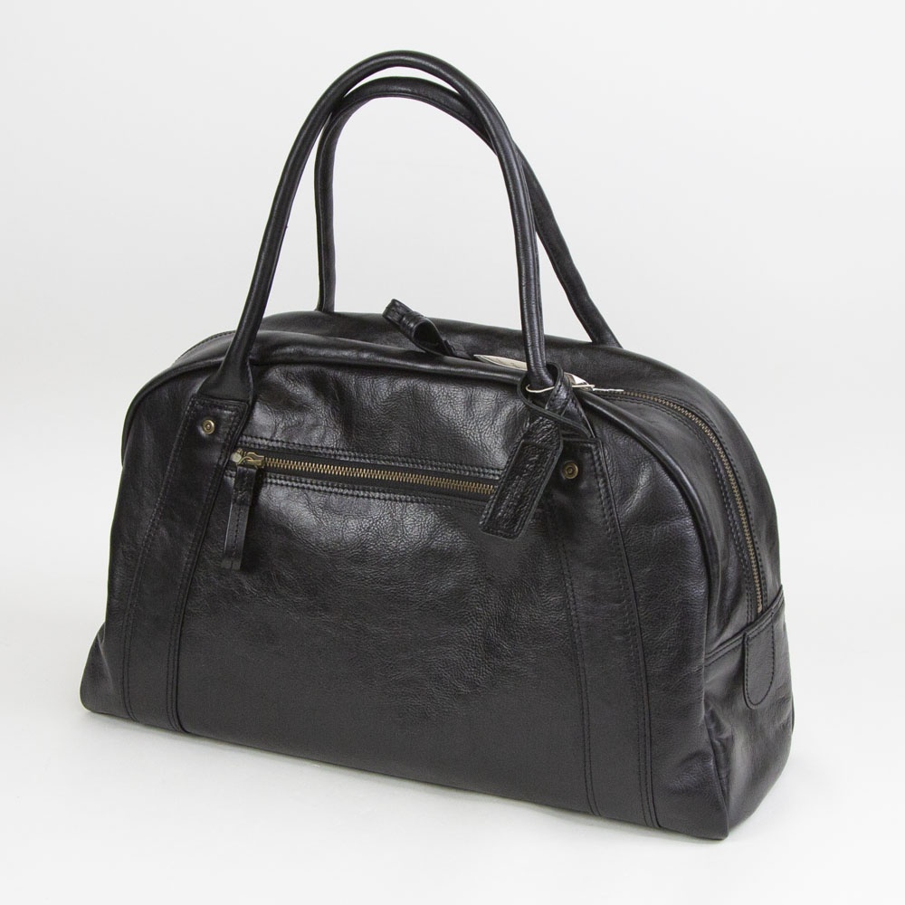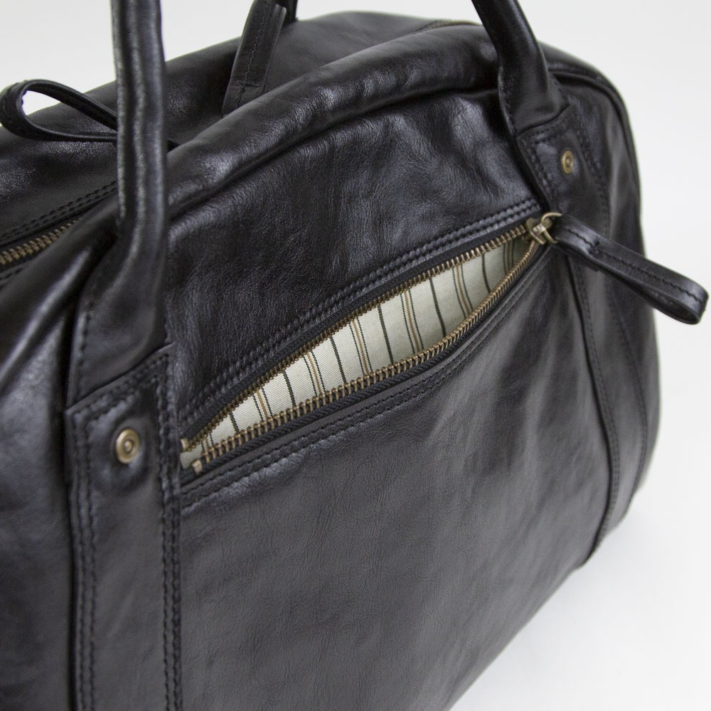 クラシックな佇まいのボストン型バッグです。こちらは、2サイズある中の大きな方となります。 ファスナーは、両開きで、開口部を広く取り尚且つバッグ外側には前後共にファスナーポケットがつけられております。 ハンドルは、優しくソフトに作られており、肩にかけた時の絶妙な長さが計算されています。底板が備わっており、しかも鋲も打ってある為、床置きしても心配ありません。とても軽く、旅行は勿論の事、ビジネスそしてタウンユースとしてもお使いいただけます。