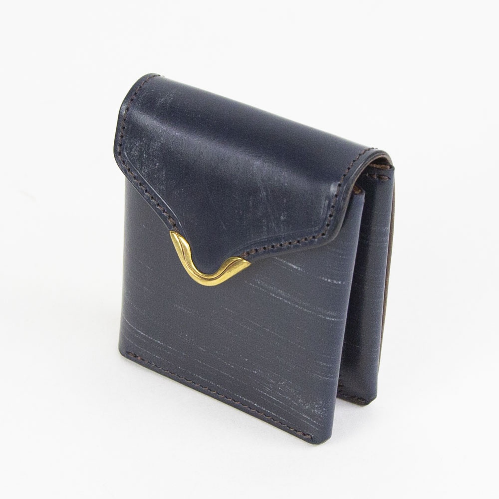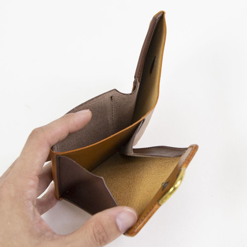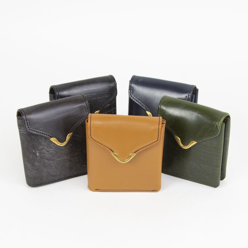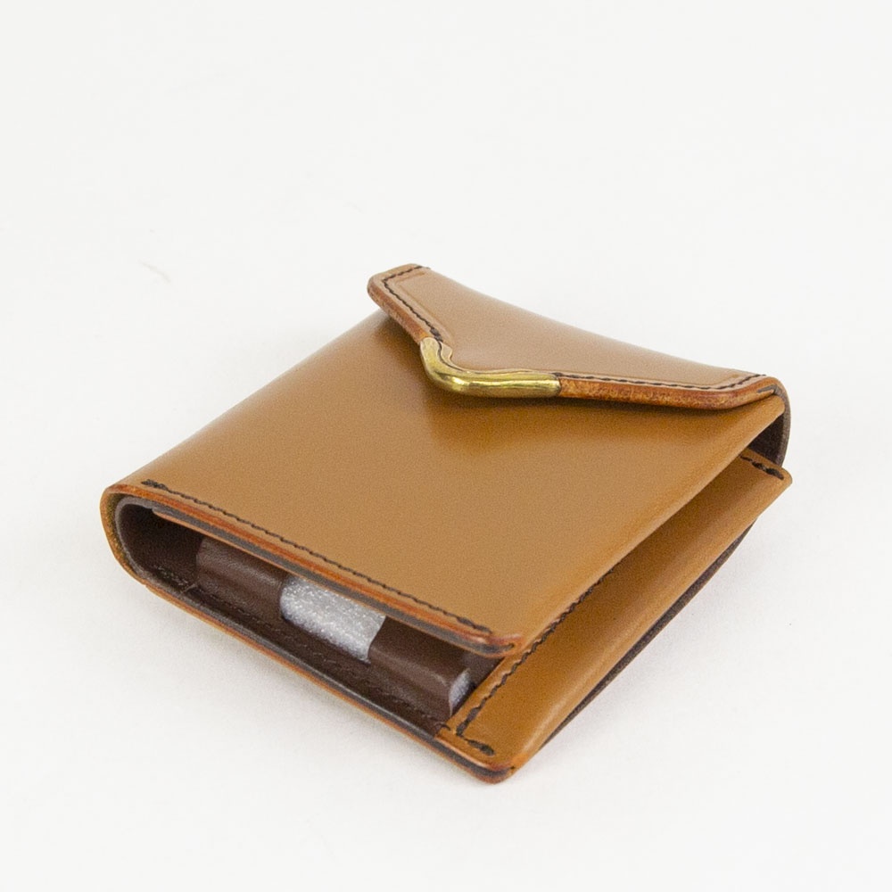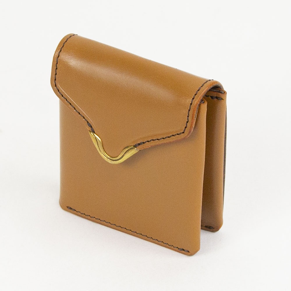 ギャルソンコインポケットを備えたスリムな 2 つ折りウォレット。 2つ折り財布で最小クラスの本体と収納力を両立させました。 お札、カード、コイン全て一度にアクセスできる設計。 多目的に使えるポケットにはレシートや領収書などを収納できます。 真鍮製のコバ補強金具は鋳造で製作し、板物では出せないエレガントな立体感が魅力です。