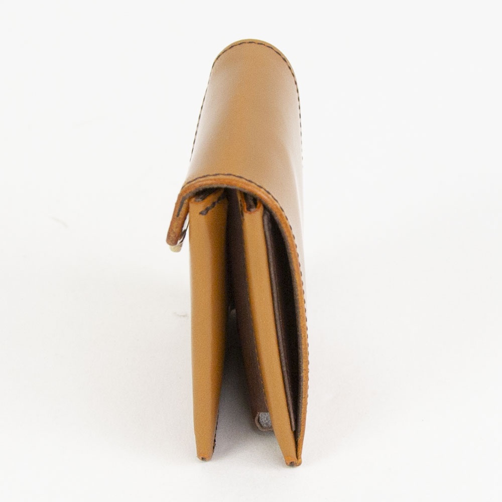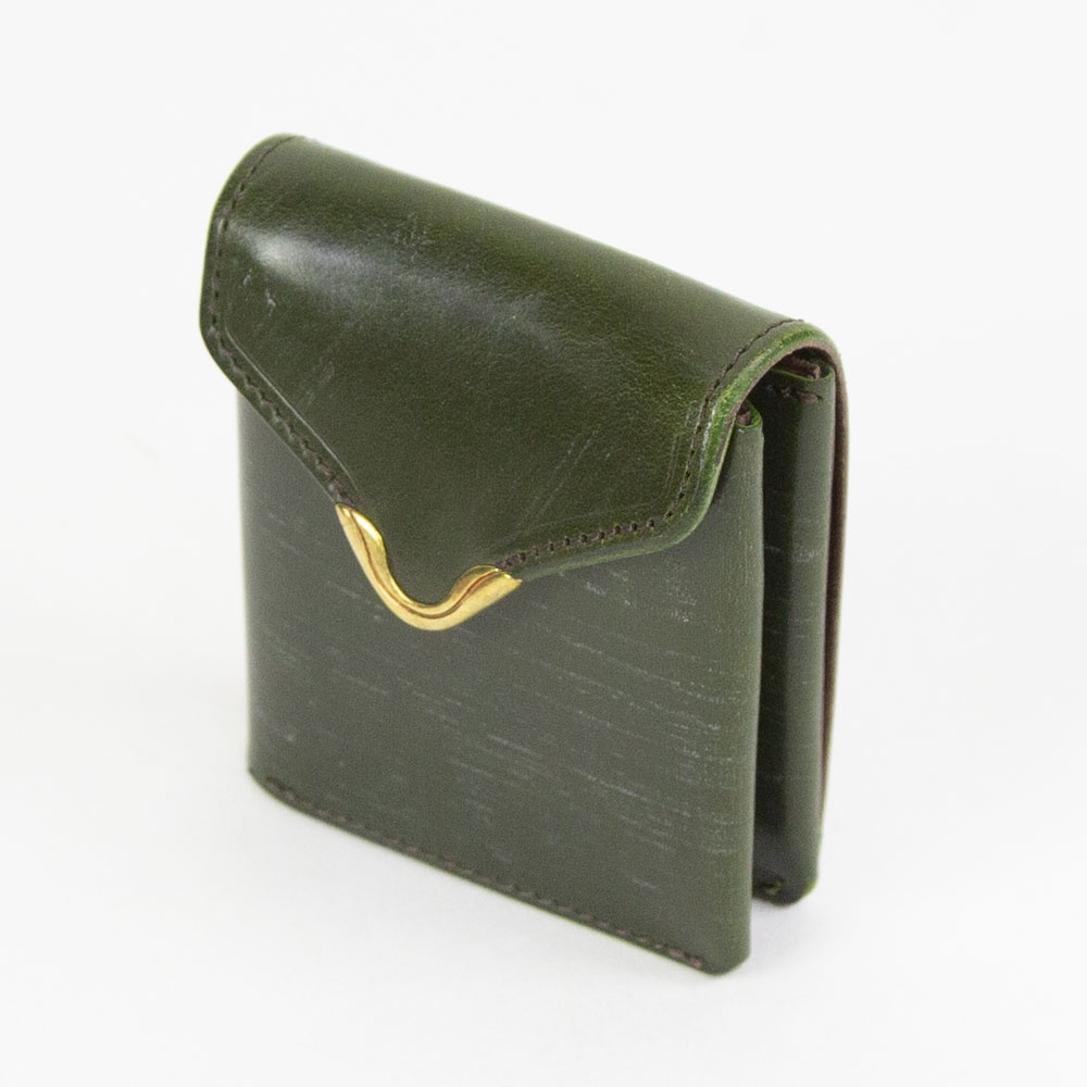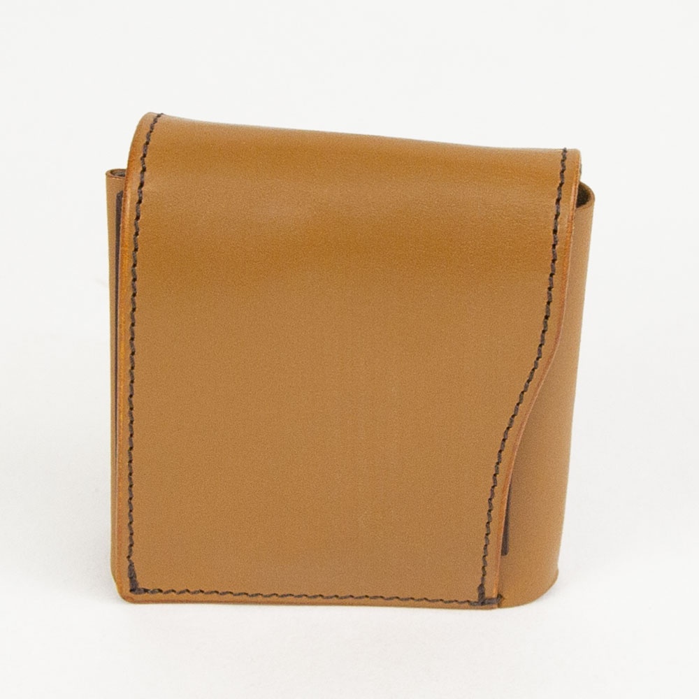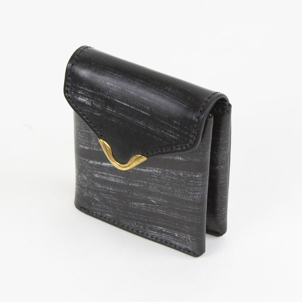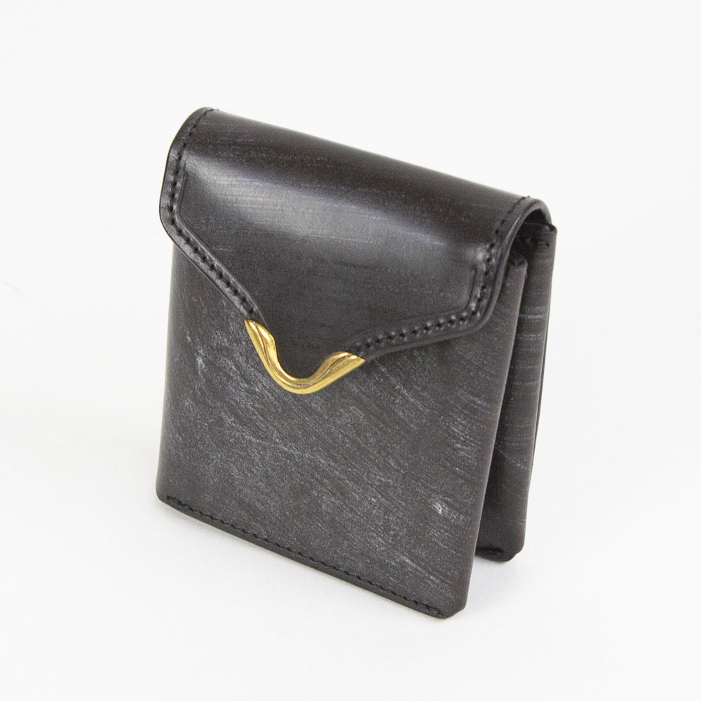 ギャルソンコインポケットを備えたスリムな 2 つ折りウォレット。 2つ折り財布で最小クラスの本体と収納力を両立させました。 お札、カード、コイン全て一度にアクセスできる設計。 多目的に使えるポケットにはレシートや領収書などを収納できます。 真鍮製のコバ補強金具は鋳造で製作し、板物では出せないエレガントな立体感が魅力です。