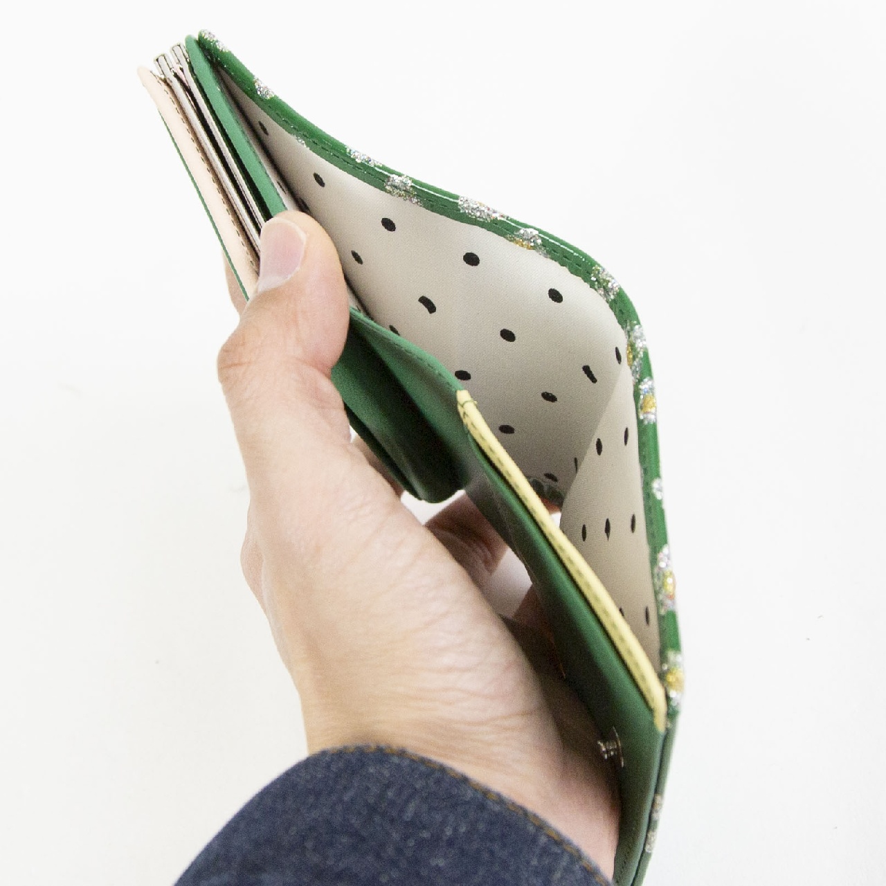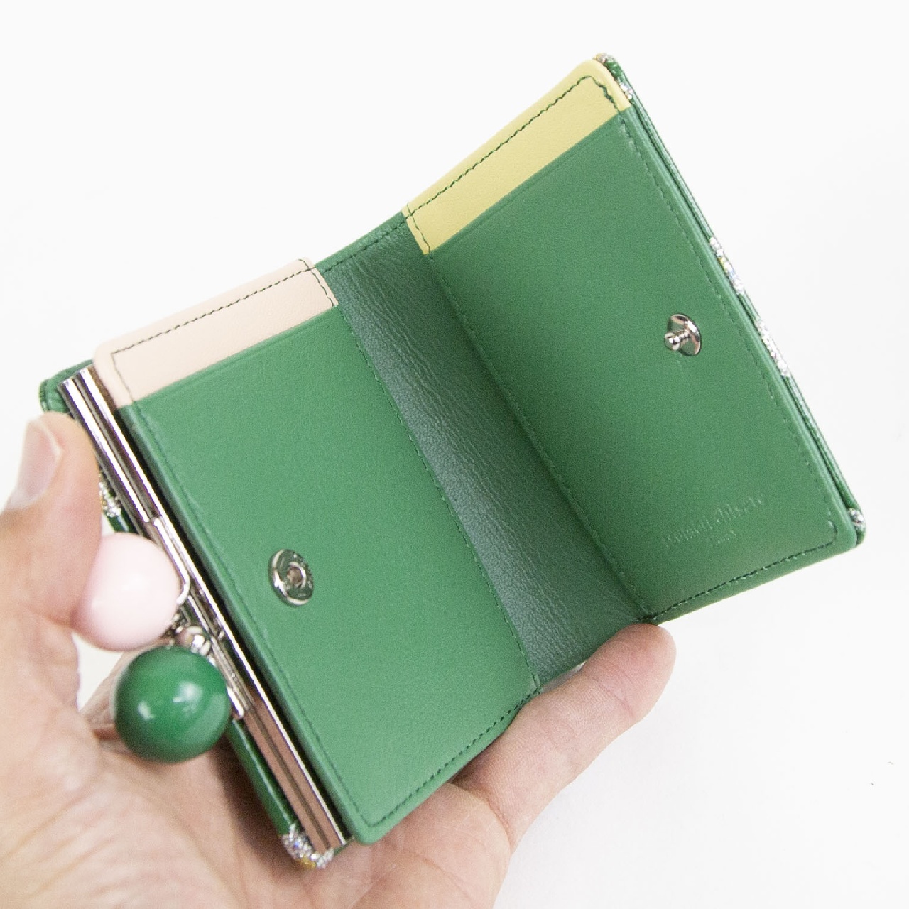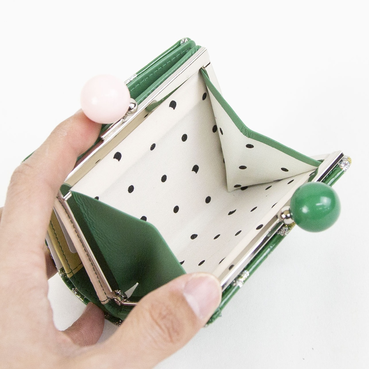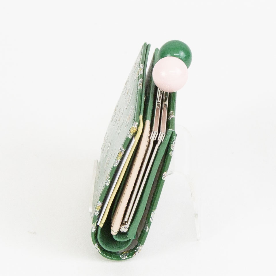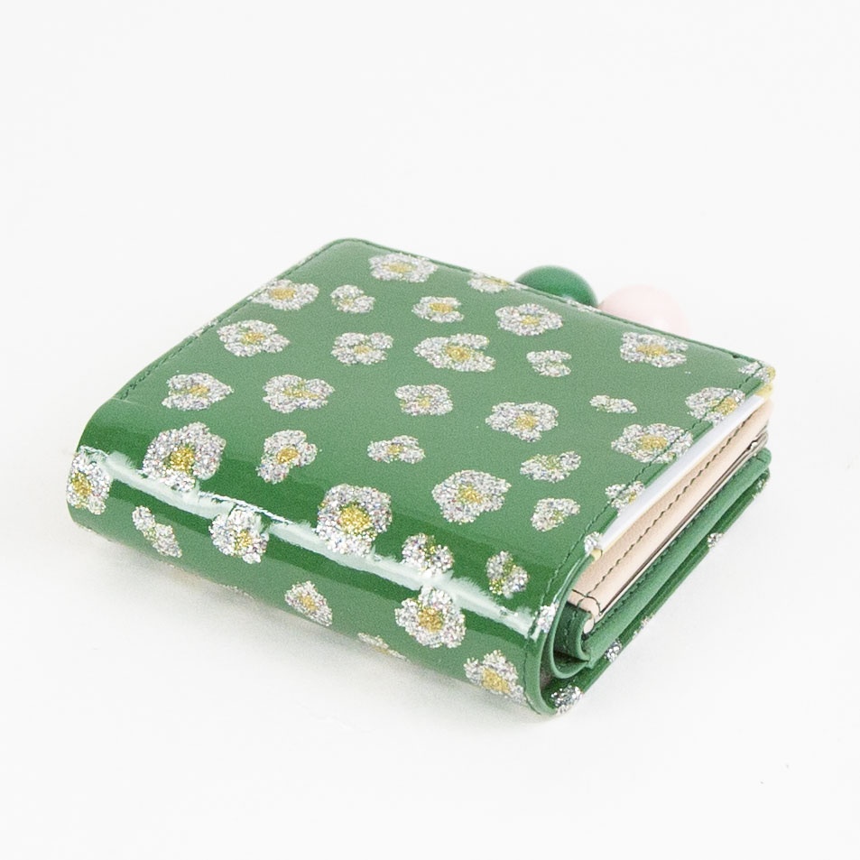 キラキラのフラワープリントが前面に施されたシリーズです。 コインルームは仕切り付きで2ヶ所に分かれているので、取り出しやすく視認性もバッチリです。 札入れも2ヶ所に分かれているので、紙幣とレシート類など綺麗に整理できる使い勝手の良い仕様になっています。 ガマ口部分はブラックとグリーンで本体カラーにも使われているポップなデザインになっています。 持っているだけで気分も明るくなるアイテムです。
