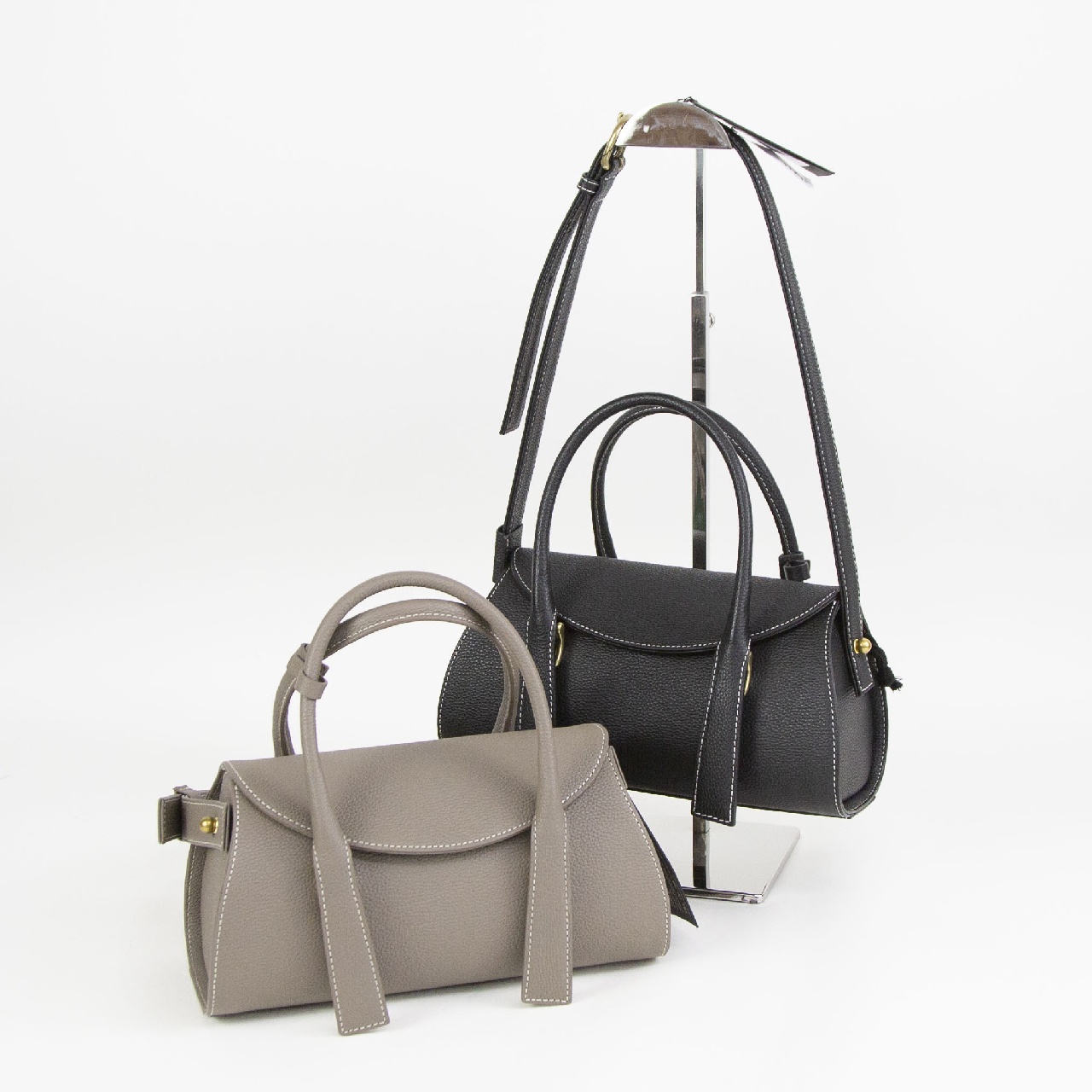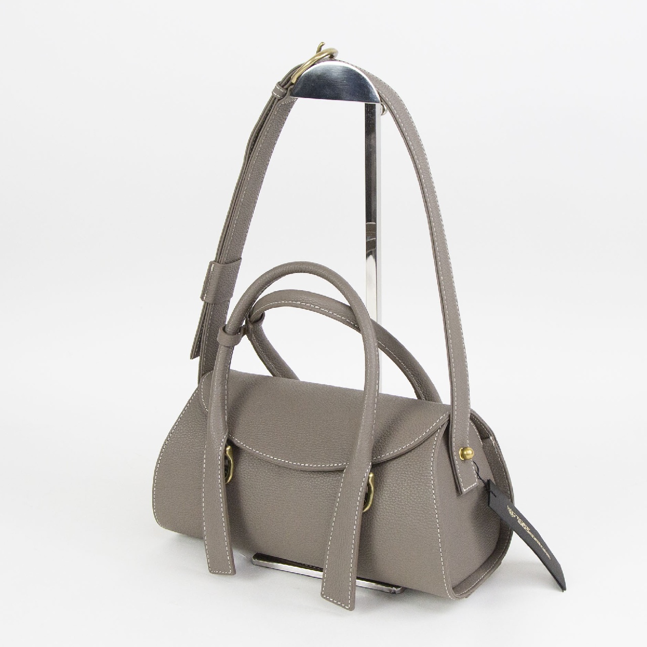 かぶせタイプのクラシックなハンドバッグですが、横長の丸みを帯びたころんとしたフォルムや、宙に浮いたようなデザインのハンドルが新鮮な印象を与えます。
