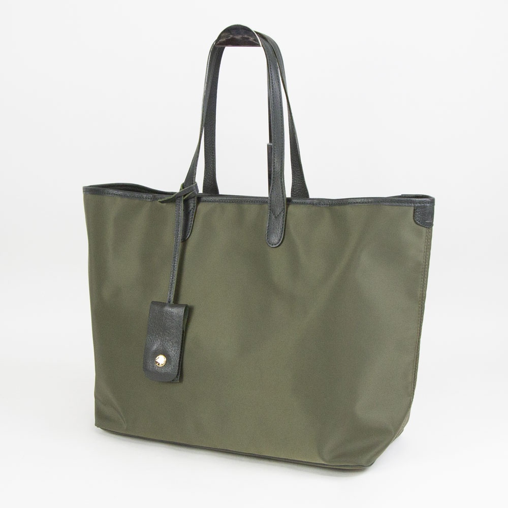 イタリア、リモンタ社のナイロン『デイビス』を本体に使用したラージサイズのトートバッグです。ハンドルは肩掛けが可能です。開口部についているフラップは内側のポケットのふたでもあり、またフラップ同士をスナップボタンで留めることによりバッグの中身が見えないように目隠しをすることができる仕様になっています。レザーのキーホルダーチャームがついています。ユニセックスで使用していただけるデザインになっています。
