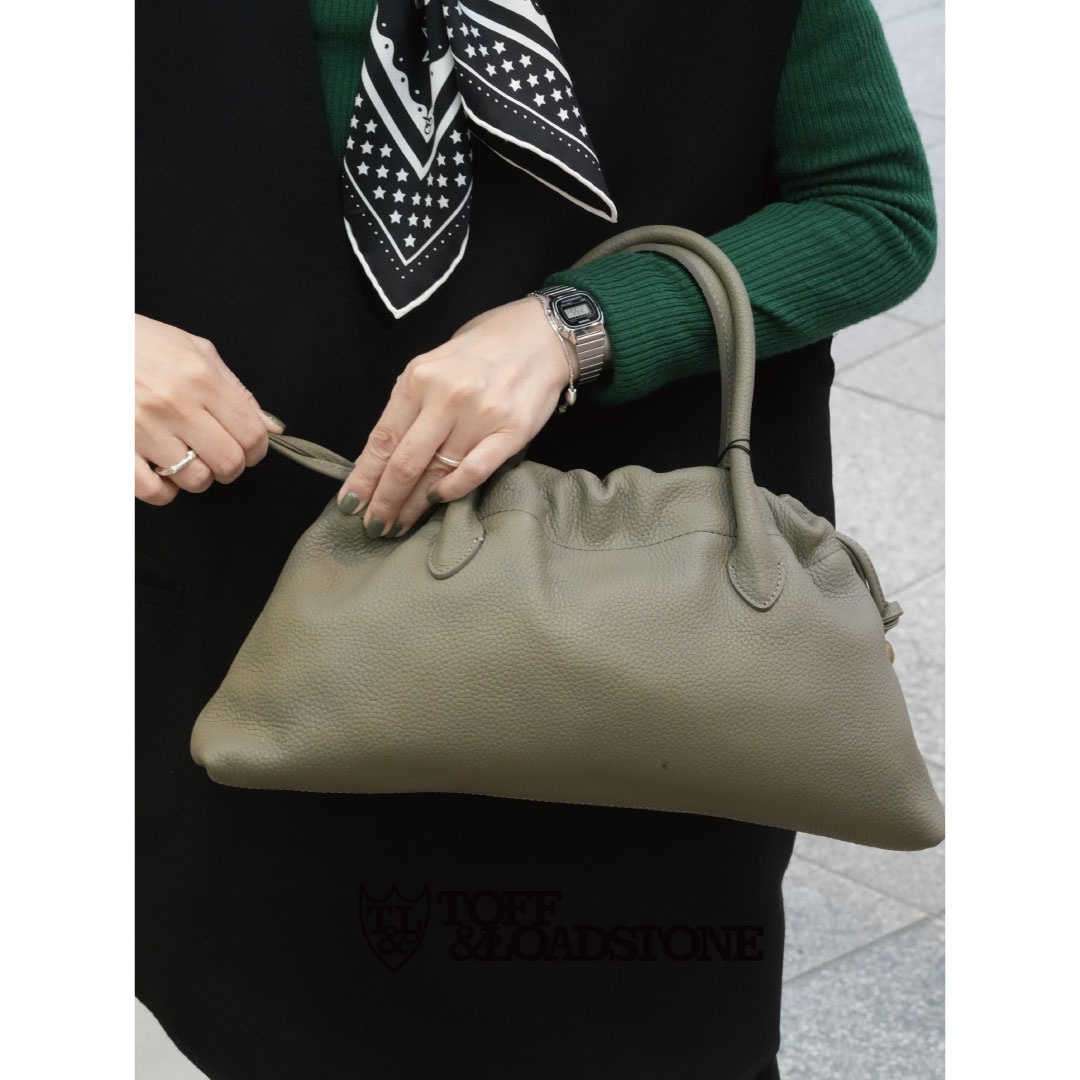 オリジナルの真鍮金具のパーツの使用と、バッグに対しての深い知見を持ったオリジナルバッグを手掛ける日本のブランド、TOFF&LORDSTONEから、新作バッグのご紹介です。 シュリンクレザーを使ったドローストリング、巾着型のバッグ。通常の巾着とは違い横幅を大きく取っているので、少しキレイ目なハンドバッグとしてのお使いも◎ 絞り上げのに使うレザーストリング部分のパーツもオリジナル真鍮パーツ、ライニングもポリエステルジャカードを使ったオリジナルライニングを使用。