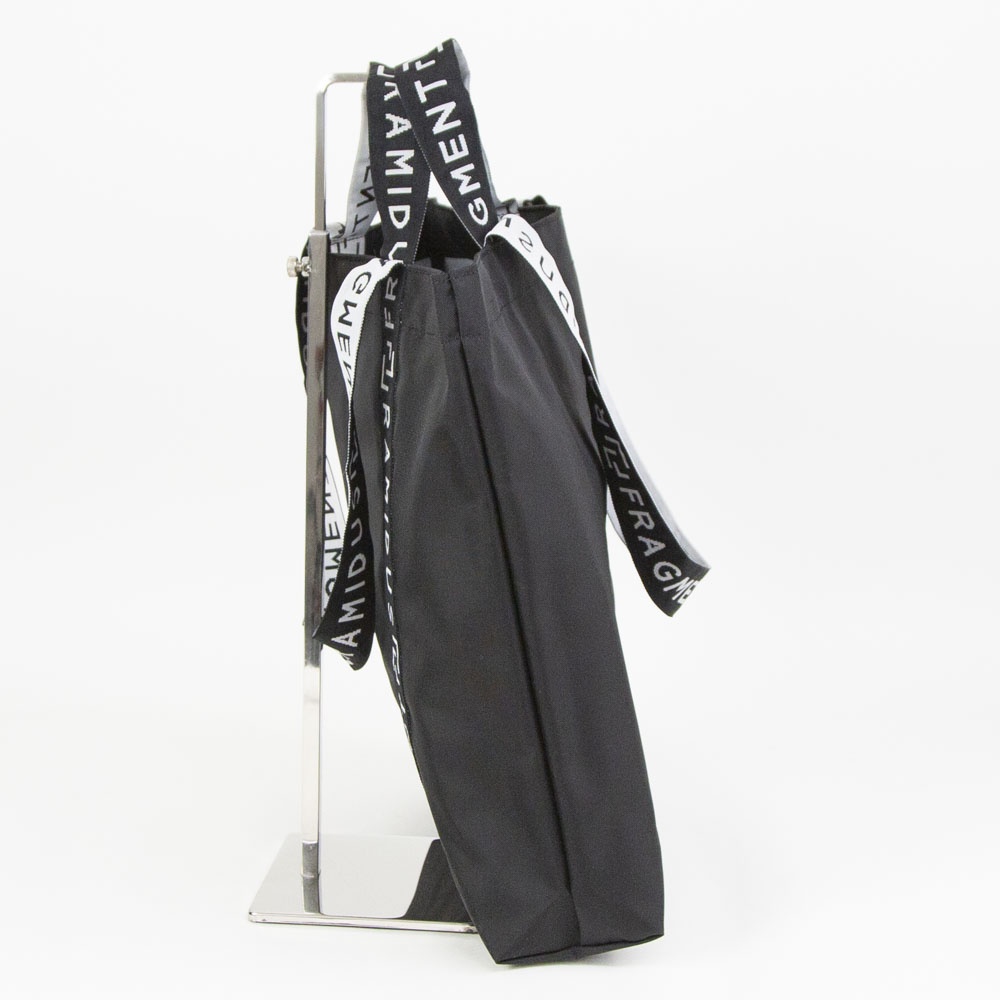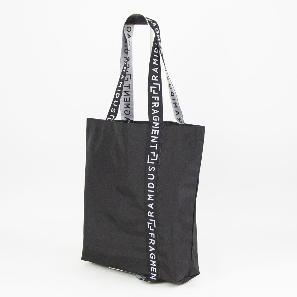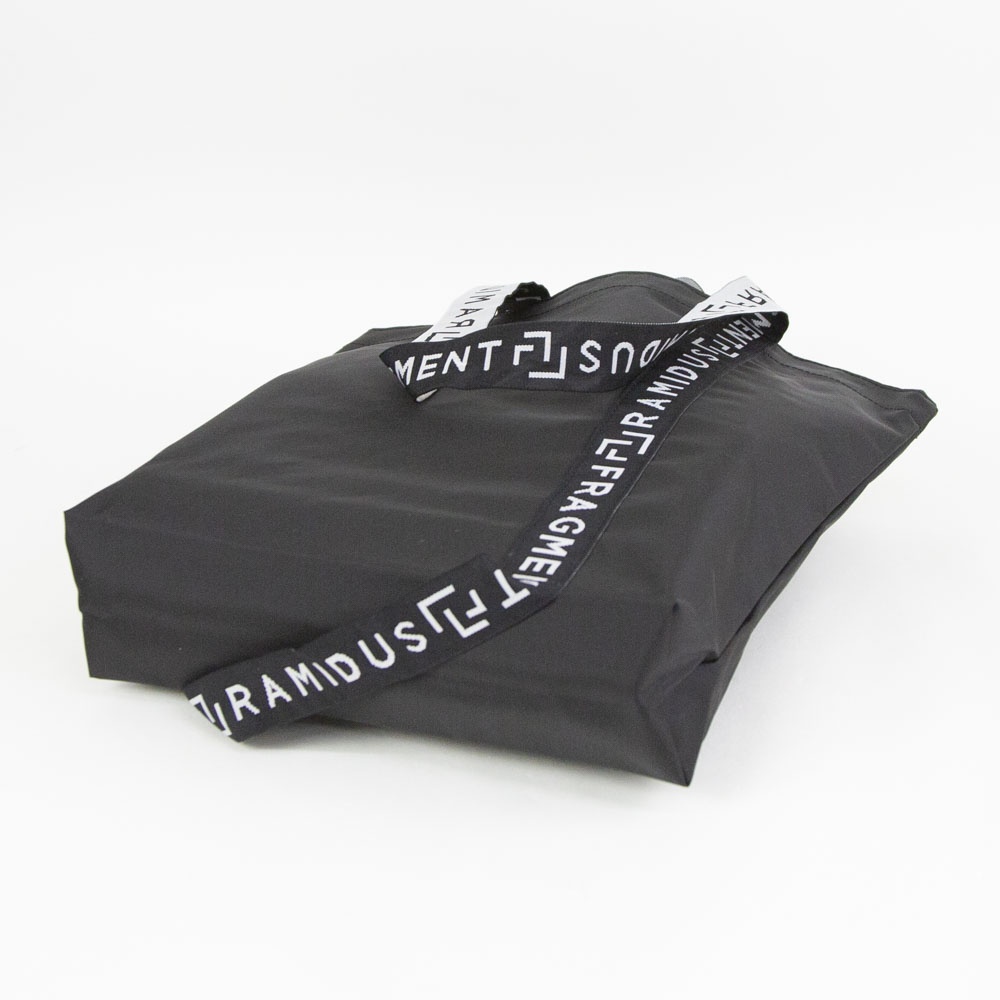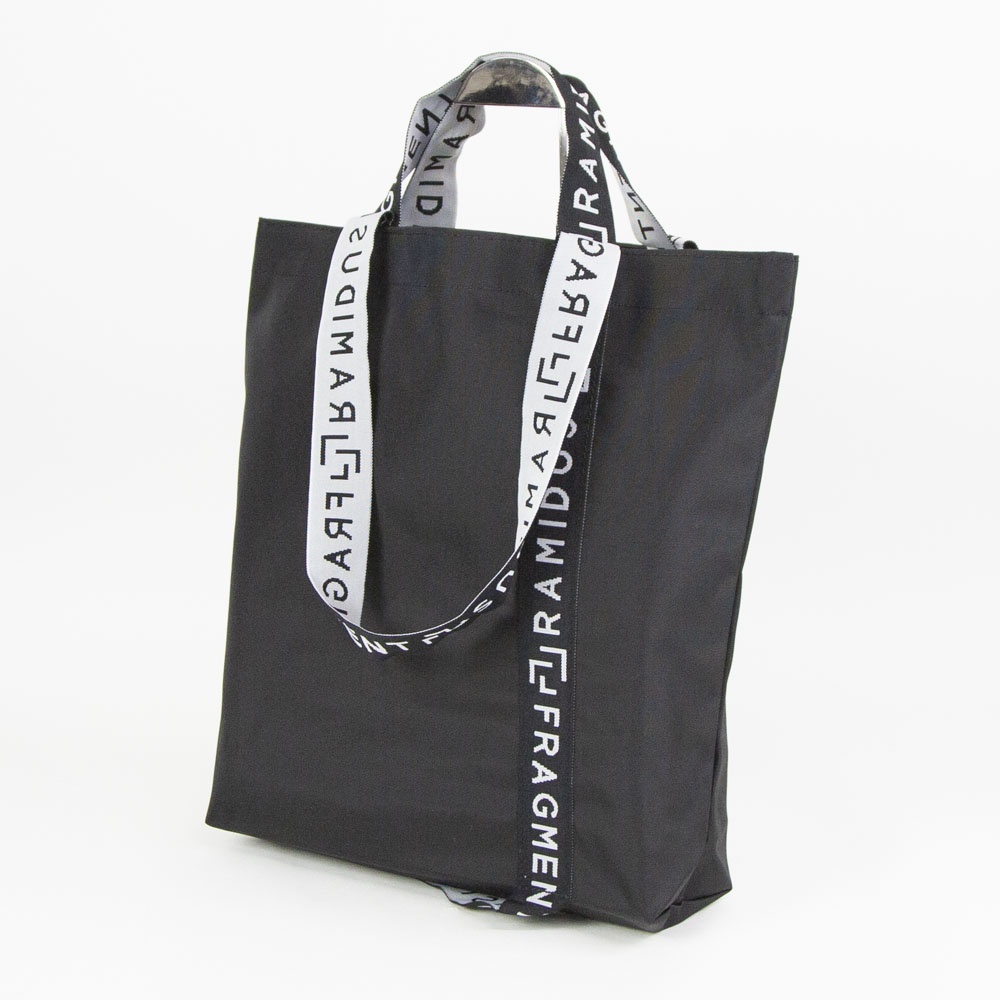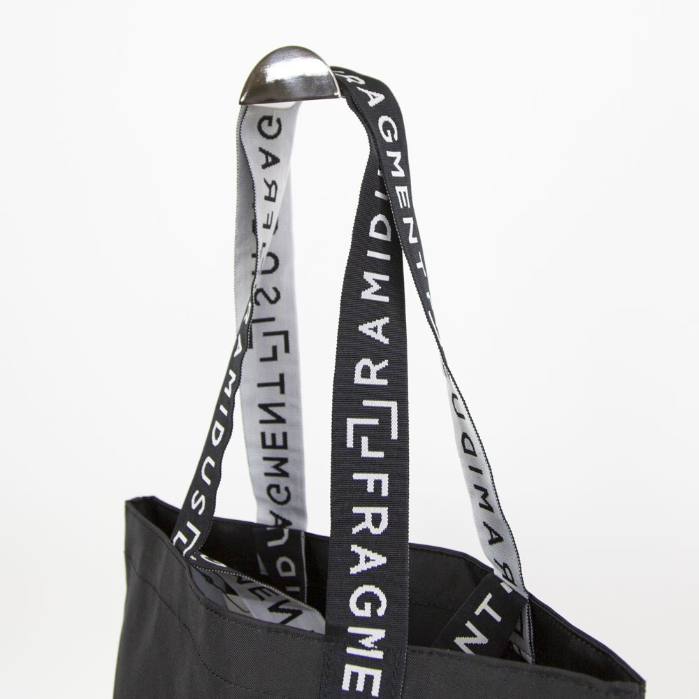 手持ち、肩掛けで使えるマガジンサイズのトートバッグ。420デニールの平織りナイロンを使用し、生地の裏側にコーティングを施すことで内装の防水性を備える。1本のテープで切れ目無く構成されたハンドルは、両ブランドのロゴが織り込まれたfragment designとのコラボレーションを象徴する特別仕様。