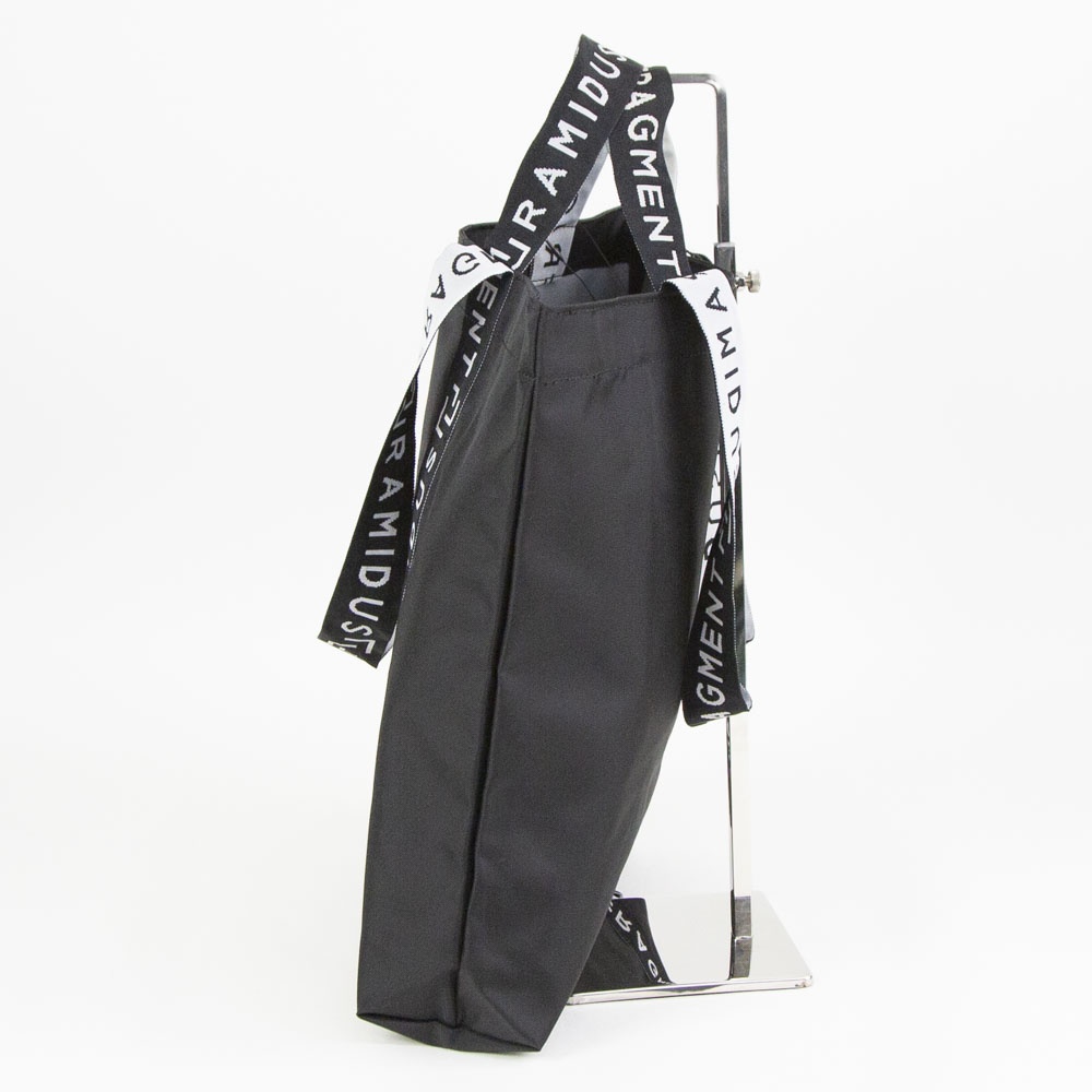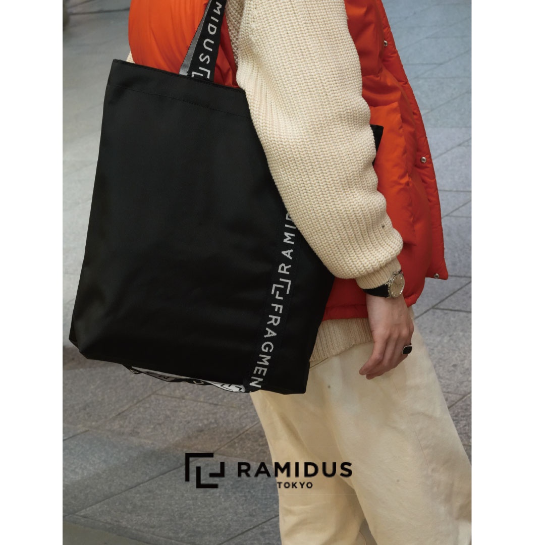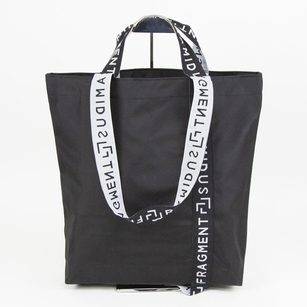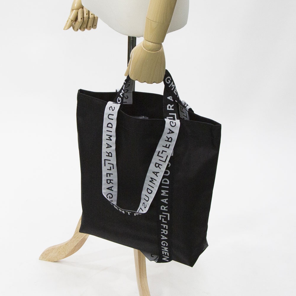 手持ち、肩掛けで使えるマガジンサイズのトートバッグ。420デニールの平織りナイロンを使用し、生地の裏側にコーティングを施すことで内装の防水性を備える。1本のテープで切れ目無く構成されたハンドルは、両ブランドのロゴが織り込まれたfragment designとのコラボレーションを象徴する特別仕様。
