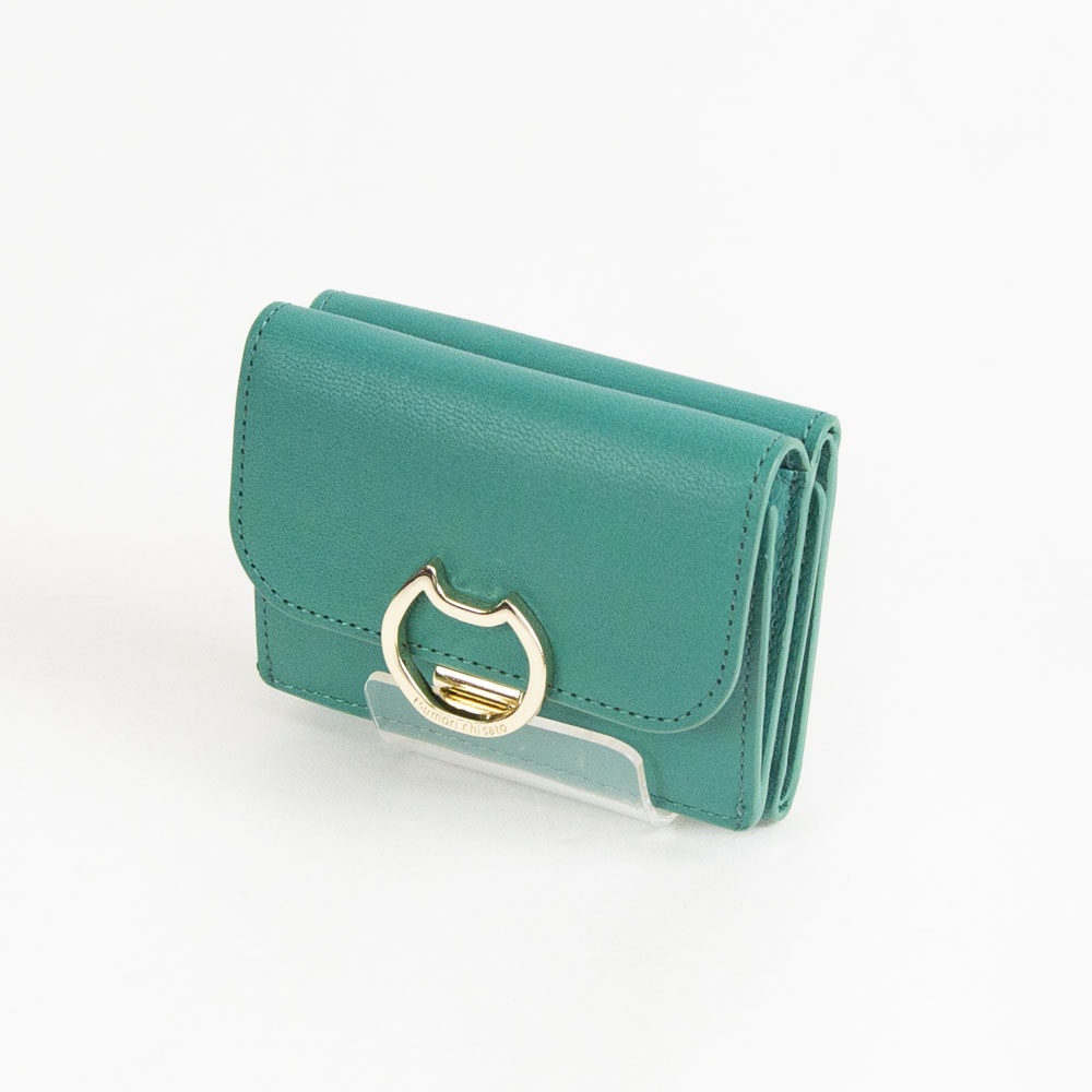 コンパクトな三つ折りのミニ財布。ネコの金具を開いたところが小銭入れ。内側には札入れと1個のカードポケット。札入れの中にもカードポケットを1つ設けています。