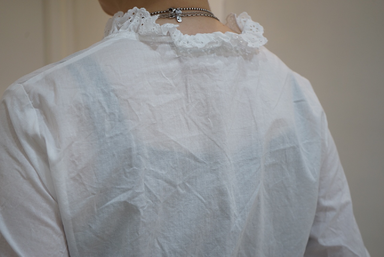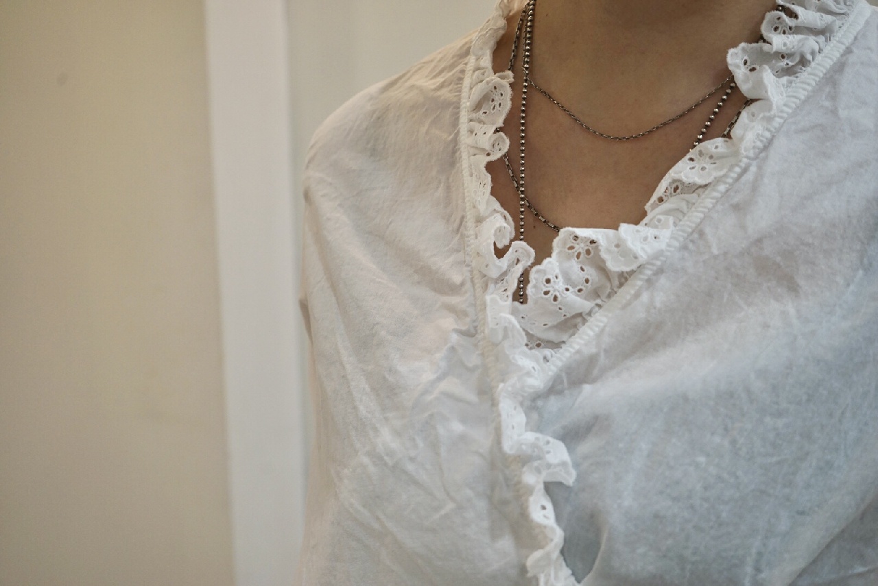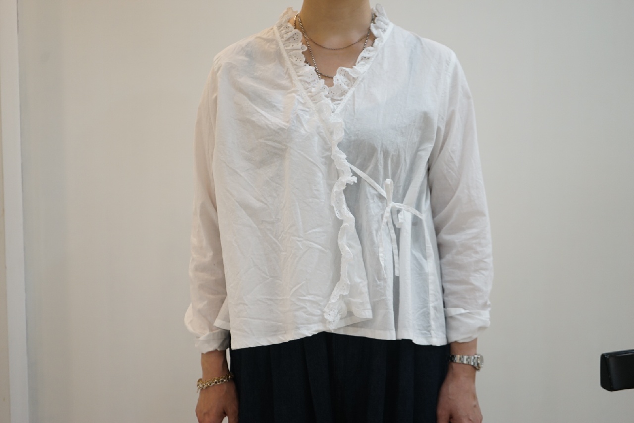 上品なレースの60ローンエンブロイダリーを使用したレースカシュクールカーディガンです。洗い加工でヴィンテージ感のあるデザインで襟元にレースがあしらわれた上品なカシュクールシャツ。中紐と外紐で留める仕様です。透け感があり晩夏から秋~冬にかけ長く愛用していただけます。