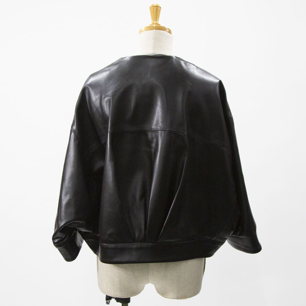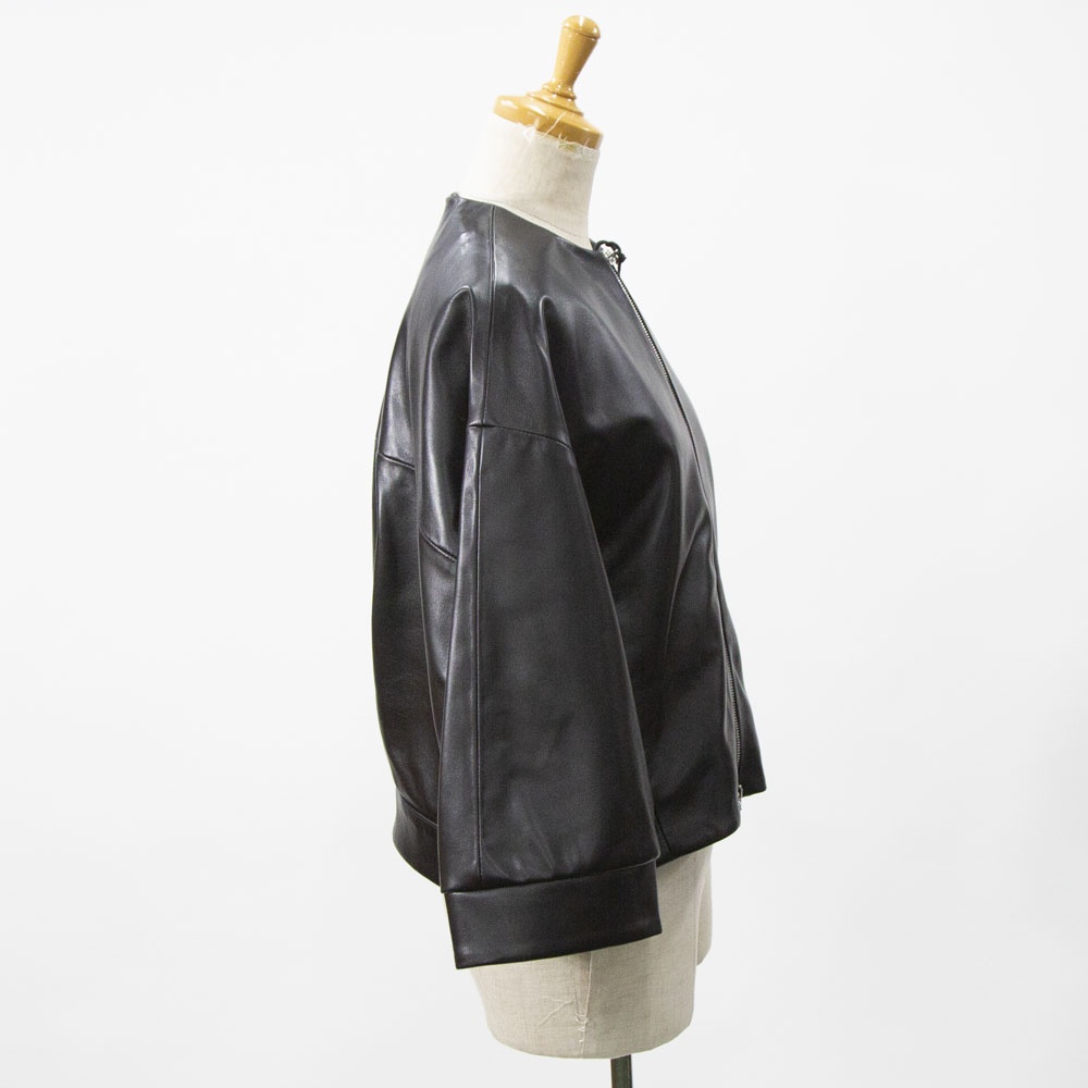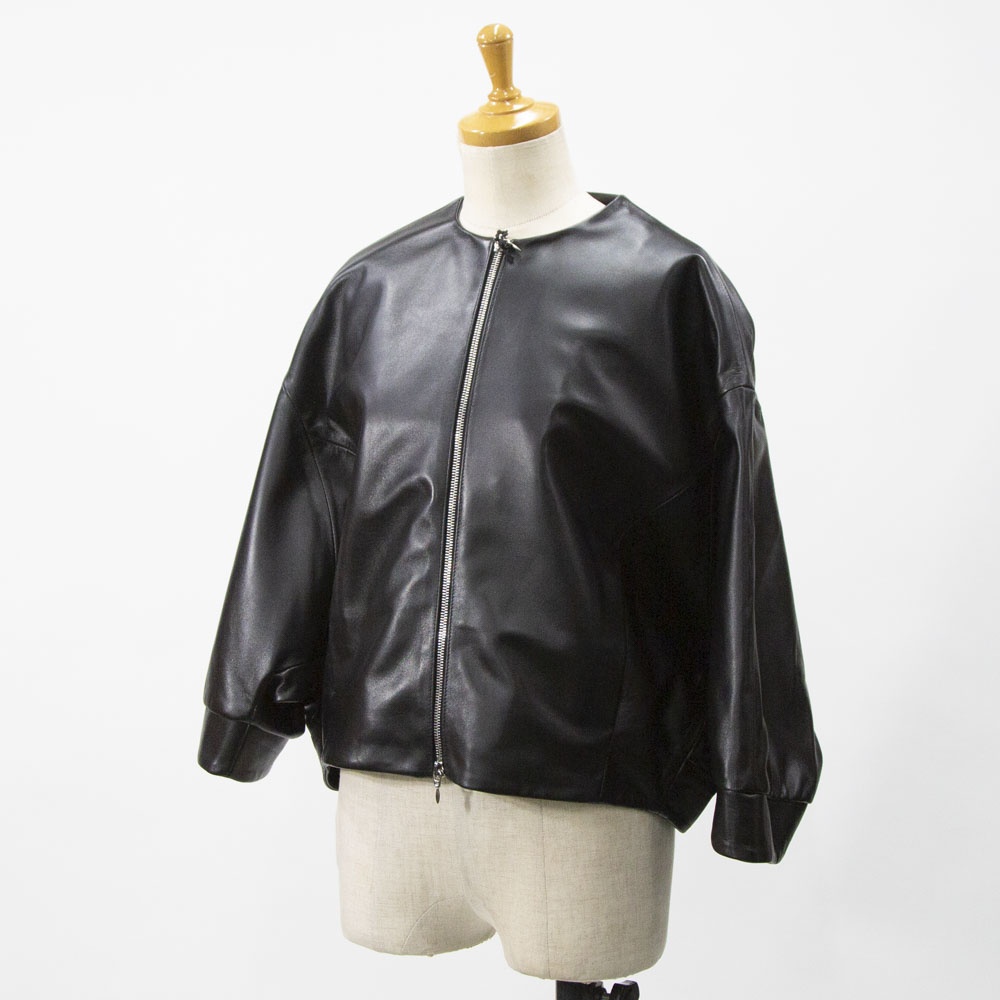 定番ラムスキンを使用したショート丈のノーカラーライダース。身幅を大きく、ドルマンスリーブのように袖幅にゆとりを持たせた形となっているので、ライトな着こなしが可能となっています。