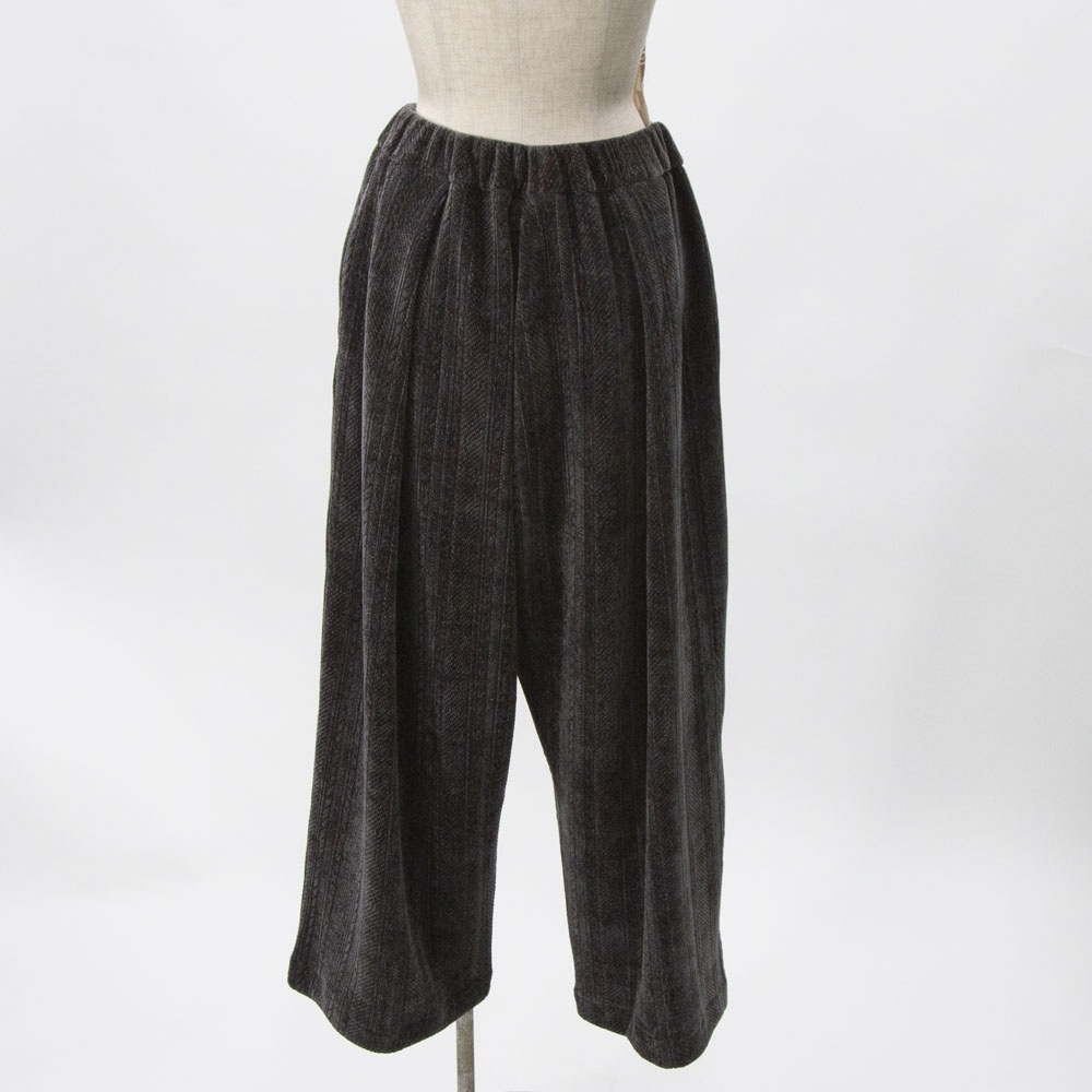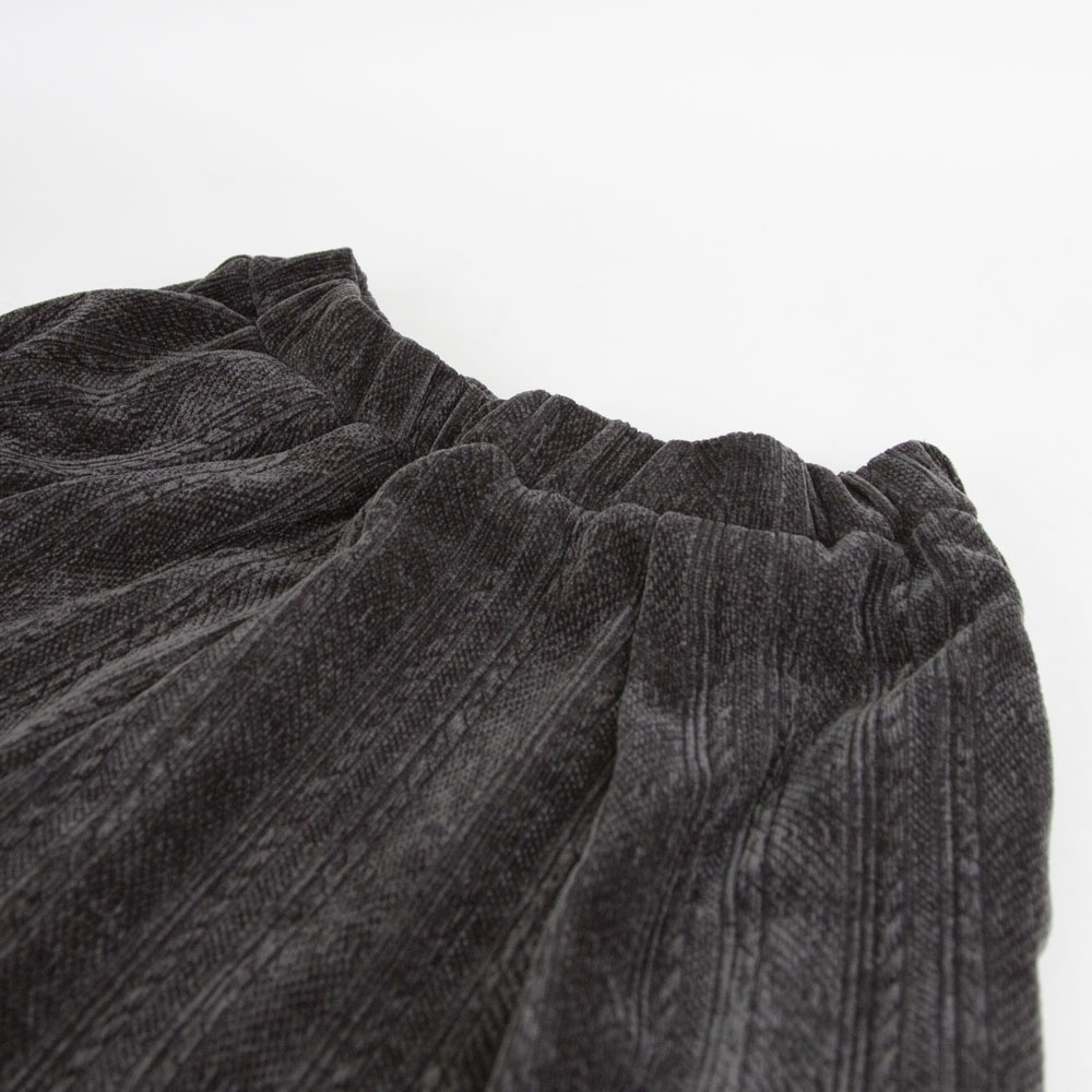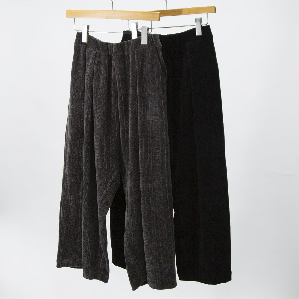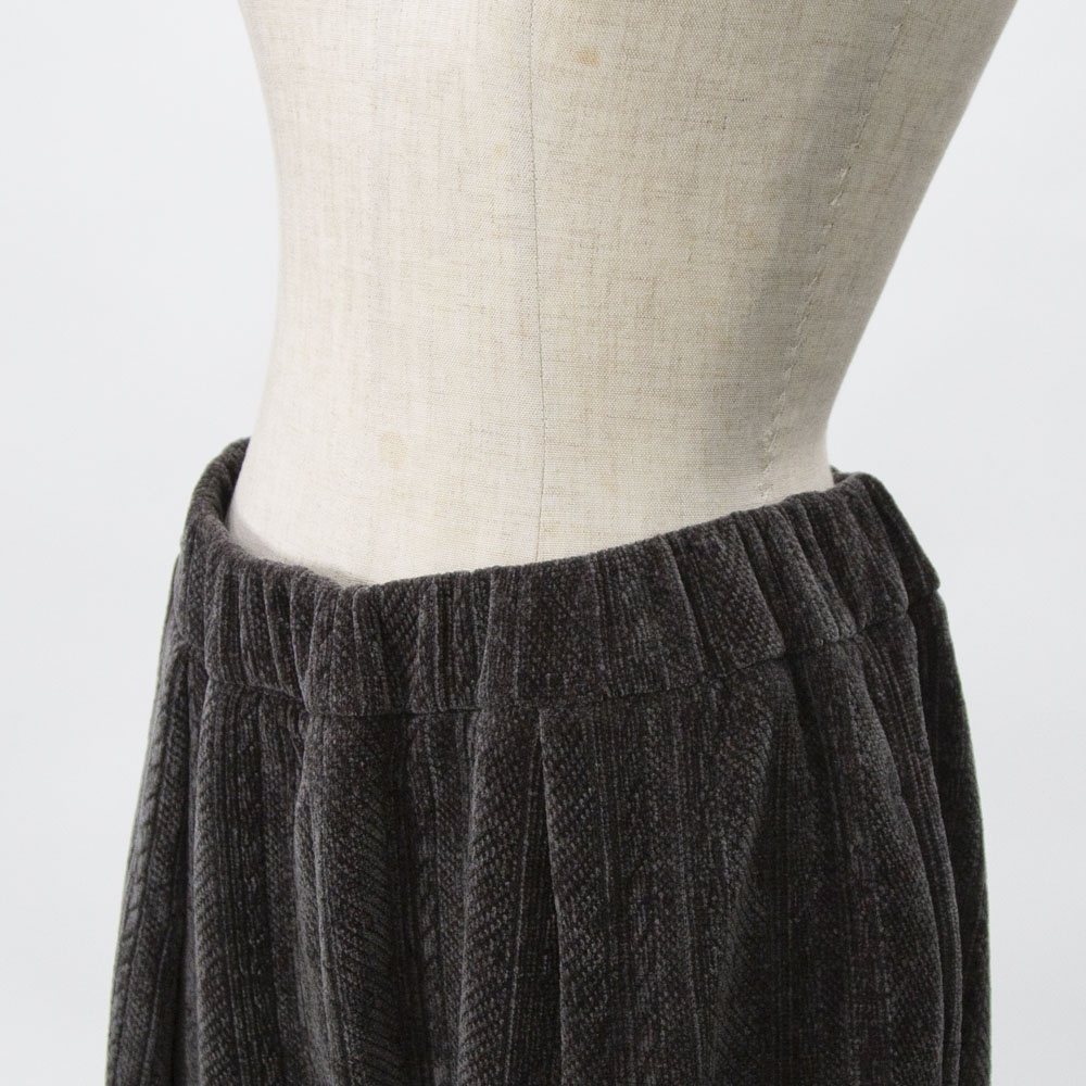 着心地の良いベロア素材のベロアジャガードタックパンツです。アラン柄がシックでで上品な雰囲気。程よい光沢感がありモードなモード感たっぷりの1枚です。ウエストはリラックス感のあるゴム使用。長すぎない丈感なので小柄の方にも穿きやすい長さです。