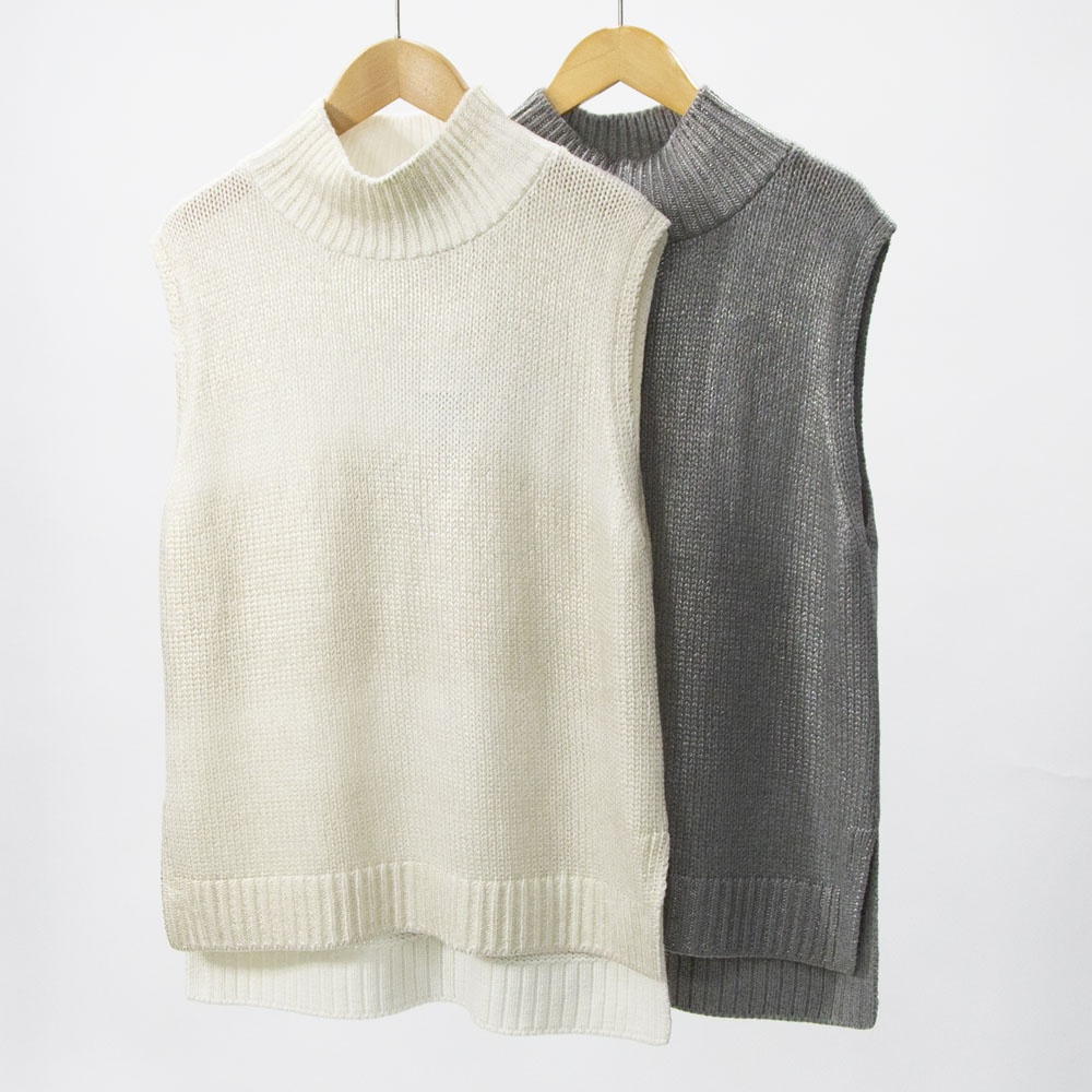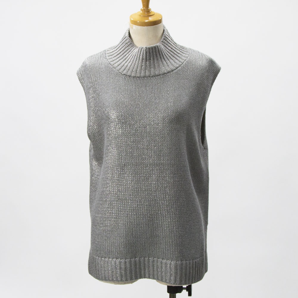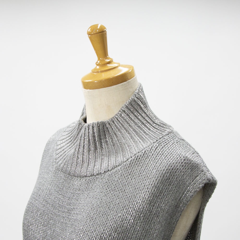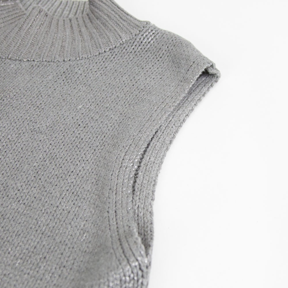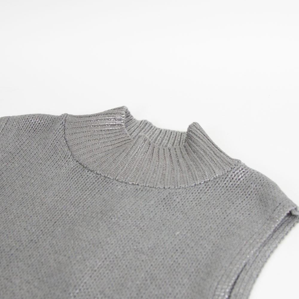 ラメ感のある箔プリントのハイネックベストです。モードでかっこいい光沢感が特徴。広めのリブで前後差のあるヒップ丈のデザイン。サイドスリット入りで動きやすいのもポイント。