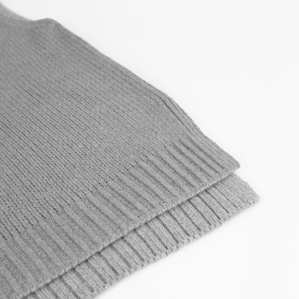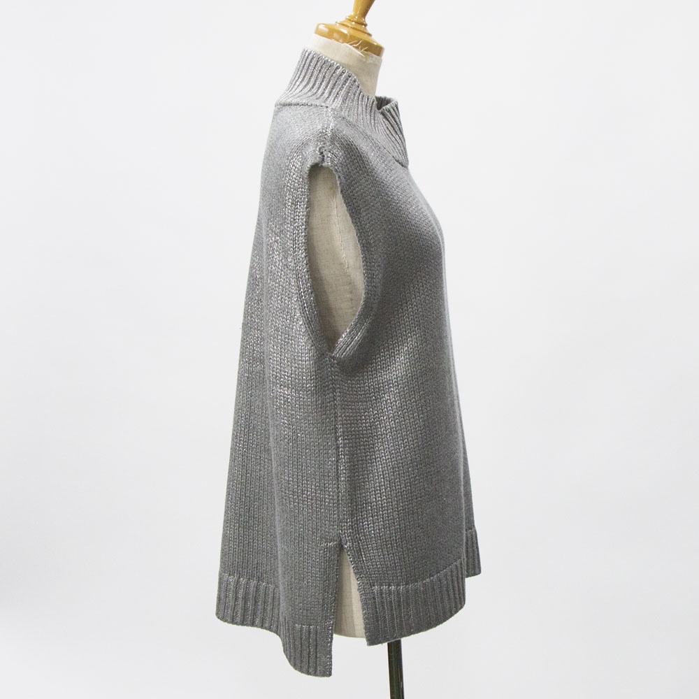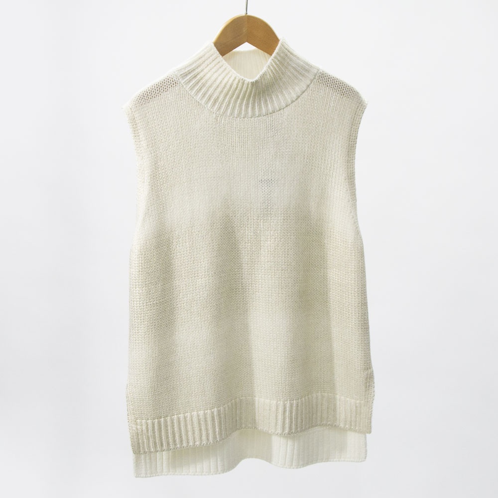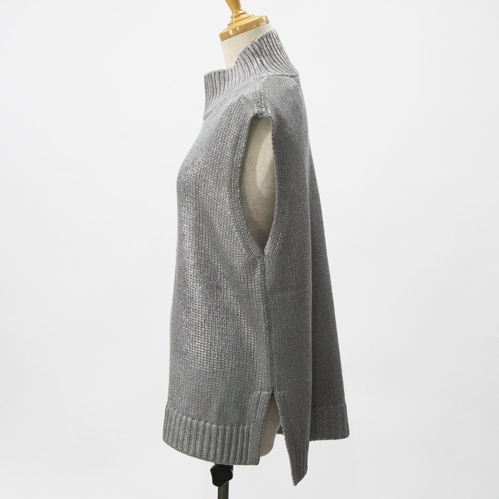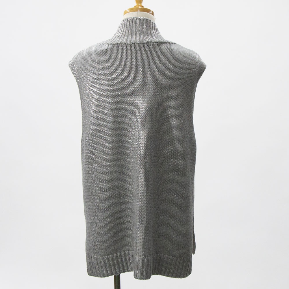 ラメ感のある箔プリントのハイネックベストです。モードでかっこいい光沢感が特徴。広めのリブで前後差のあるヒップ丈のデザイン。サイドスリット入りで動きやすいのもポイント。