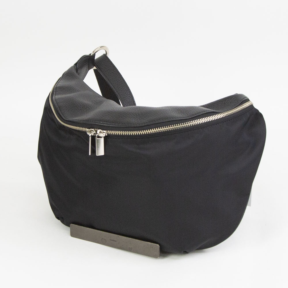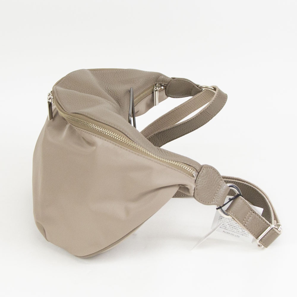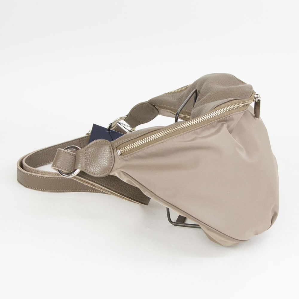 本体はポリエステル素材で仕上げ、他パーツはレザーを組み合わせたベーシックなボディバッグです