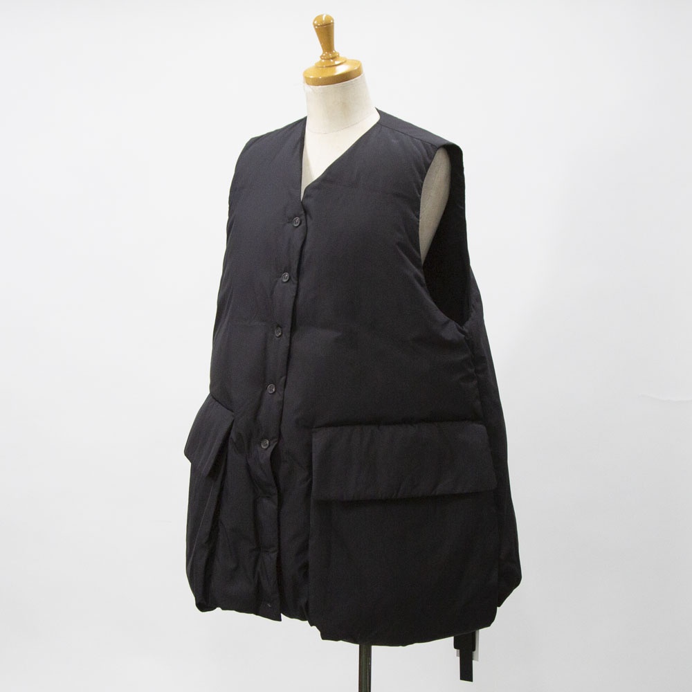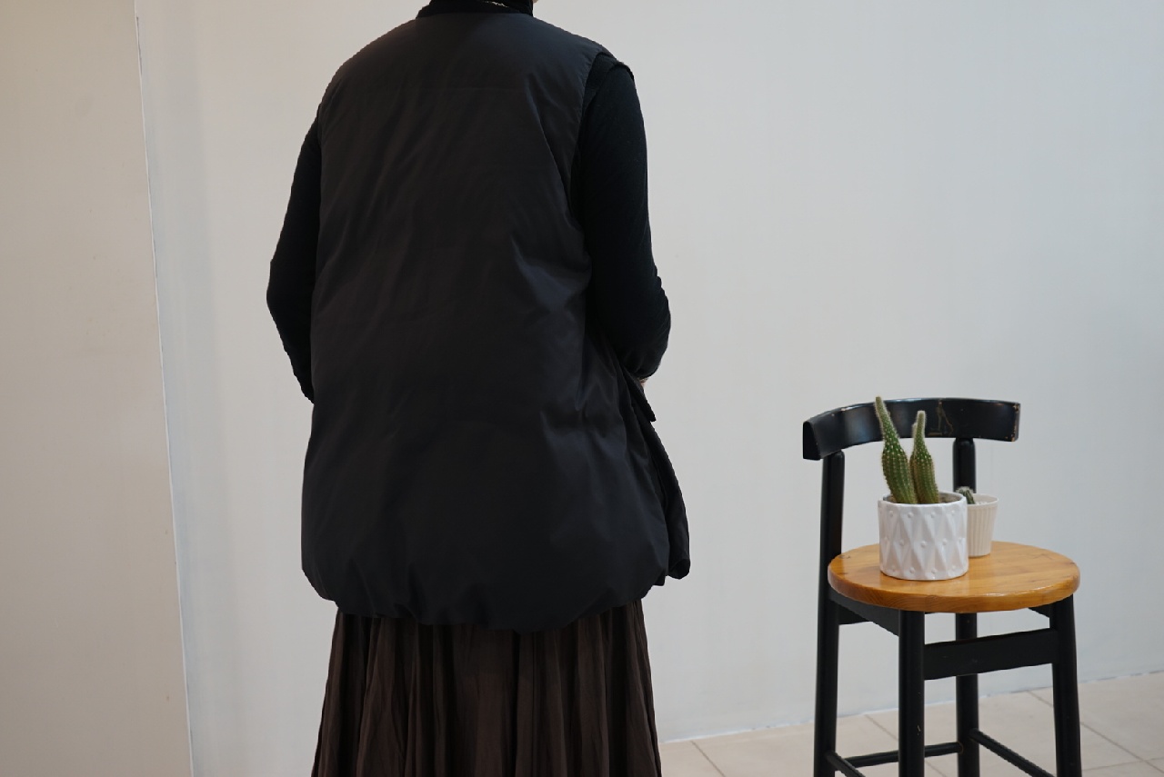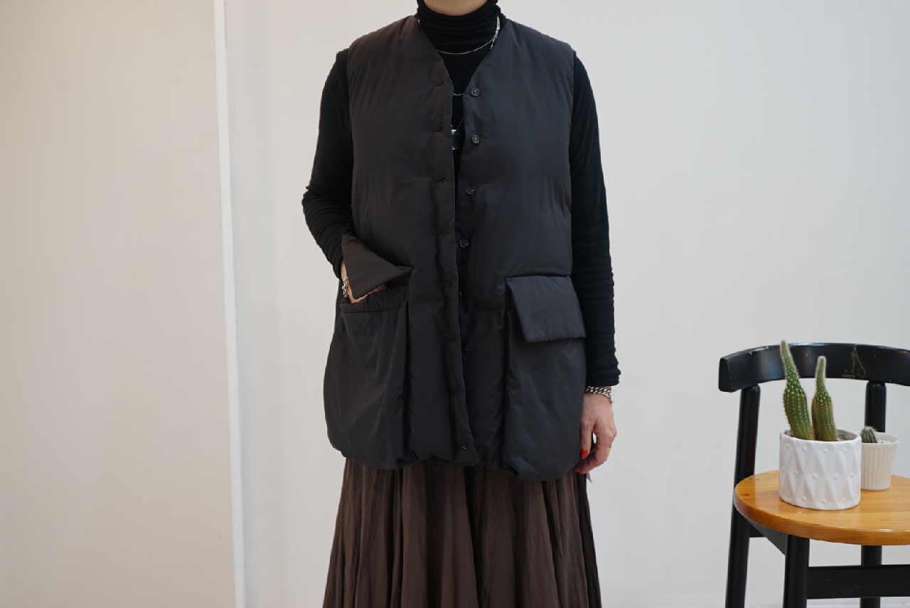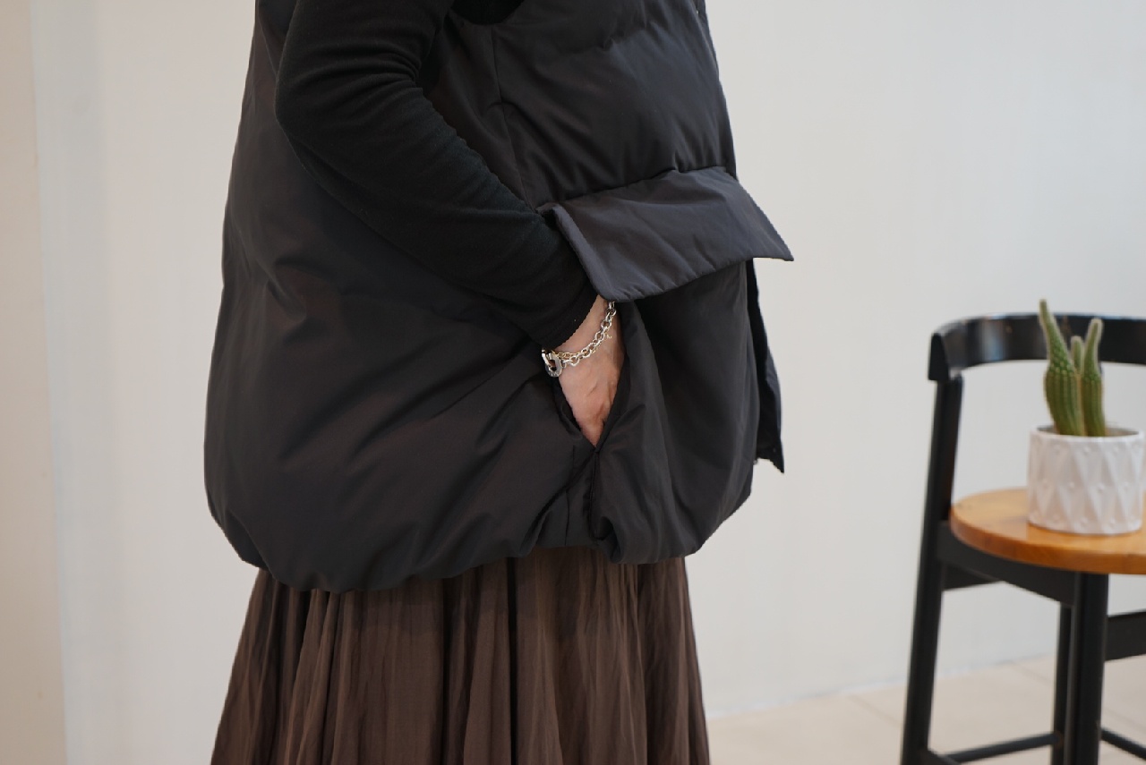 大きなポケットが特徴のダウンベストです。フロントポケットとは別にサイドポケットもあるこだわりのデザイン。浅めのVネックからフロントボタン使用になっており裾にかけボリューム感のあるデザイン。裾のドロストコードを絞ると立体的なシルエットに。今期オススメのアイテムです。