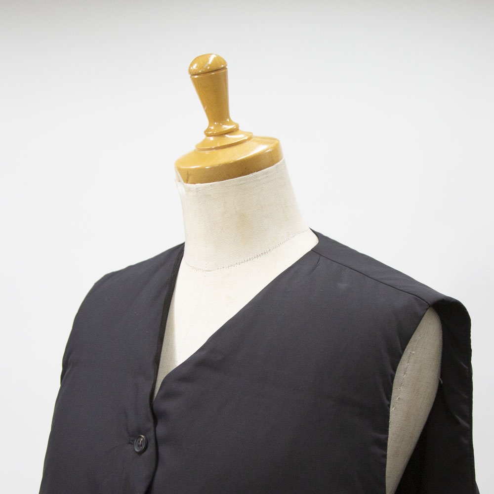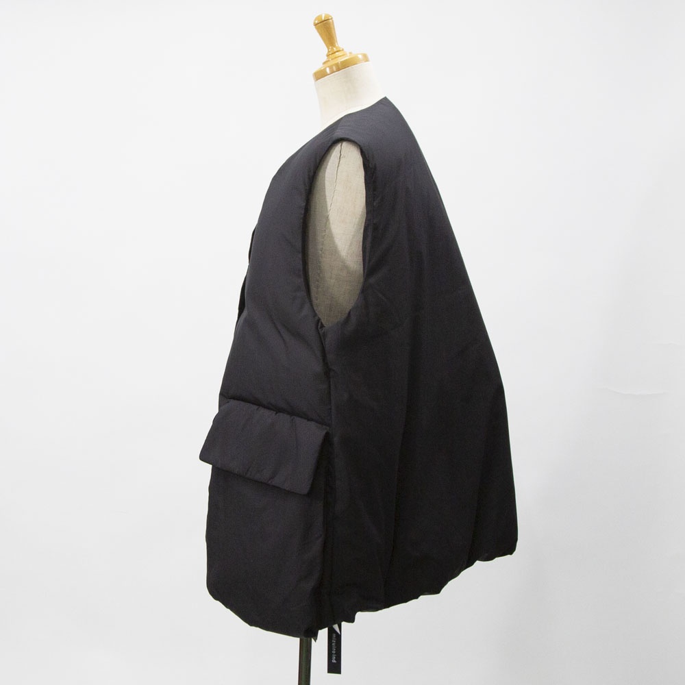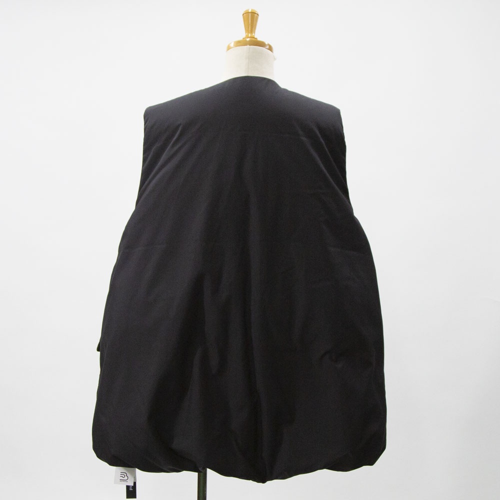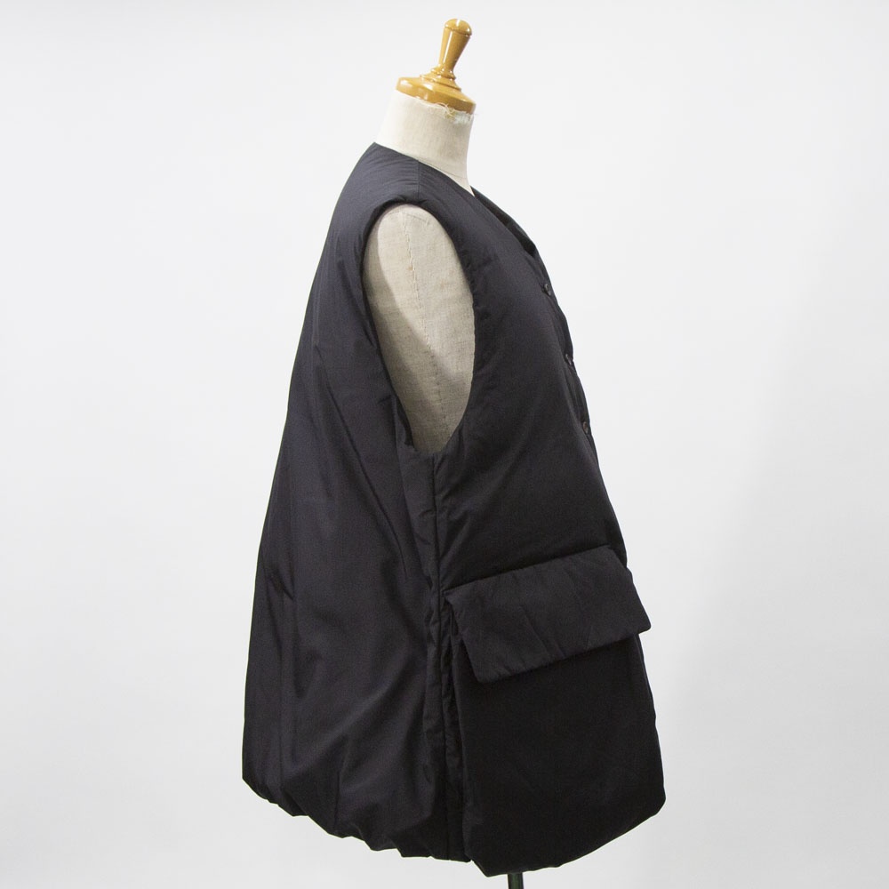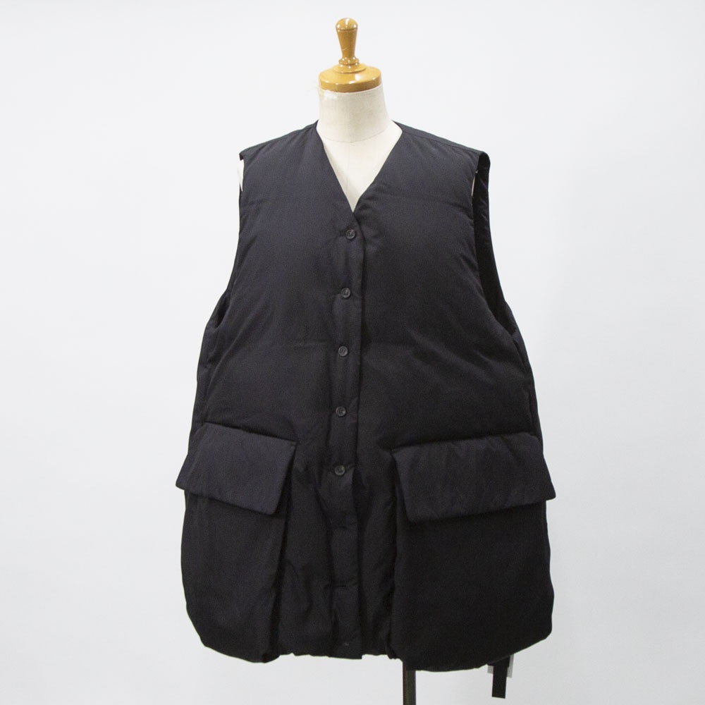 大きなポケットが特徴のダウンベストです。フロントポケットとは別にサイドポケットもあるこだわりのデザイン。浅めのVネックからフロントボタン使用になっており裾にかけボリューム感のあるデザイン。裾のドロストコードを絞ると立体的なシルエットに。今期オススメのアイテムです。