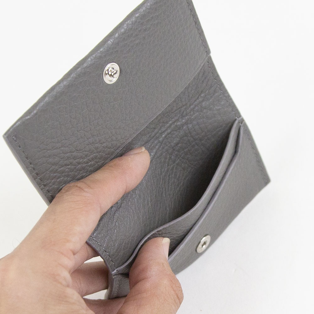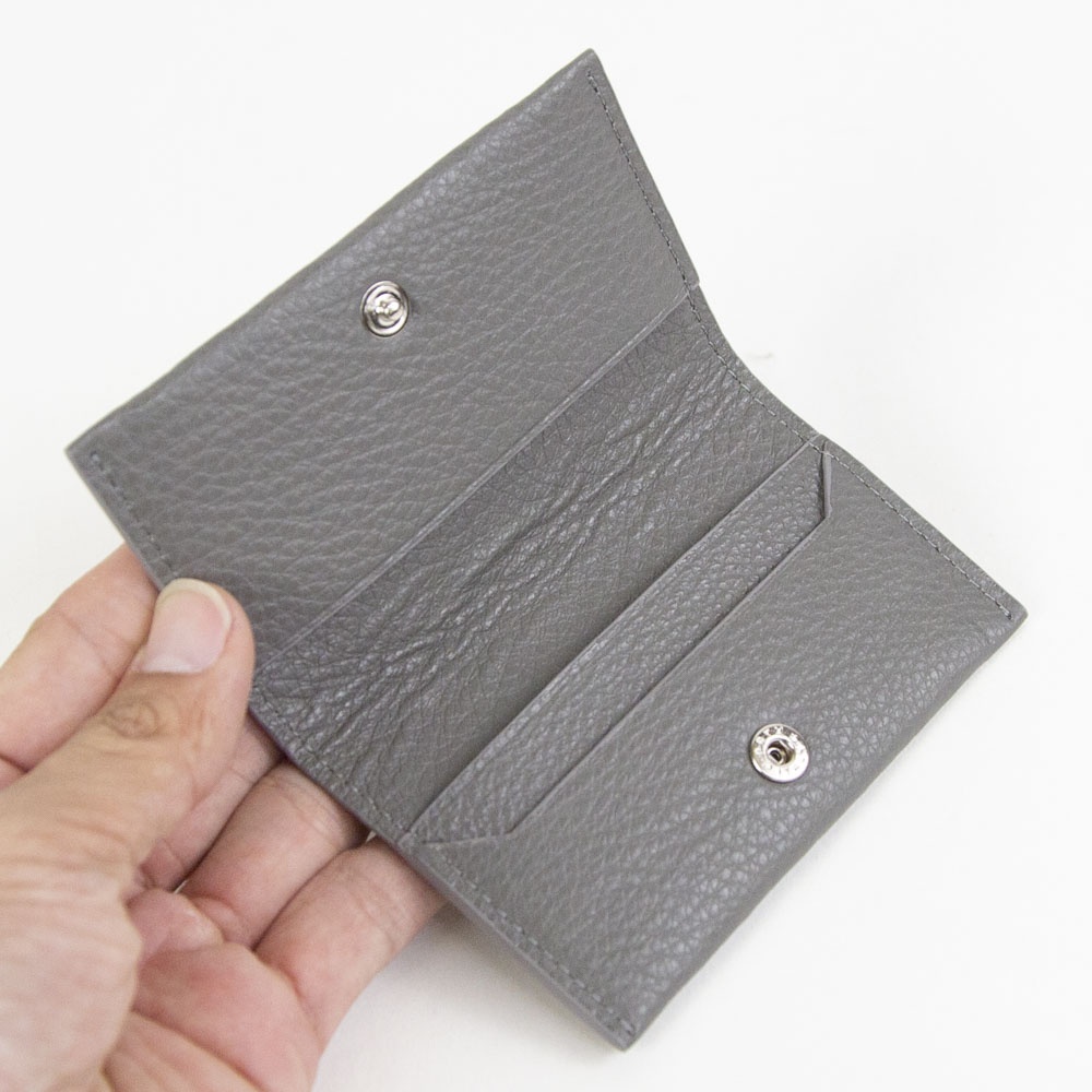 2025年秋冬新作 ソフトシュリンクレザーの薄型名刺入れ。 ジャケットの胸ポケットにもすっきり収まる、わずか約10mmの薄型デザイン。 10枚程度の名刺をスマートに収納でき、ビジネスシーンでの身だしなみを損なわないスリムさが魅力です。 上品なシボ感が特徴のソフトシュリンクレザーは、経年変化を気にせずに、美しい状態を長くキープ。 ベーシックなカラーバリエーションは、どんなスタイルにも自然に馴染み、ギフトとしても喜ばれるアイテムです。