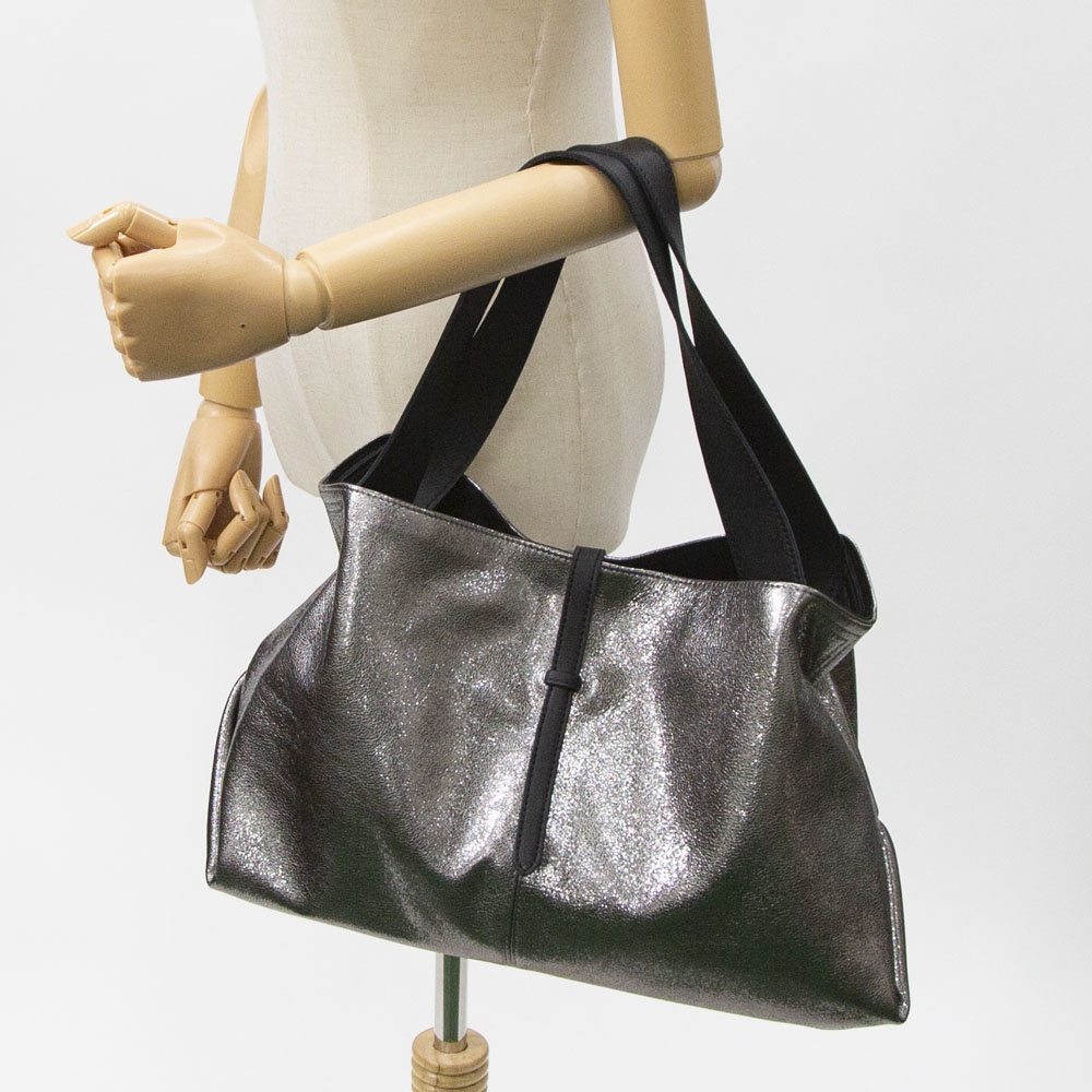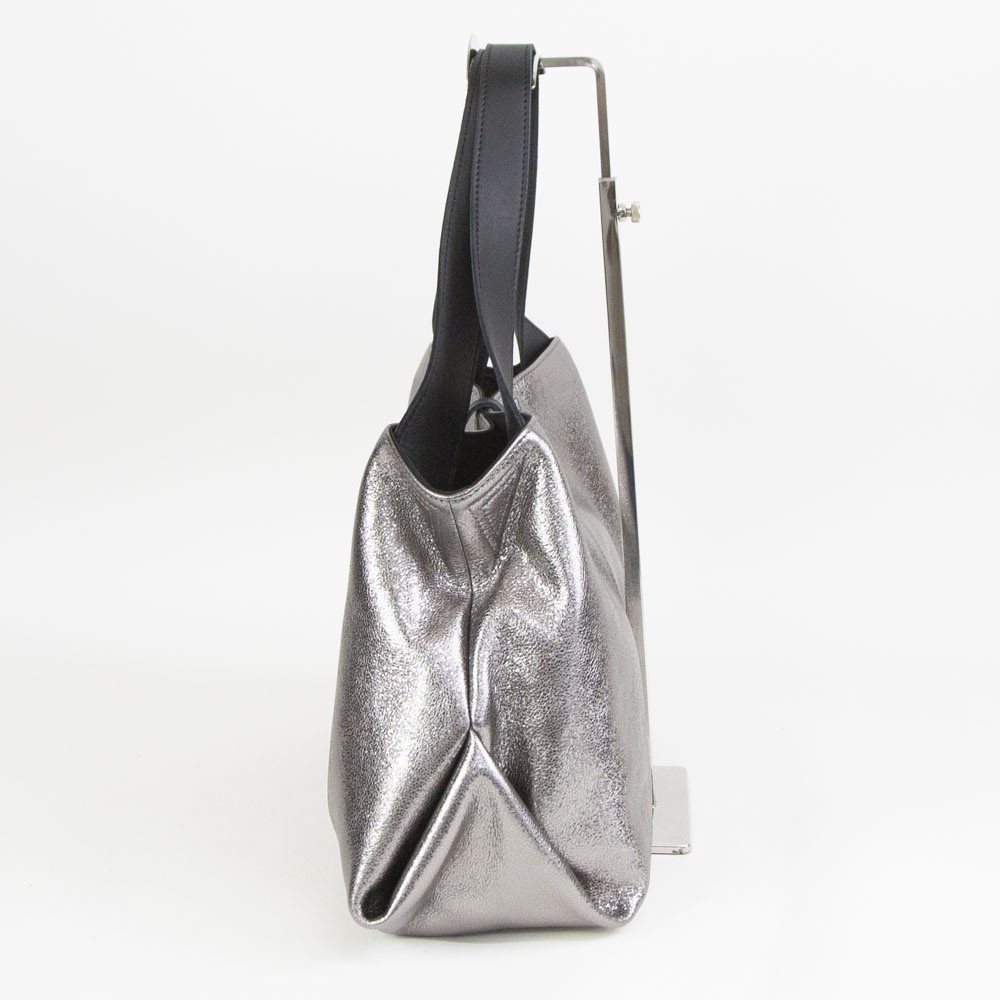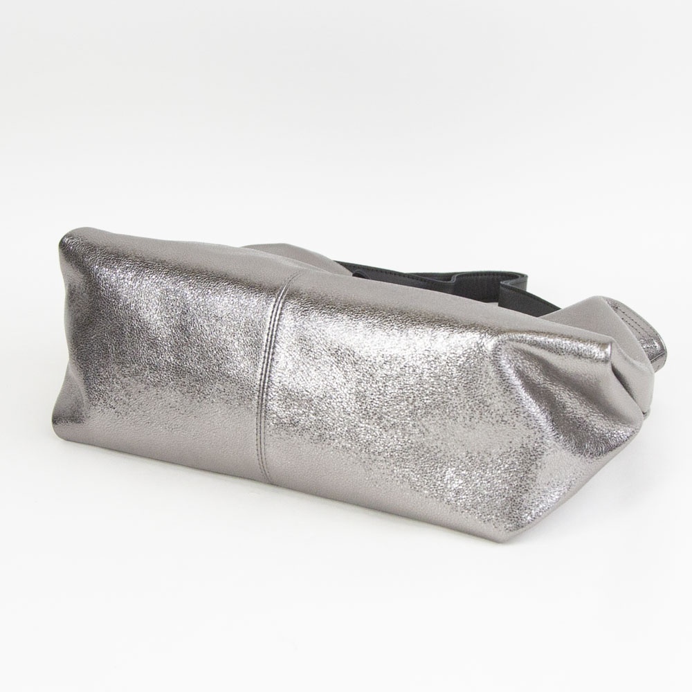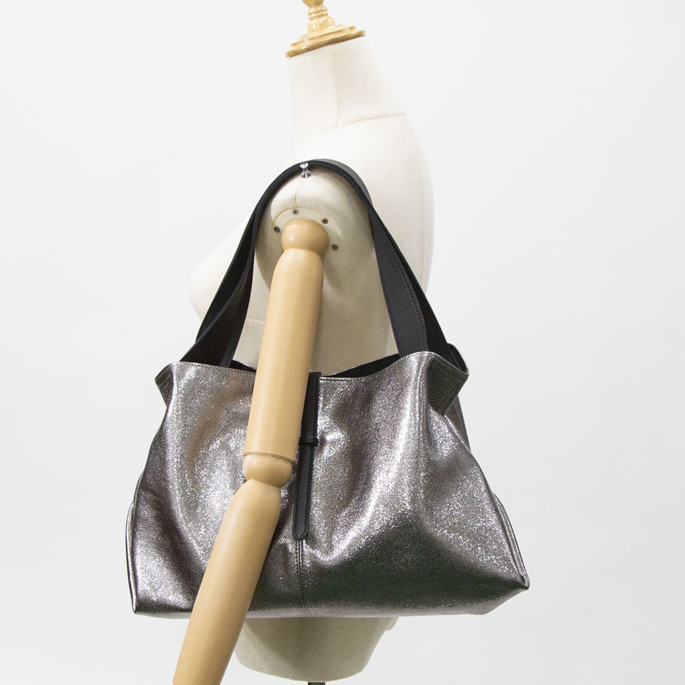 ギラギラとしたメタリックではなく、シックで落ち着きのあるシルバーカラーです付属にはブラックレザーを使用することにより、メタリックカラーとのコンビネーションがモード感を演出します。自然なシボによる表面の起伏によって箔の光沢も不均一で表情豊かに変化し、使い続けると箔の表面が次第に擦れ、革の地肌が透けるように見えてくる独特なエイジングを楽しむことができます。