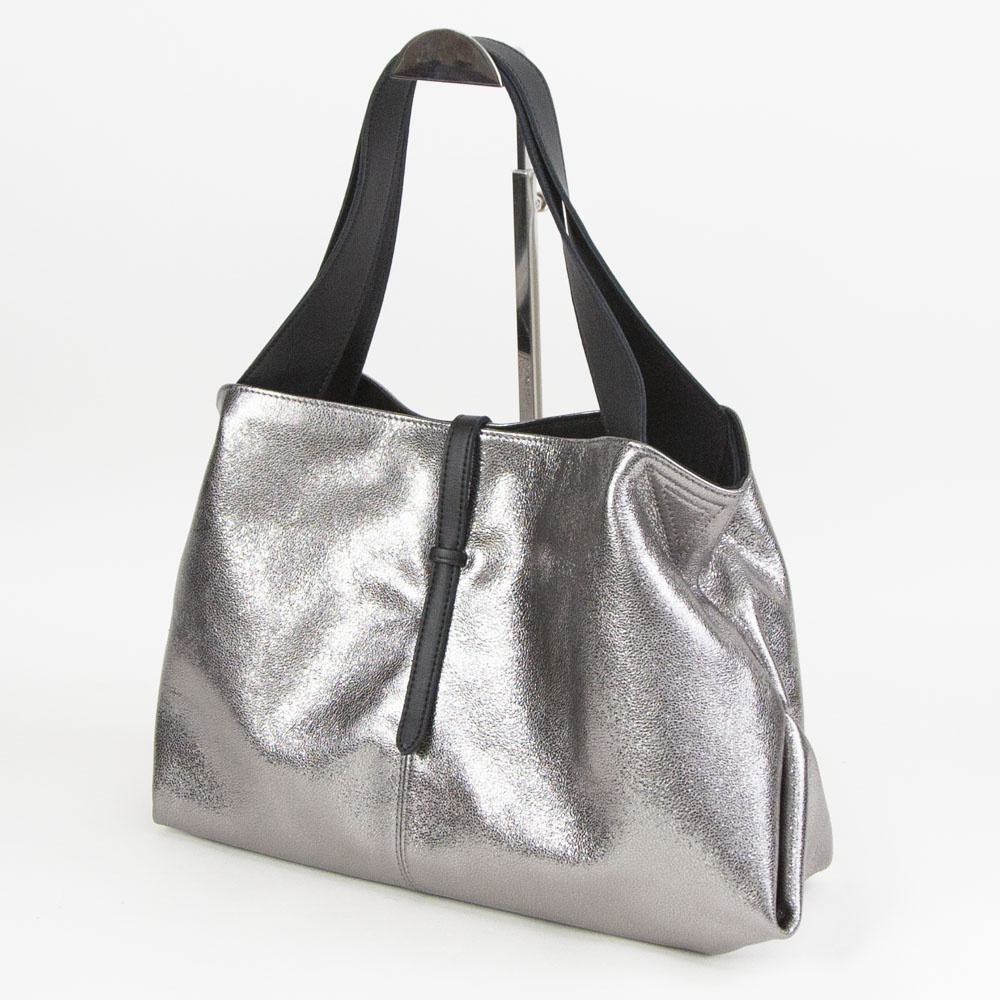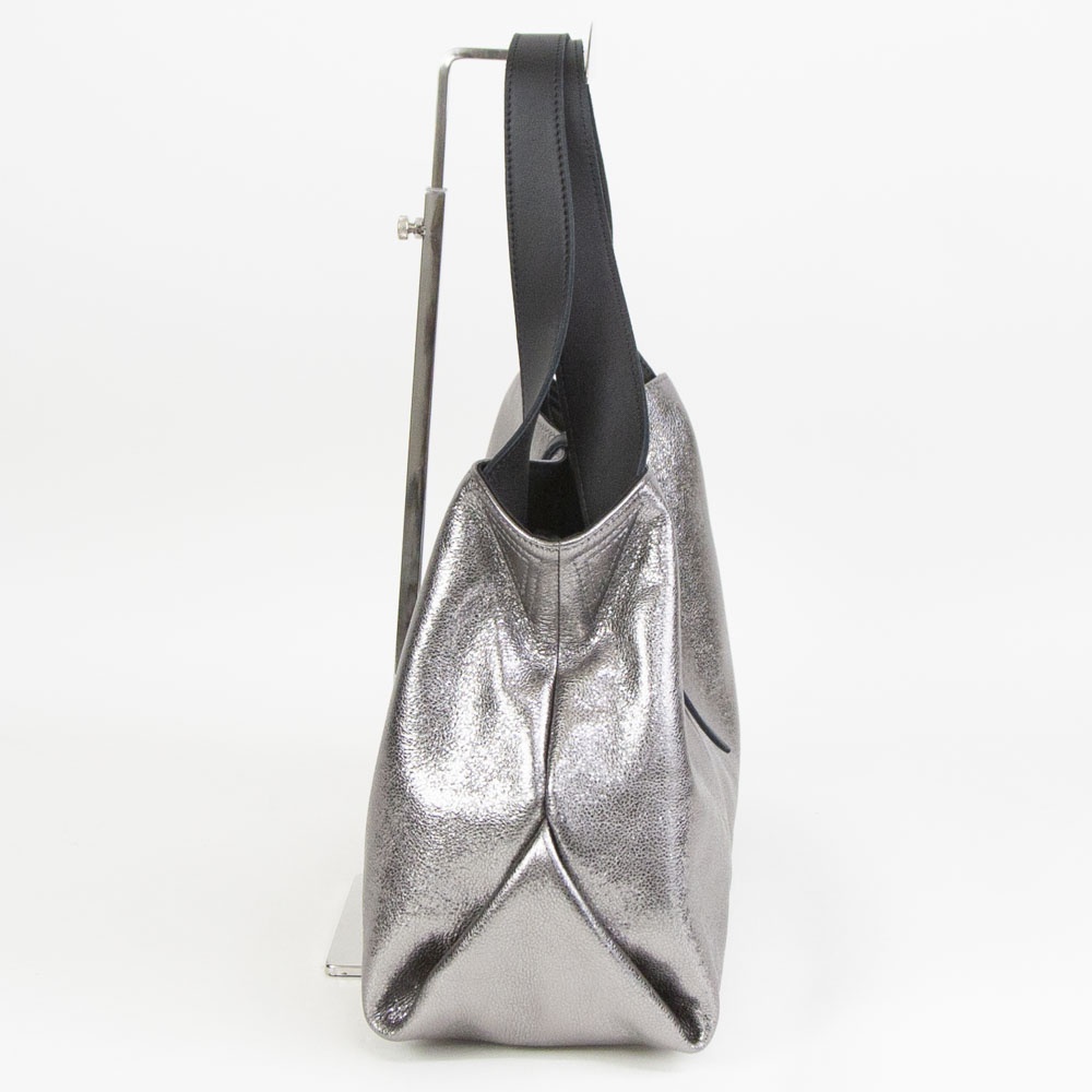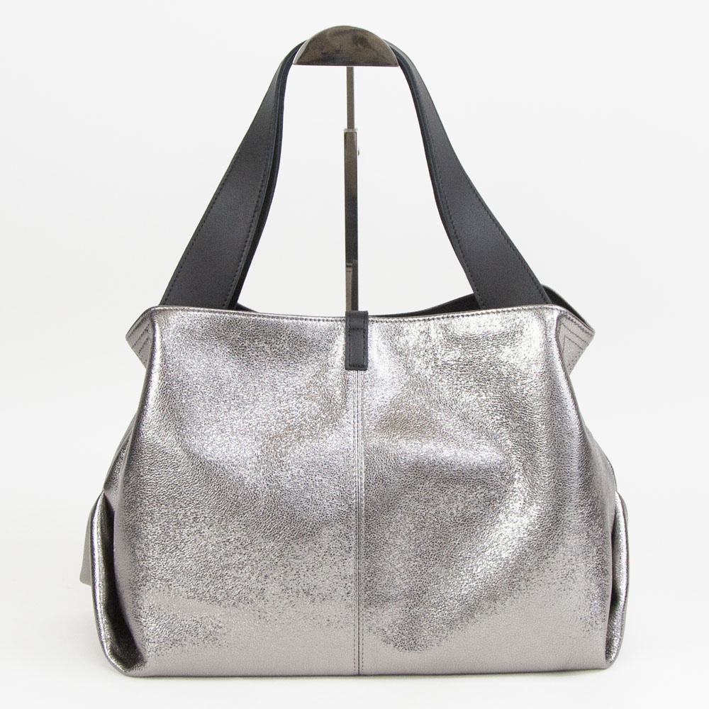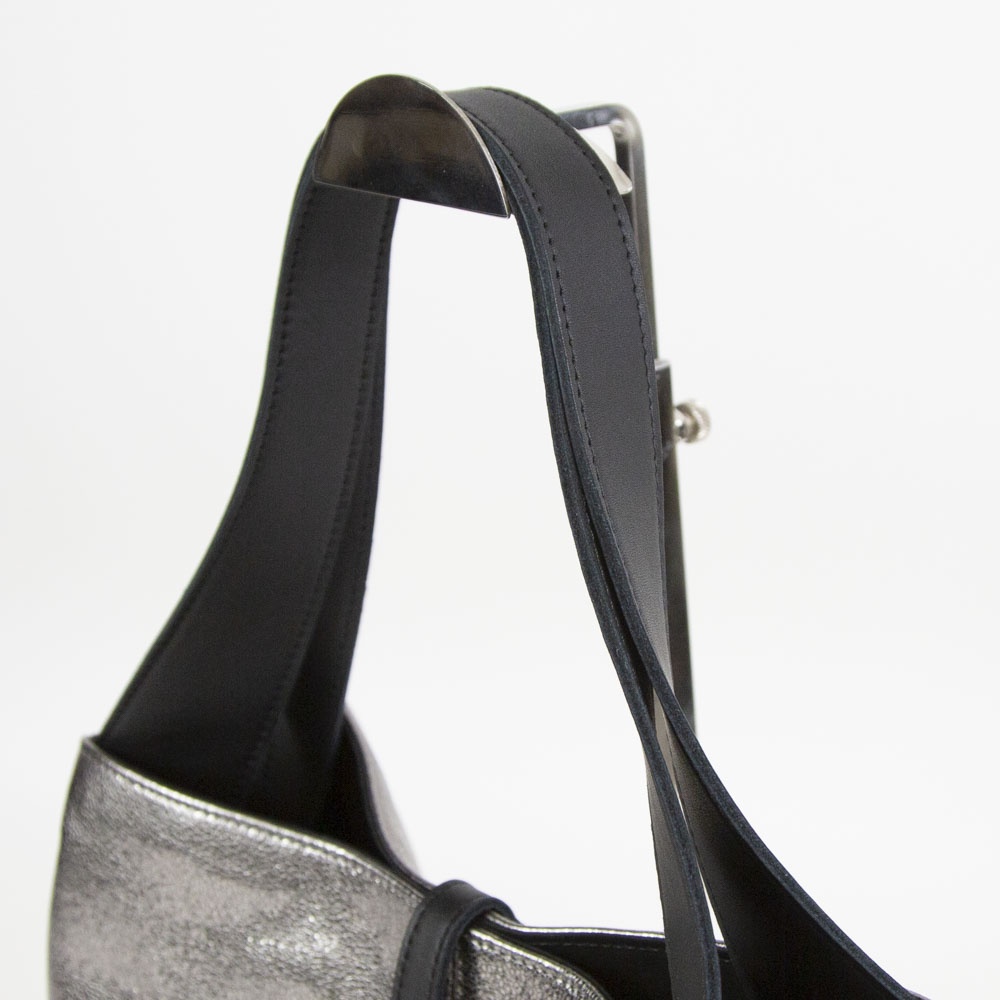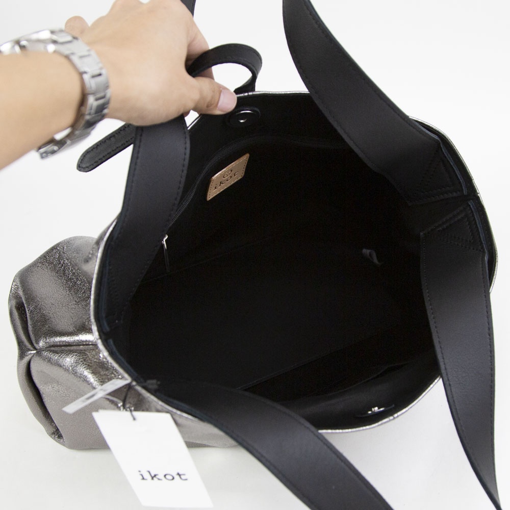 ギラギラとしたメタリックではなく、シックで落ち着きのあるシルバーカラーです付属にはブラックレザーを使用することにより、メタリックカラーとのコンビネーションがモード感を演出します。自然なシボによる表面の起伏によって箔の光沢も不均一で表情豊かに変化し、使い続けると箔の表面が次第に擦れ、革の地肌が透けるように見えてくる独特なエイジングを楽しむことができます。