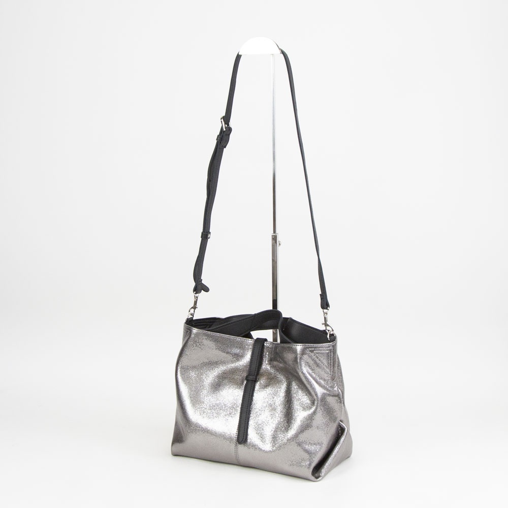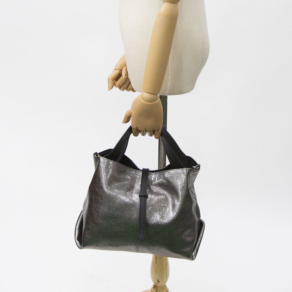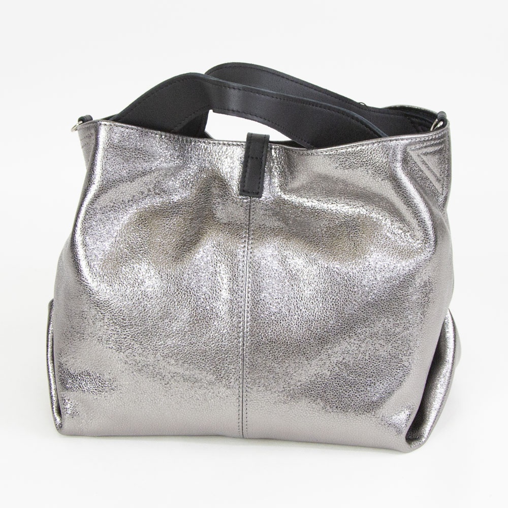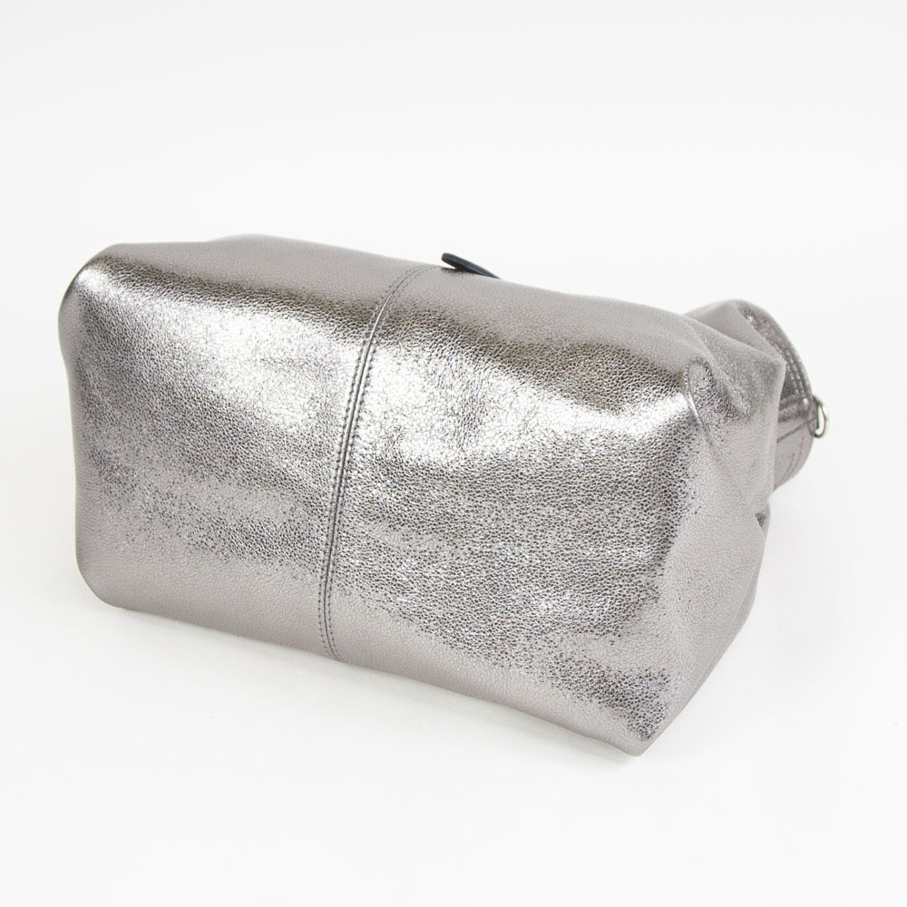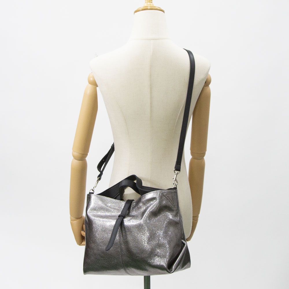 ギラギラとしたメタリックではなく、シックで落ち着きのあるシルバーカラーです付属にはブラックレザーを使用することにより、メタリックカラーとのコンビネーションがモード感を演出します。自然なシボによる表面の起伏によって箔の光沢も不均一で表情豊かに変化し、使い続けると箔の表面が次第に擦れ、革の地肌が透けるように見えてくる独特なエイジングを楽しむことができます。