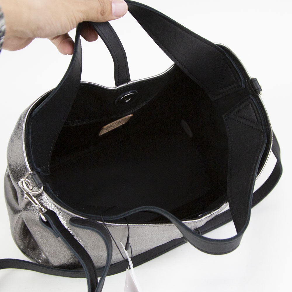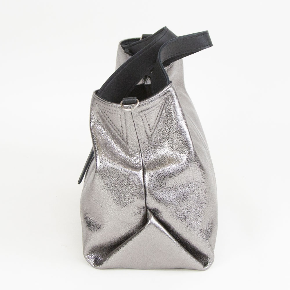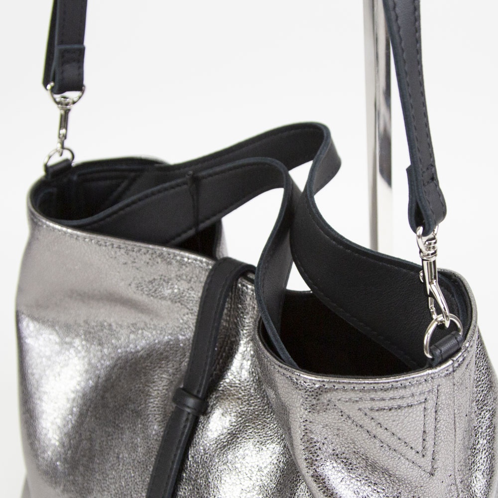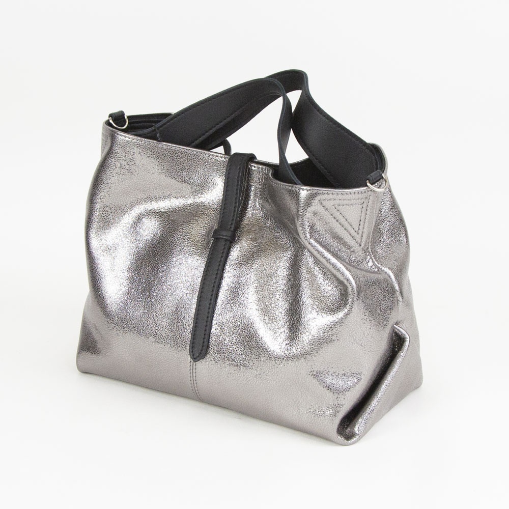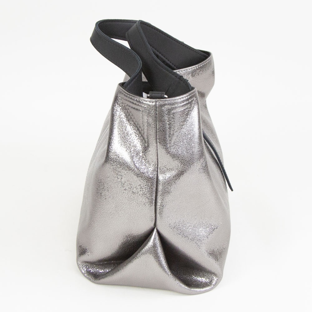ギラギラとしたメタリックではなく、シックで落ち着きのあるシルバーカラーです付属にはブラックレザーを使用することにより、メタリックカラーとのコンビネーションがモード感を演出します。自然なシボによる表面の起伏によって箔の光沢も不均一で表情豊かに変化し、使い続けると箔の表面が次第に擦れ、革の地肌が透けるように見えてくる独特なエイジングを楽しむことができます。