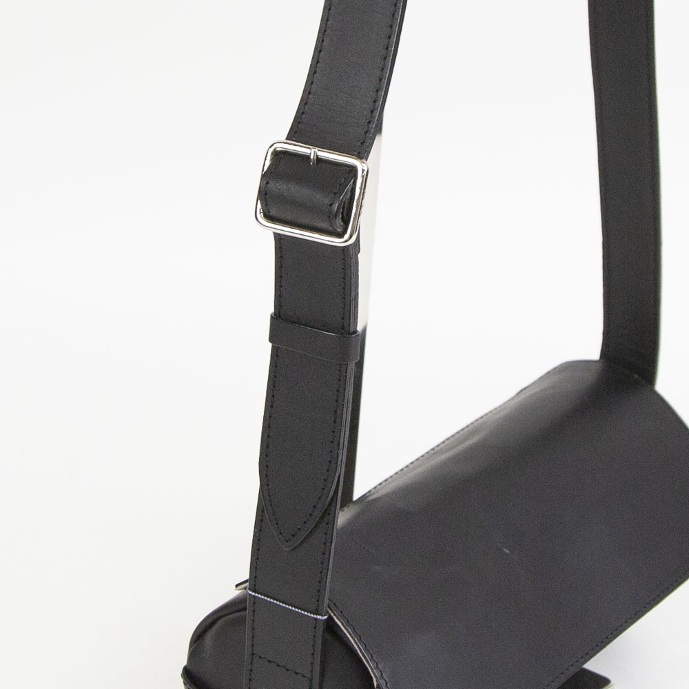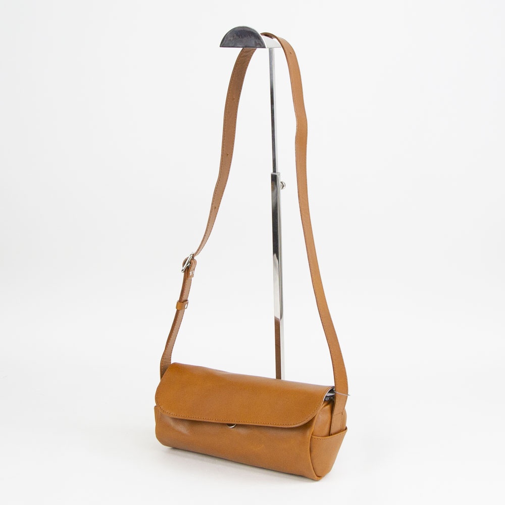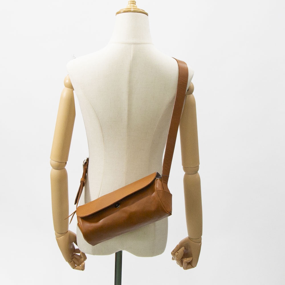 きめ細やかな牛革キップを使用したチューブ型のショートフラップショルダーです。ショルダーストラップは7段階の調節が可能で斜め掛けも可能です。フラップをめくるとファスナーがついているのでボディーバッグのように背負うように持っても中身が落ちることはありません。フラップ部分はずれないようにマグネットがついています。見た目以上の容量があり、折財布、ポーチ、コインケース、眼鏡ケース、カードケースと必要なものはすべて収納可能です。