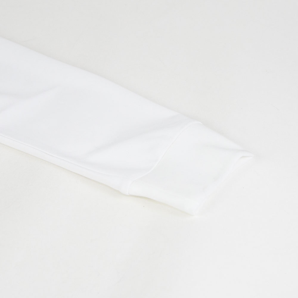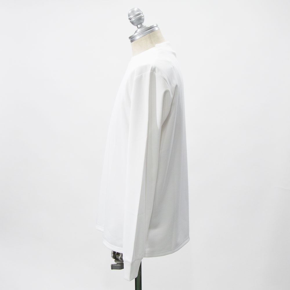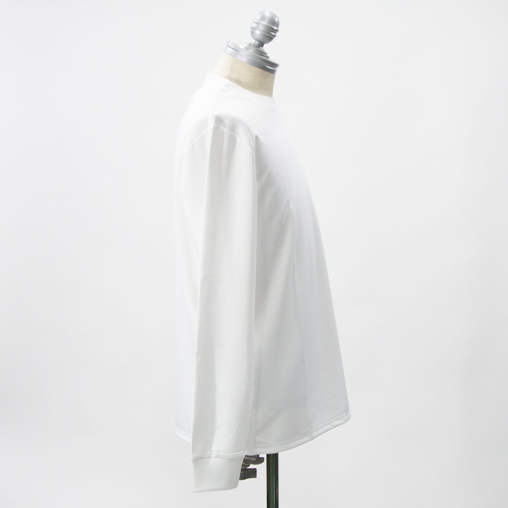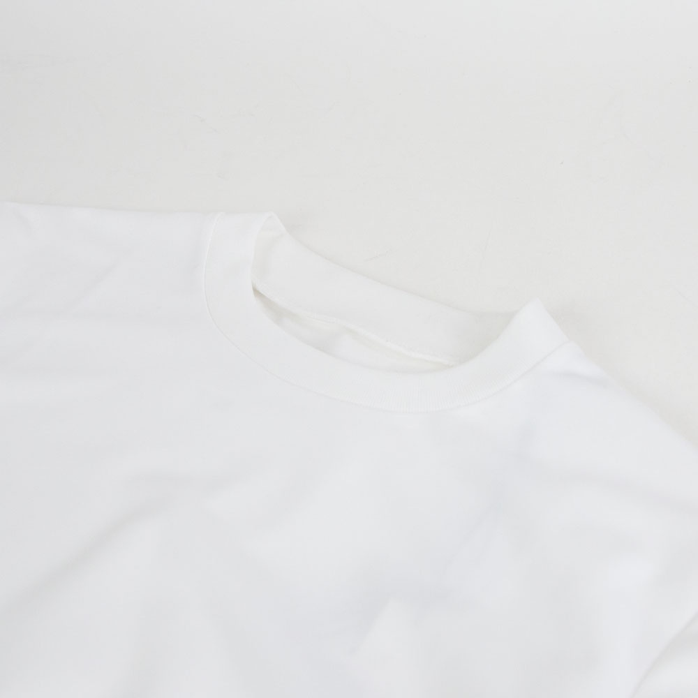 ジャケットとの重ね着を意識したクルーネックデザイン。首回りの後ろ衿を通常より高めに設計(衿腰高)することで、上着を羽織った際に肌や生地の当たりを軽減します。身幅はナチュラルフィットで程よくゆとりを持たせ、袖口は薄手のフライスで引き締め。アウターの袖口からチラリと見えても美しい仕上がりです。