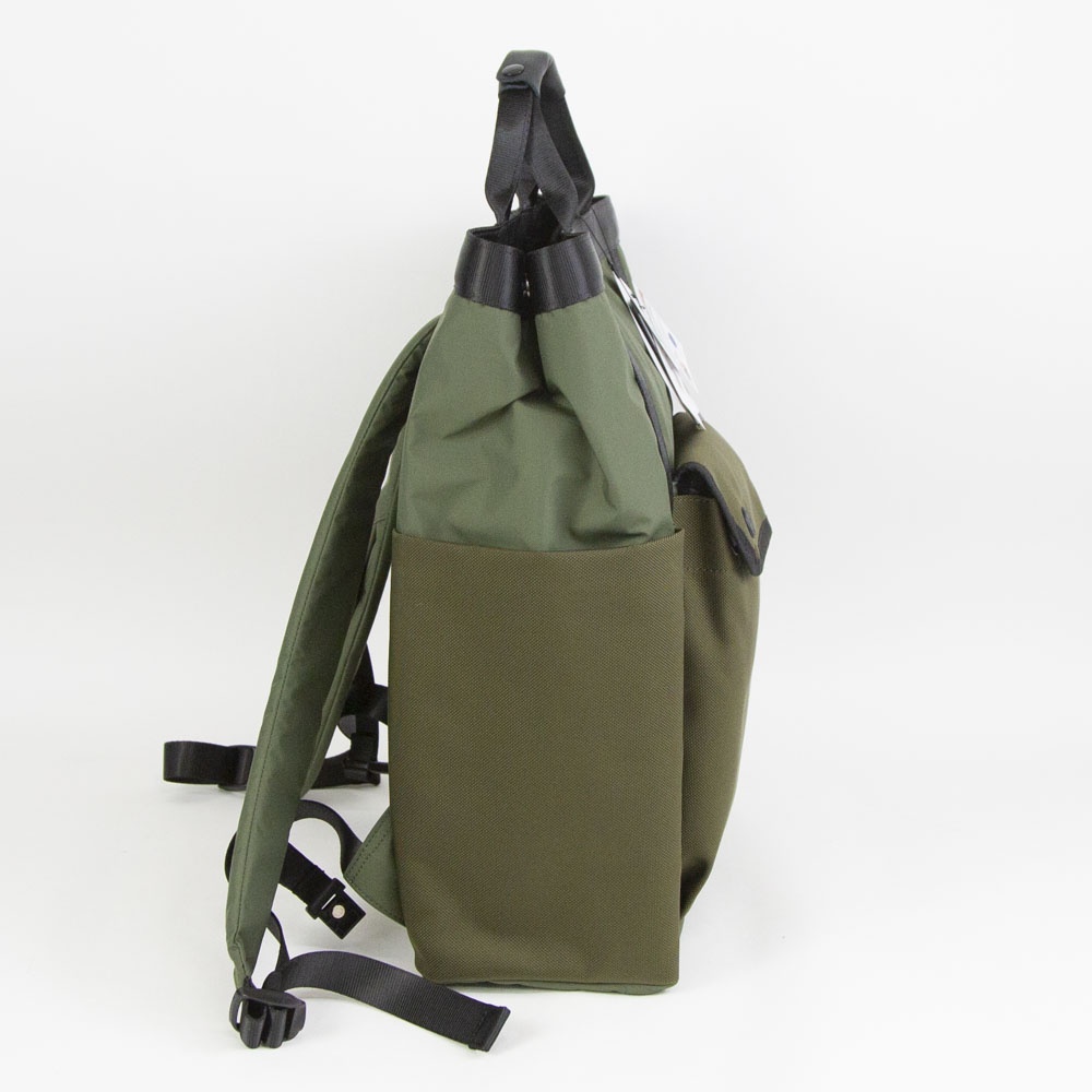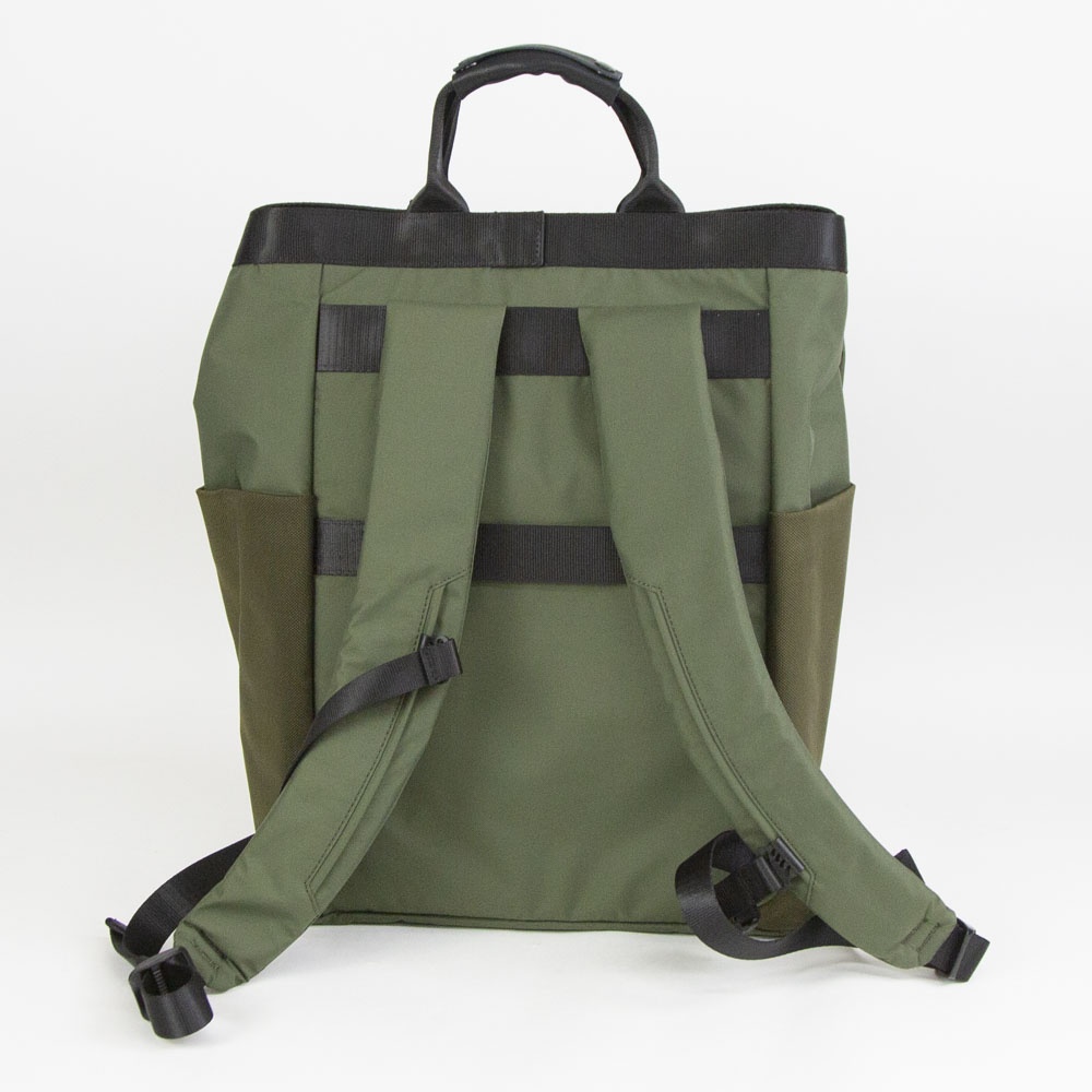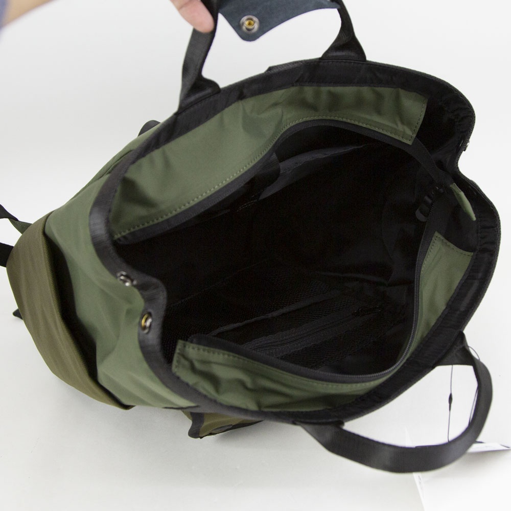 フィドロックのマグネットパーツを使用したフロントポケットと、ボディーの素材が切り替えが特徴のデザインのバックパックです。 リュックとして、トートとしても使用ができます。背面には位置調整可能なチェストベルトがあります。 フロントポケットはパーツを下へずらすと開けることができ、閉める際はそのまま楽にはめ込むことができます。