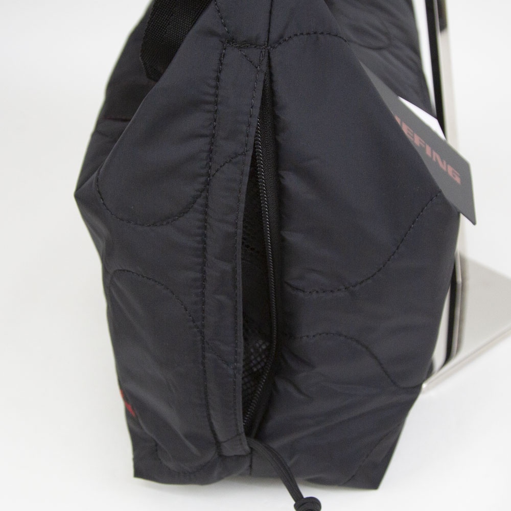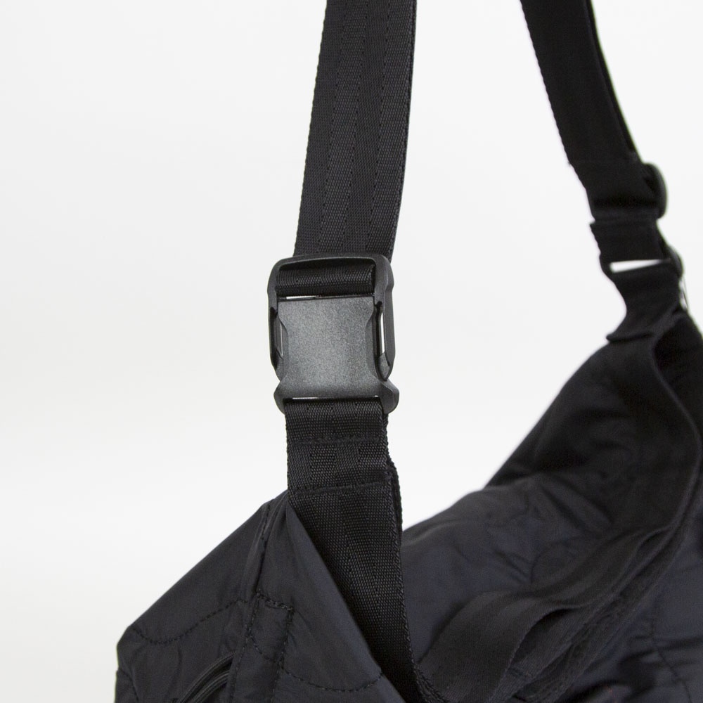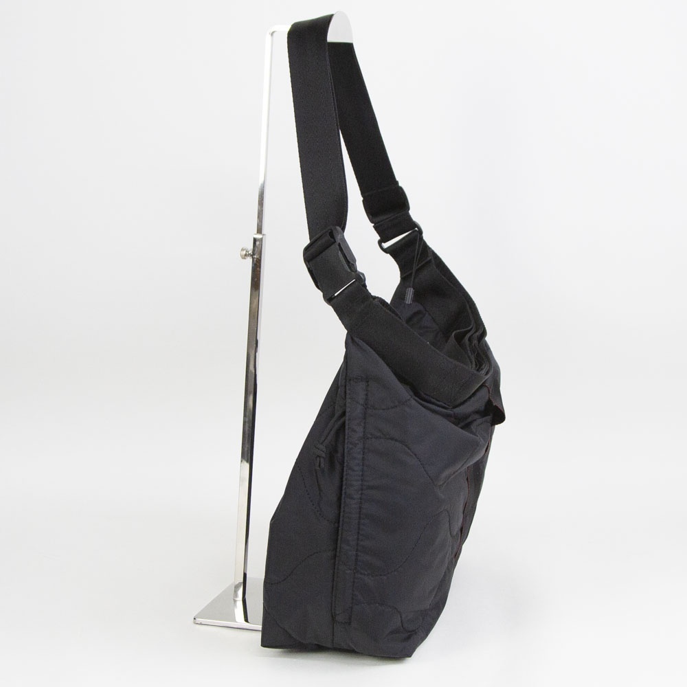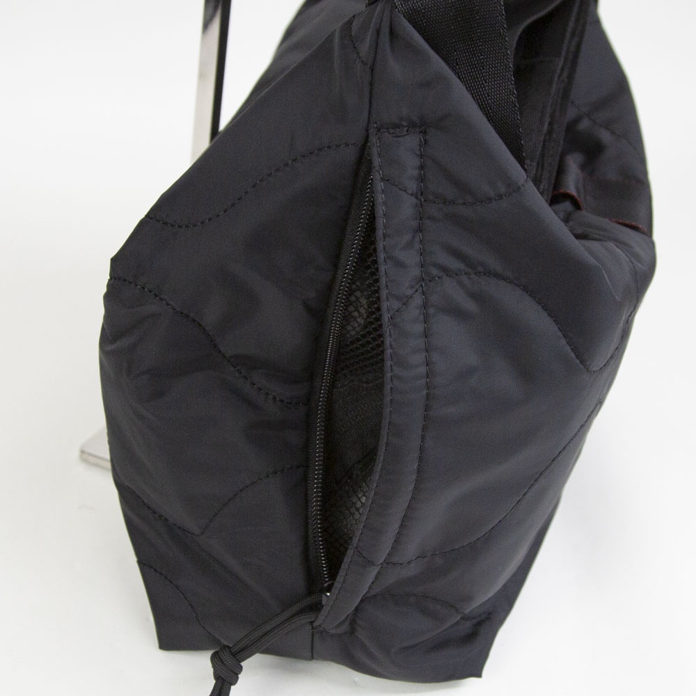 キルティングナイロンを使用したアイテムが新登場。 ショルダー根元がバックルタイプで長さを短めにしていても着脱しやすい様になっています。 収納口に持ち手を備えているので2WAYでも使用できます。 二つある内ポケットは内外どちらからでもアクセスできる面白い作りになっています。