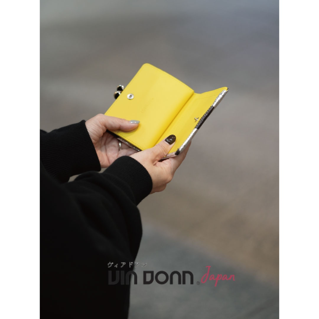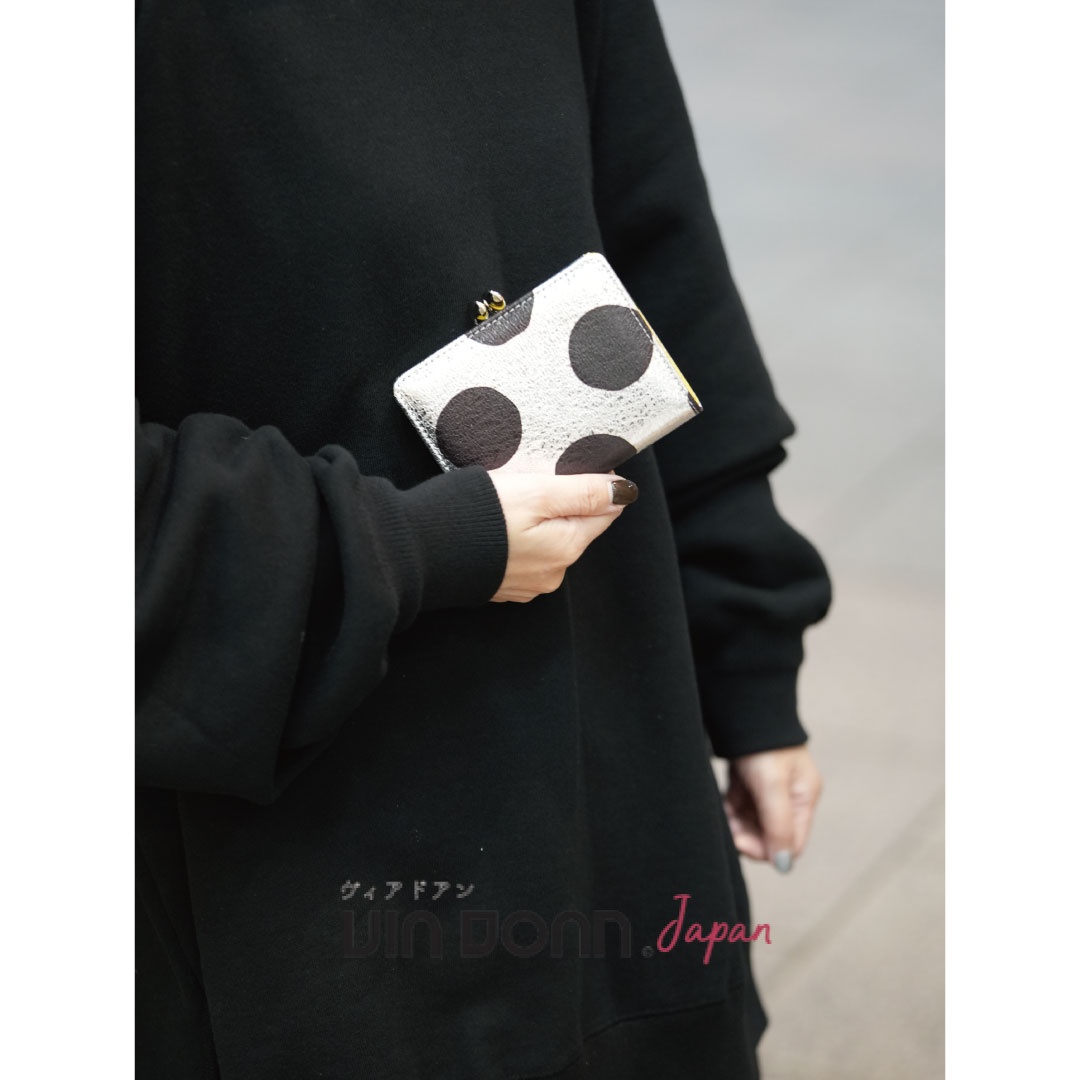 キラキラ輝くシルバーに手描き風のドットとビビッドなイエローの差し色が目を惹くシリーズになります。 二層のガマ口や縦横に配置されたカードポケットで区分けもしやすい作りになっています。