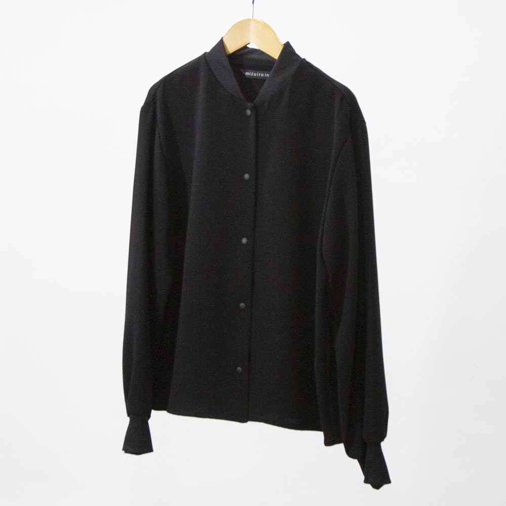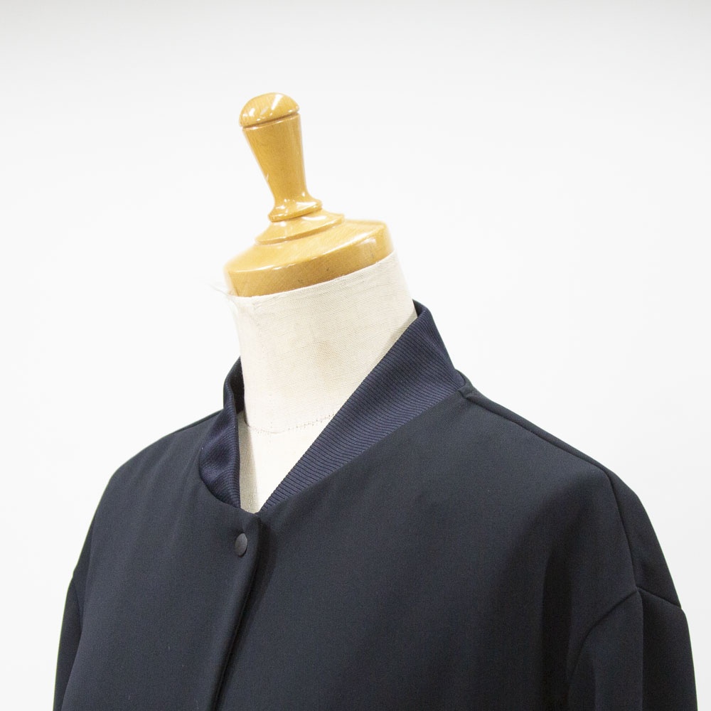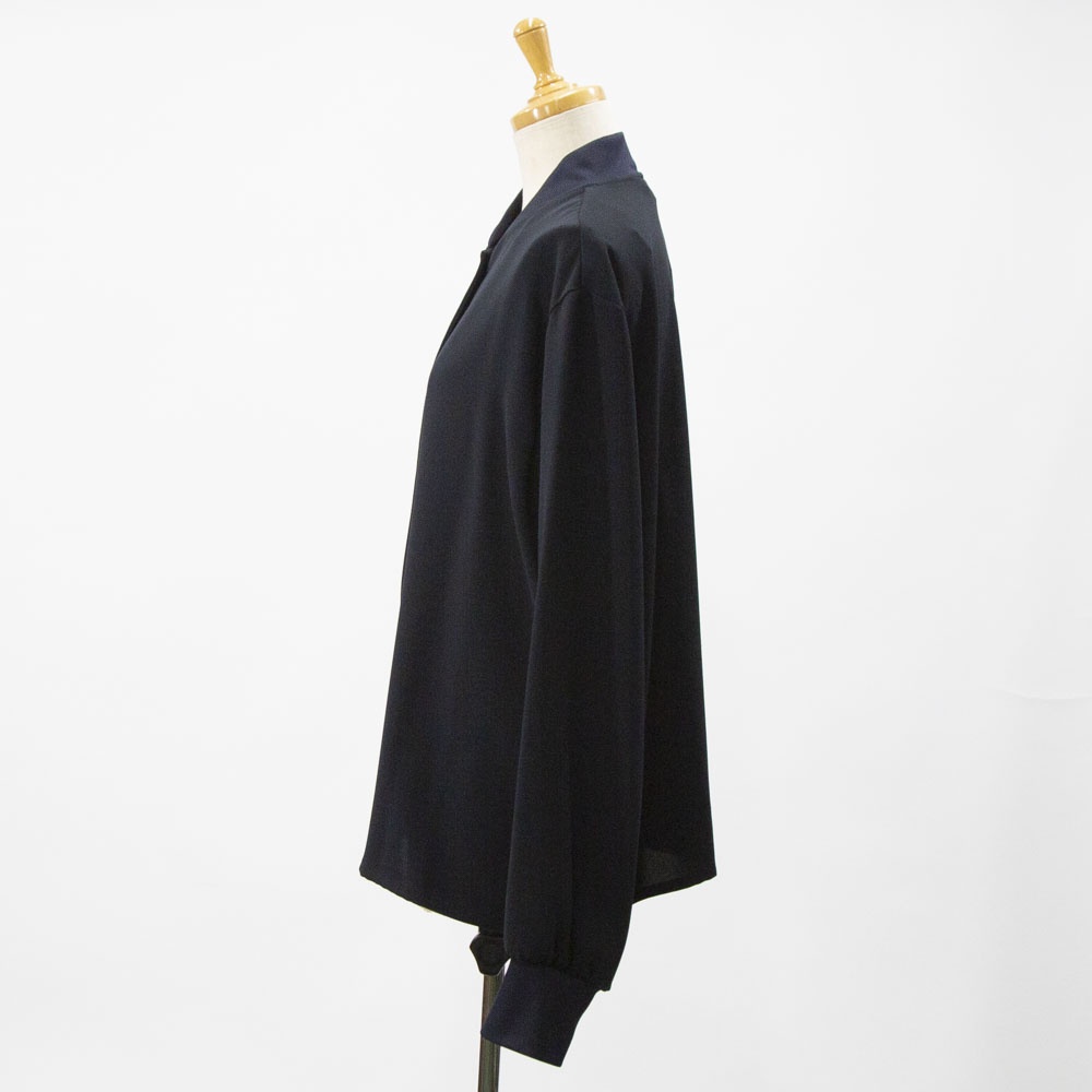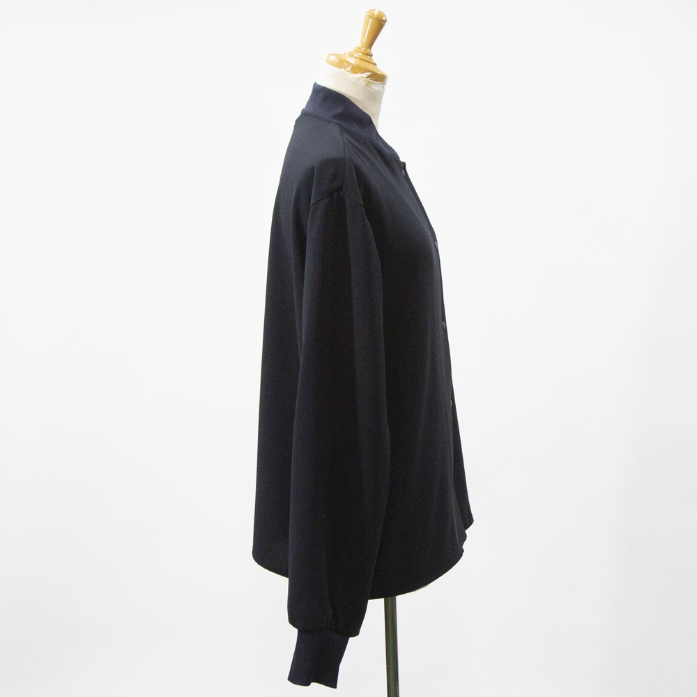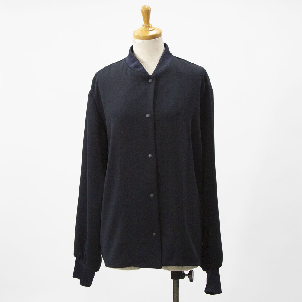 ドレープ感のあるポリエステル素材のブルゾンライクシャツです。首元と袖口をリブ使いにした薄手のジャケット。サラッとした生地感なので上品な一枚。フロントボタンは同色のスナップボタンを使用。羽織っても素敵でレイヤードしやすいシャツです!