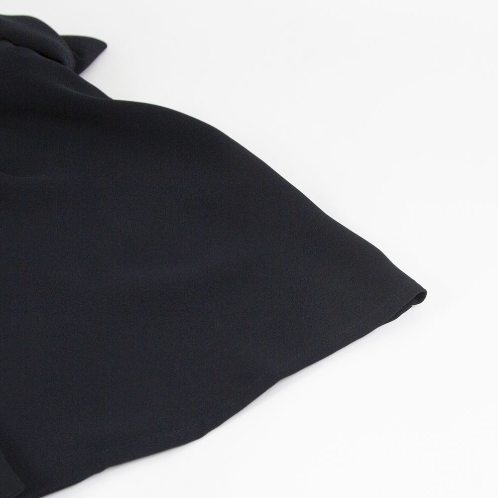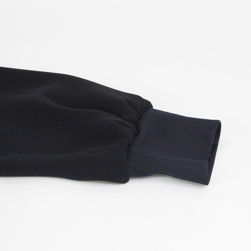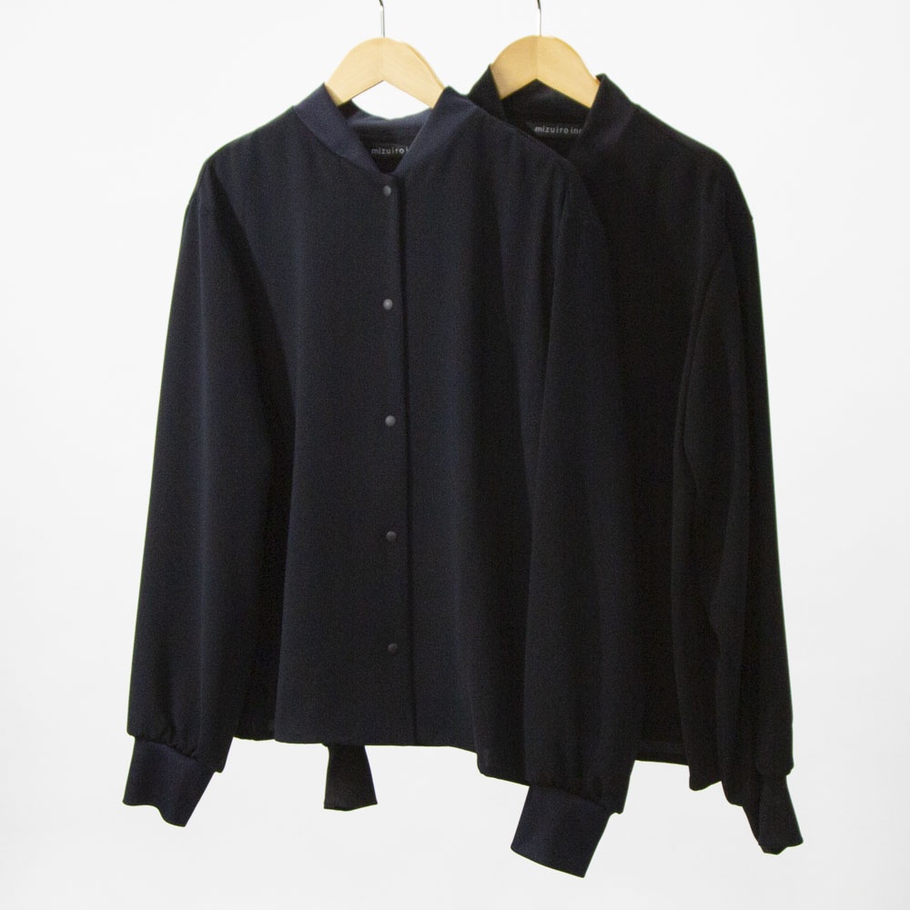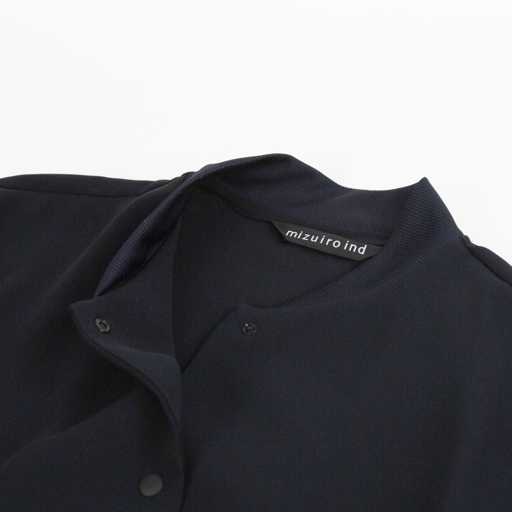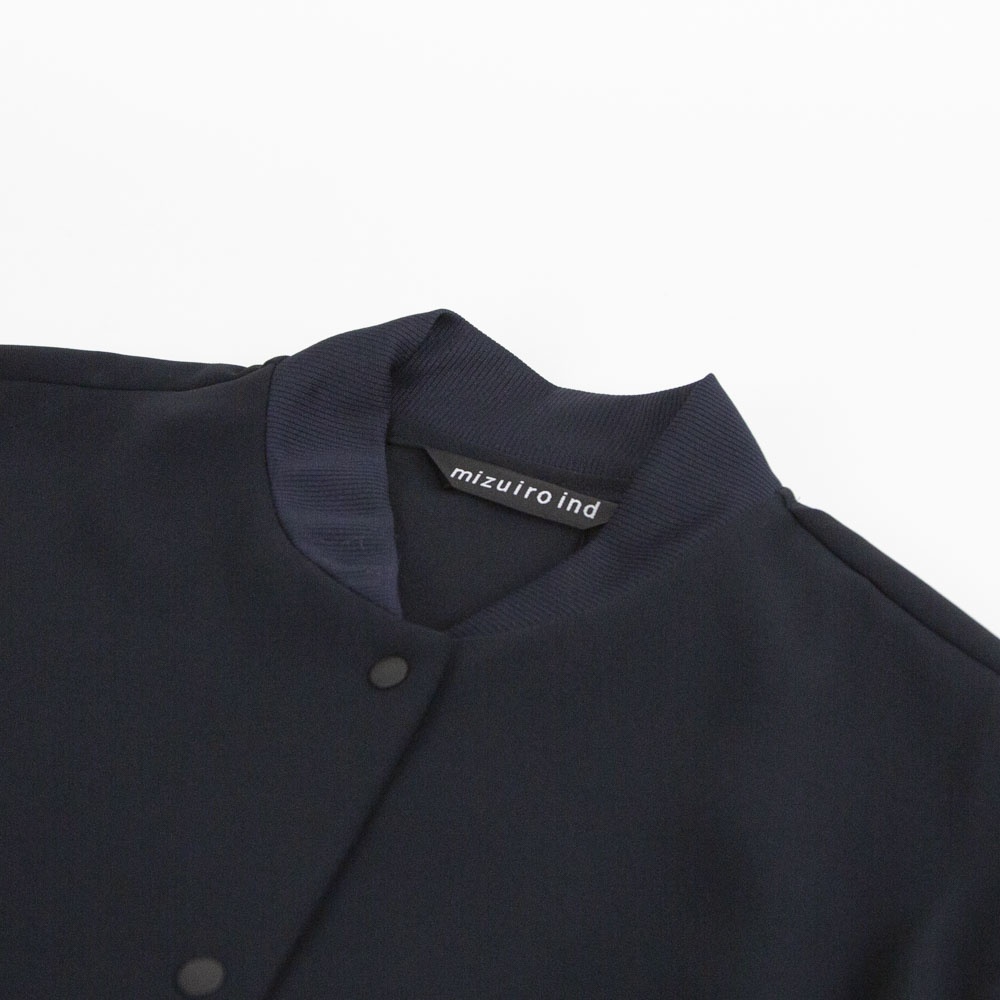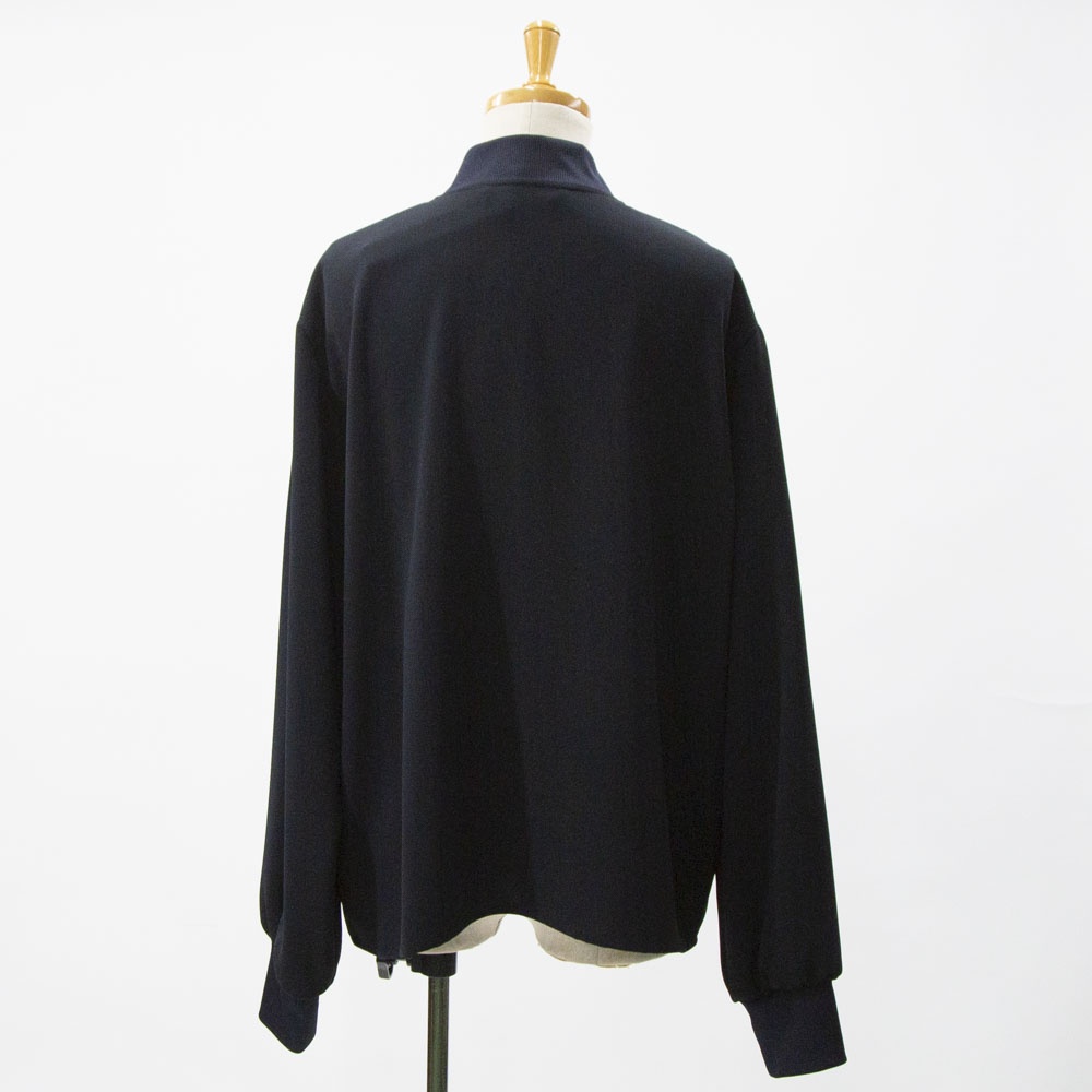 ドレープ感のあるポリエステル素材のブルゾンライクシャツです。首元と袖口をリブ使いにした薄手のジャケット。サラッとした生地感なので上品な一枚。フロントボタンは同色のスナップボタンを使用。羽織っても素敵でレイヤードしやすいシャツです!