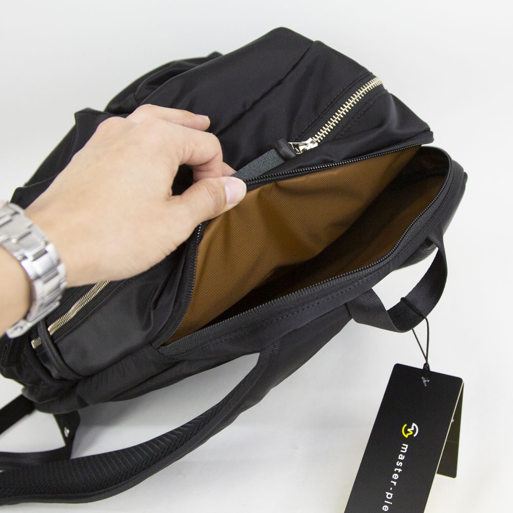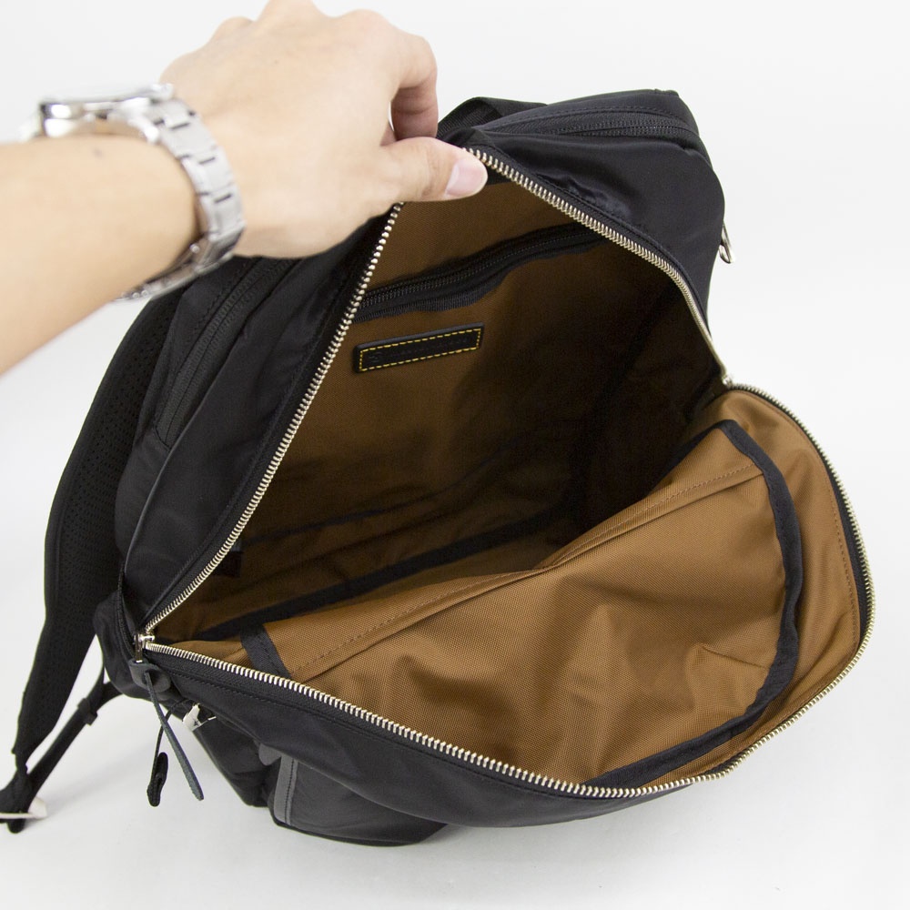 本体素材には、タテ糸に70d、ヨコ糸に210d のナイロンセミダル糸をインチ間でタテ275 本、ヨコ82 本の高密度で織り上げてハリ、コシを持たせた超高密度ナイロンツイルを使用しています。