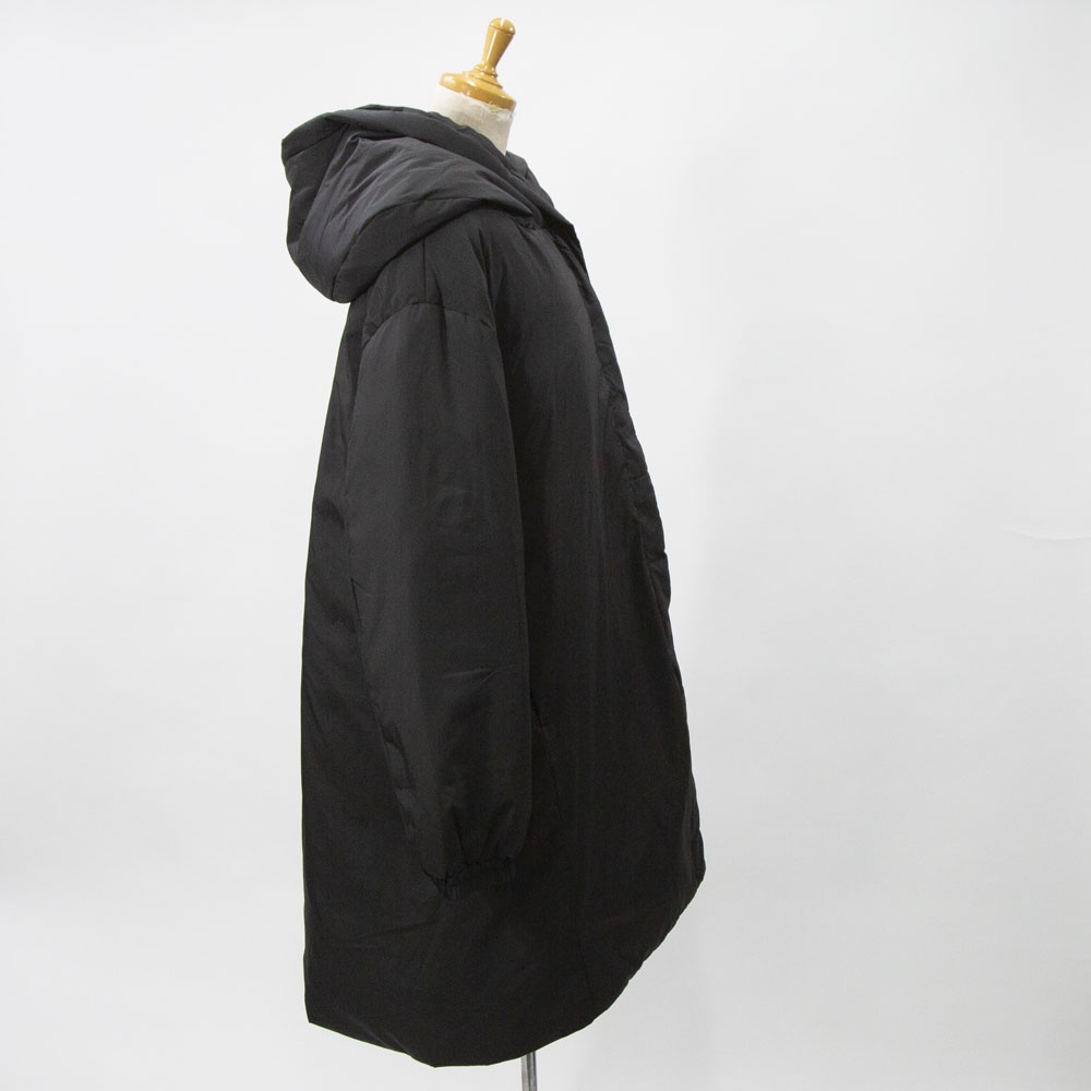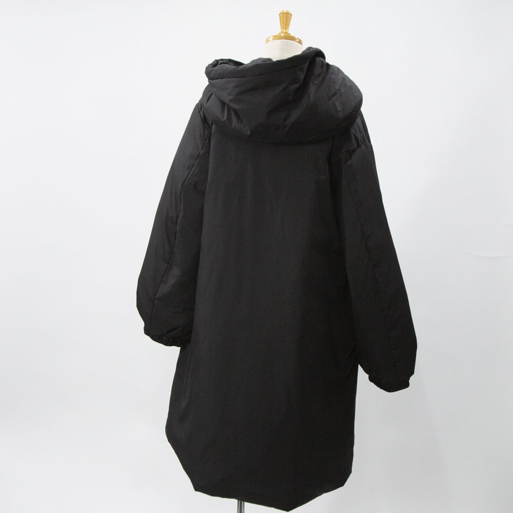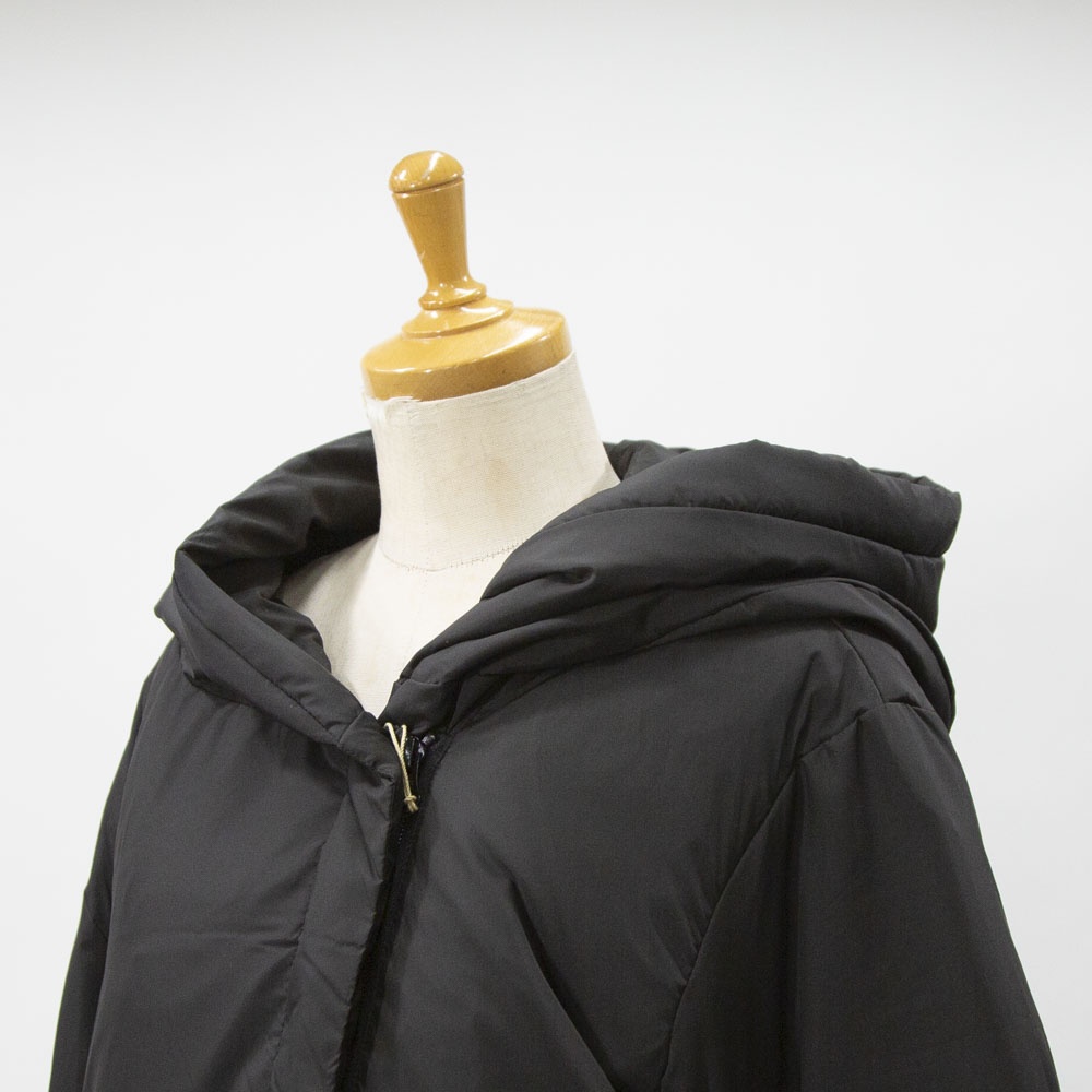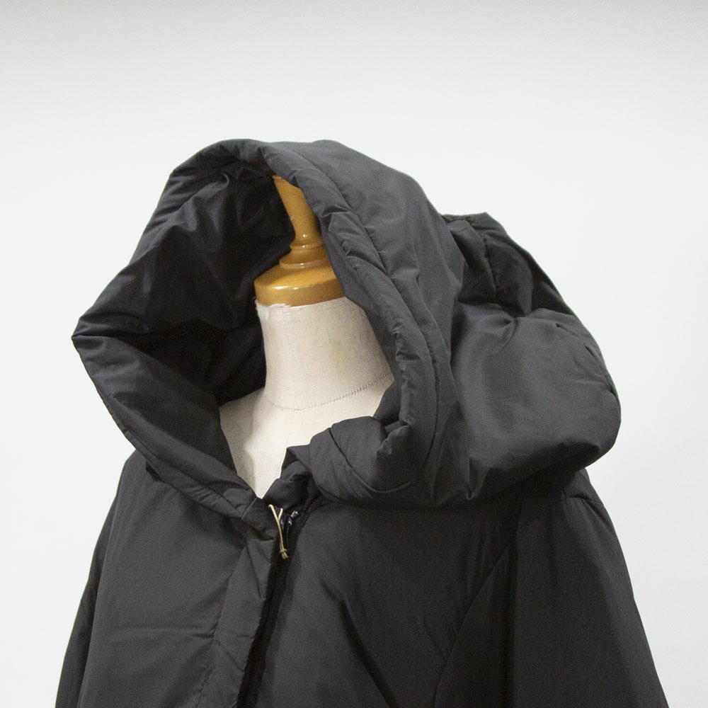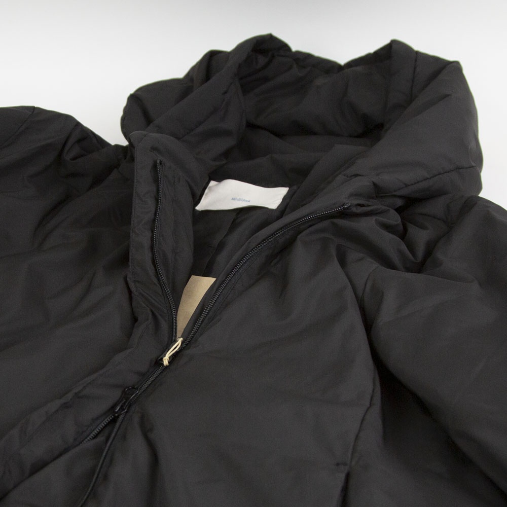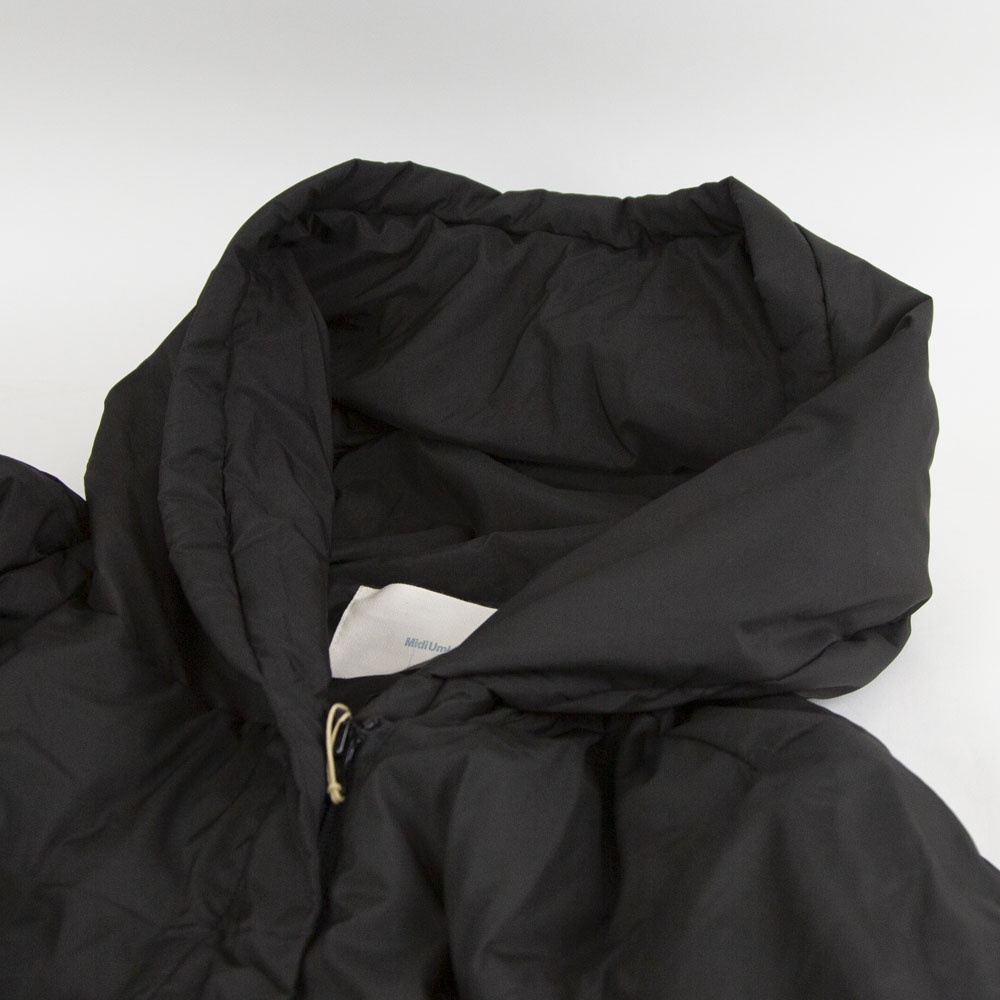 表も裏もリサイクルタフタ素材で中綿はアップサイクルダウンを使用したエコダウン、フード付きミドルダウンです。首を覆うようなフ―ドがポイント。MidiUmiの人気型のフードダウンでダウンのもこもこ感が苦手な方にもオススメな1枚です。袖口は風通しのないゴム使用、裾はドロストコードを絞って着用してもOK。