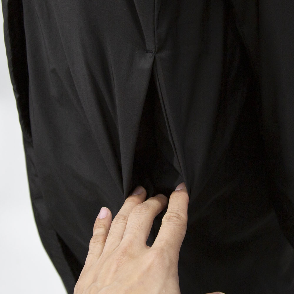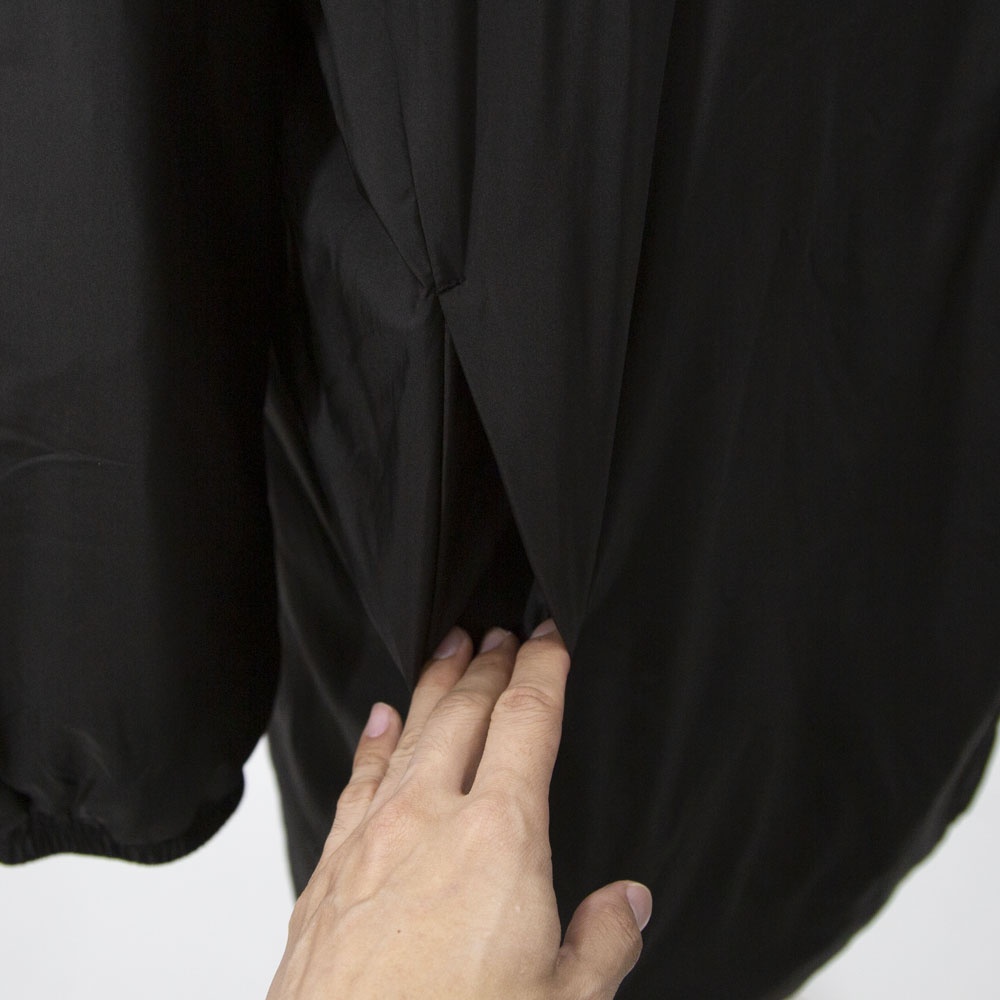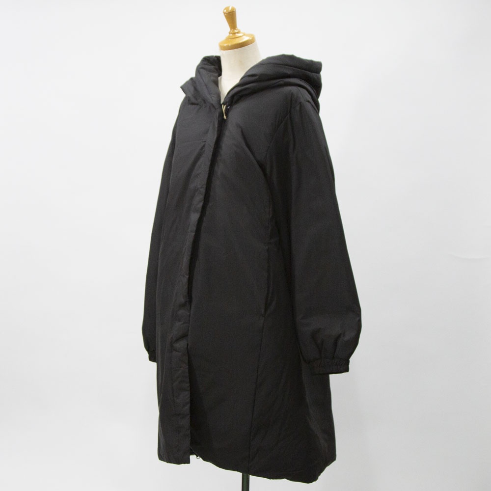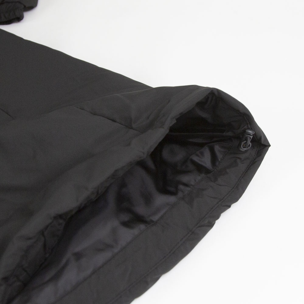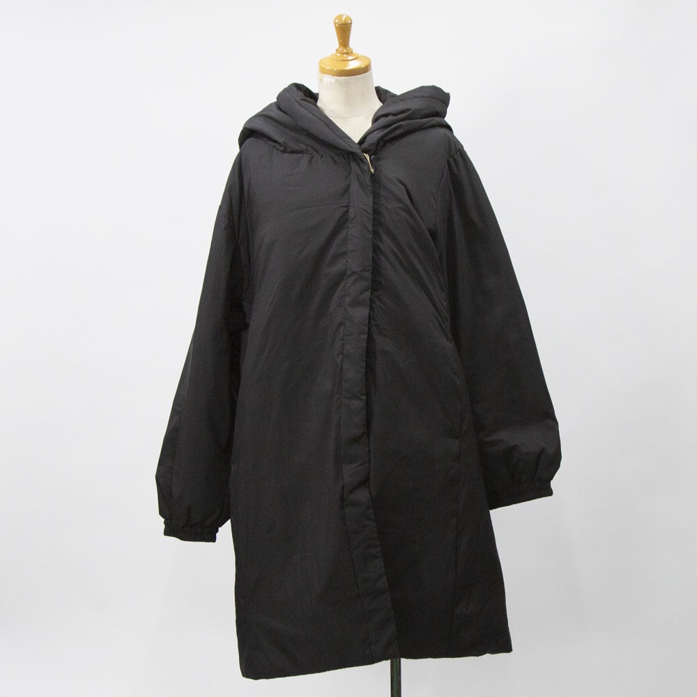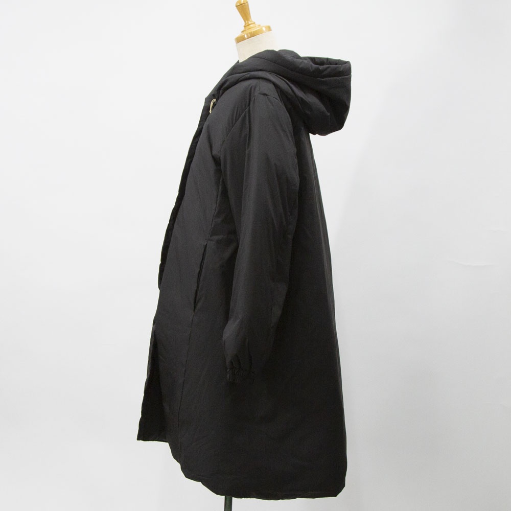 表も裏もリサイクルタフタ素材で中綿はアップサイクルダウンを使用したエコダウン、フード付きミドルダウンです。首を覆うようなフ―ドがポイント。MidiUmiの人気型のフードダウンでダウンのもこもこ感が苦手な方にもオススメな1枚です。袖口は風通しのないゴム使用、裾はドロストコードを絞って着用してもOK。