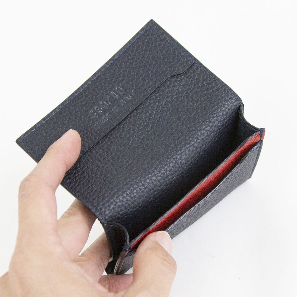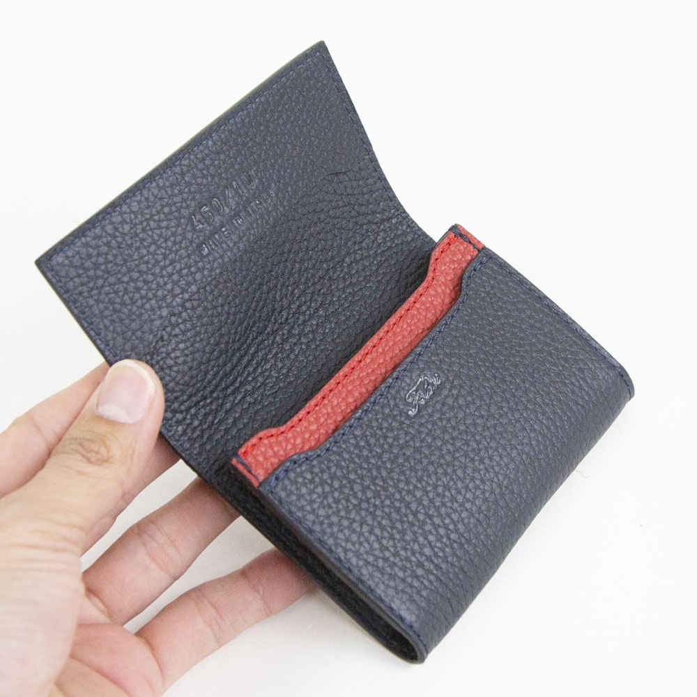 機能性としては、1室構造にカードポケットが1つ備わったシンプルな機能美と、持ち運びしやすいコンパクトサイズが特長。ジャケットの内ポケットやミニバッグにも収納しやすく、スタイリッシュな使い心地が魅力です。また、程よいマチ幅のあるつくりのため、通常の厚みの名刺であれば約50枚ほど収納可能。さらに内側も総革つくりとなっておりFelisiらしい追求した素材使いを愉しめます。表革とのカラーコントラストも印象的です。ビジネスシーンに相応しいミニマルな機能性と、上質な素材による品格が備わった名刺入れは、新社会人の方や大切な人への贈りものとしてもおすすめです。