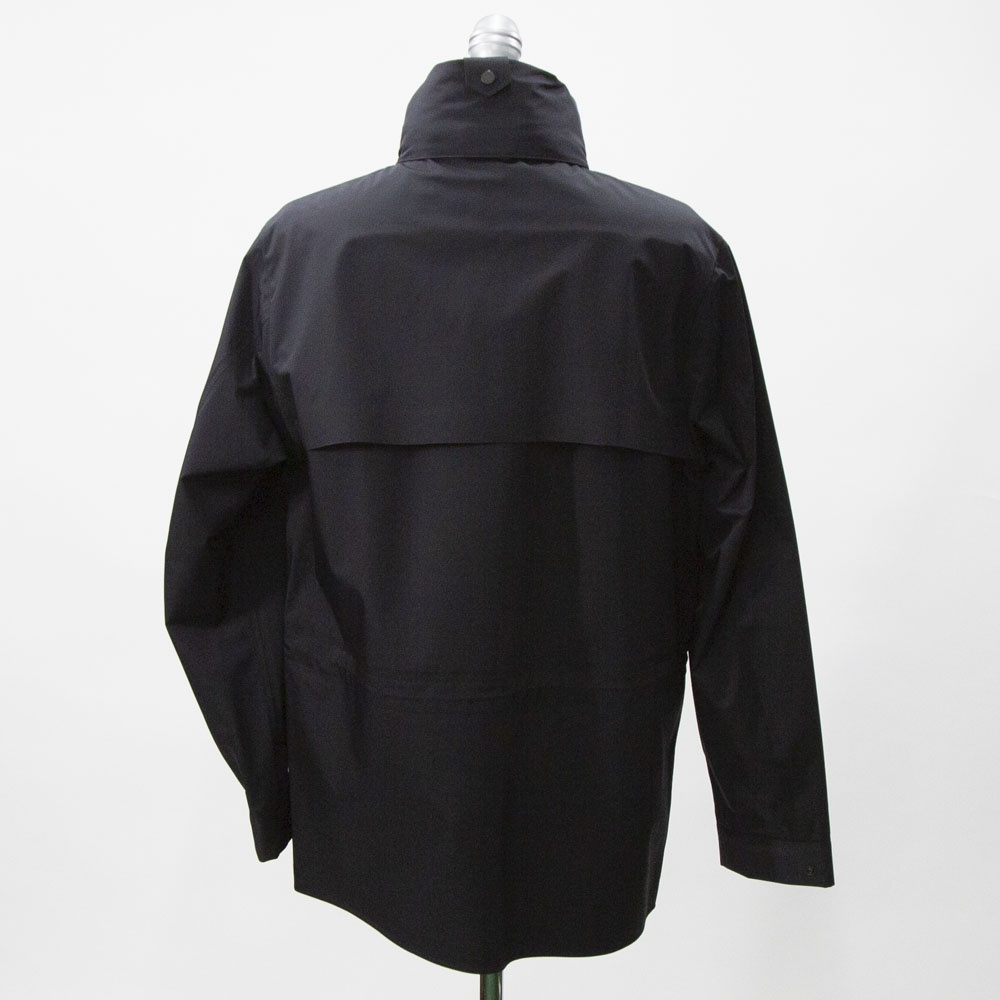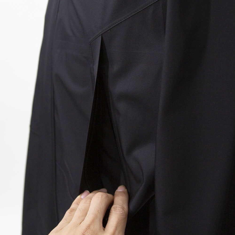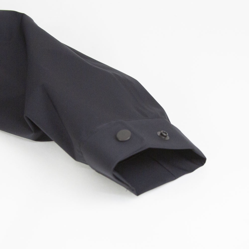 縫い目を圧着テープでシーリングし、各所のタブや裾も圧着加工でシームレスな仕立てにしてあるため、防水性とミニマルなルックスが共存しています。