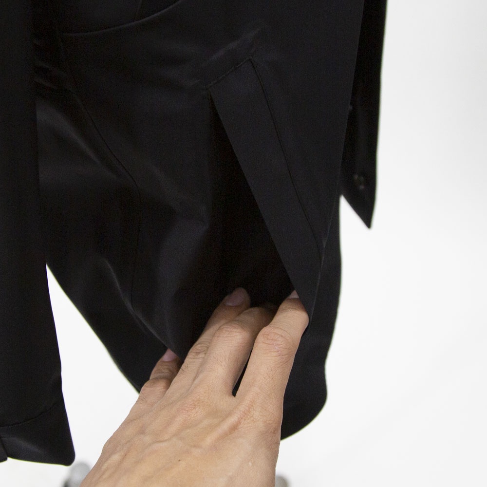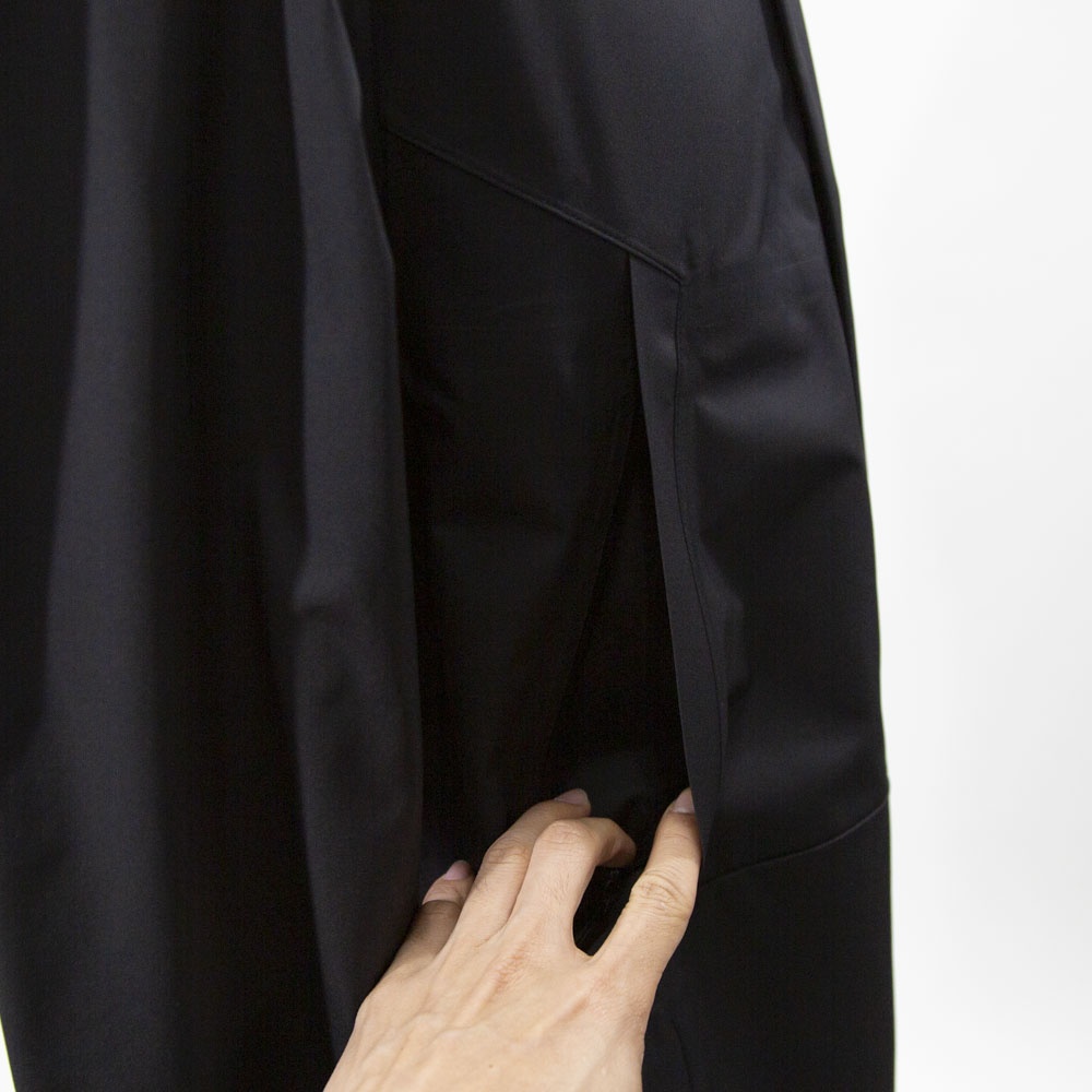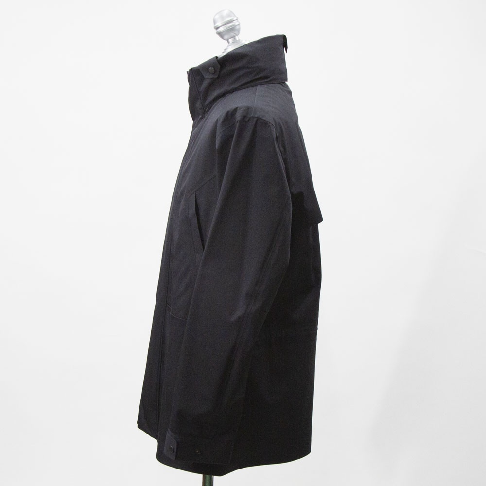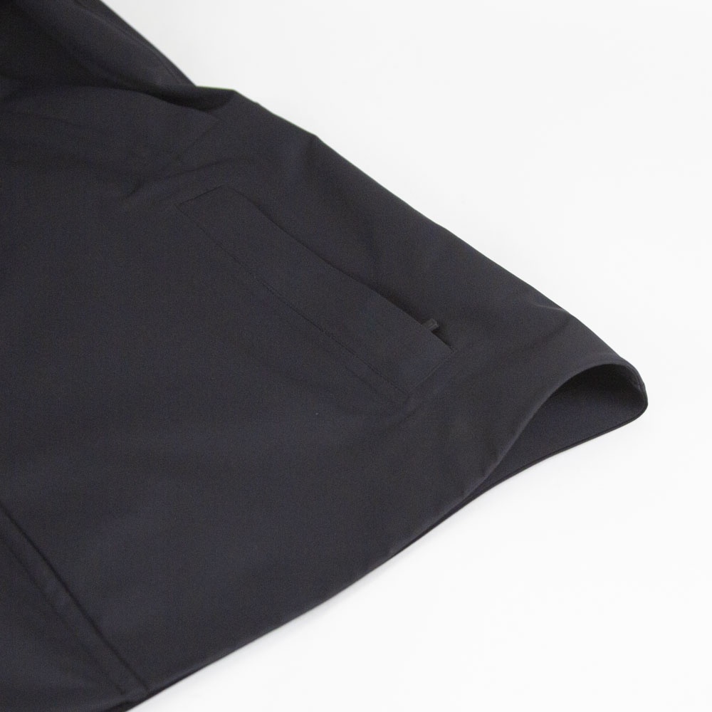 縫い目を圧着テープでシーリングし、各所のタブや裾も圧着加工でシームレスな仕立てにしてあるため、防水性とミニマルなルックスが共存しています。