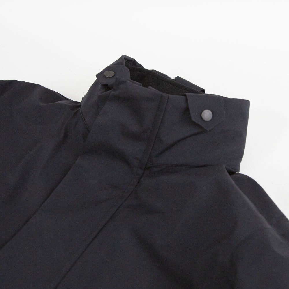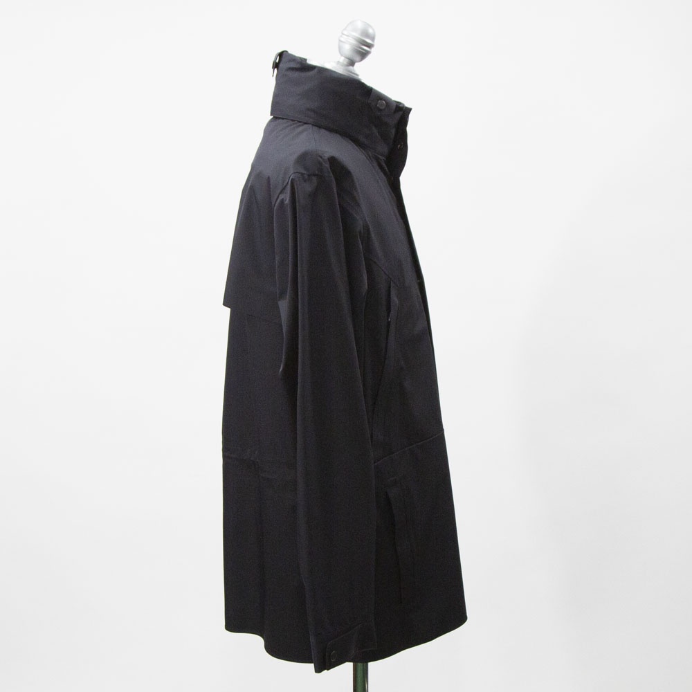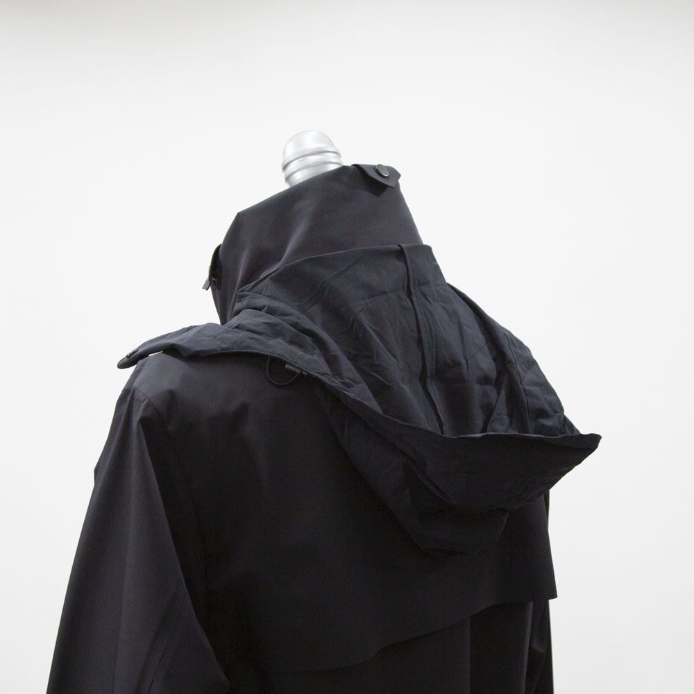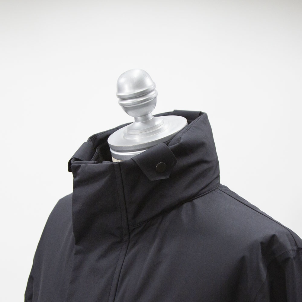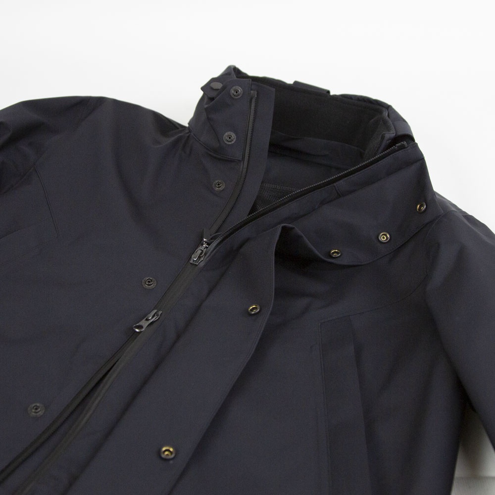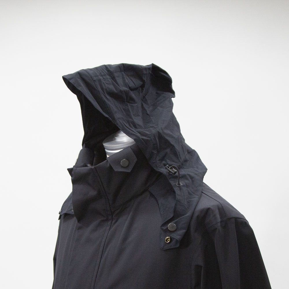 特徴的なスタンドカラーは三層構造になった全天候対応型。インナーリブをファスナーで着脱でき、タブのボタンを外すと内蔵のフードが現れるという機能性の高いデザインです。