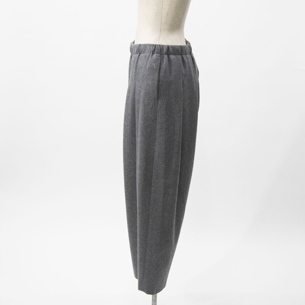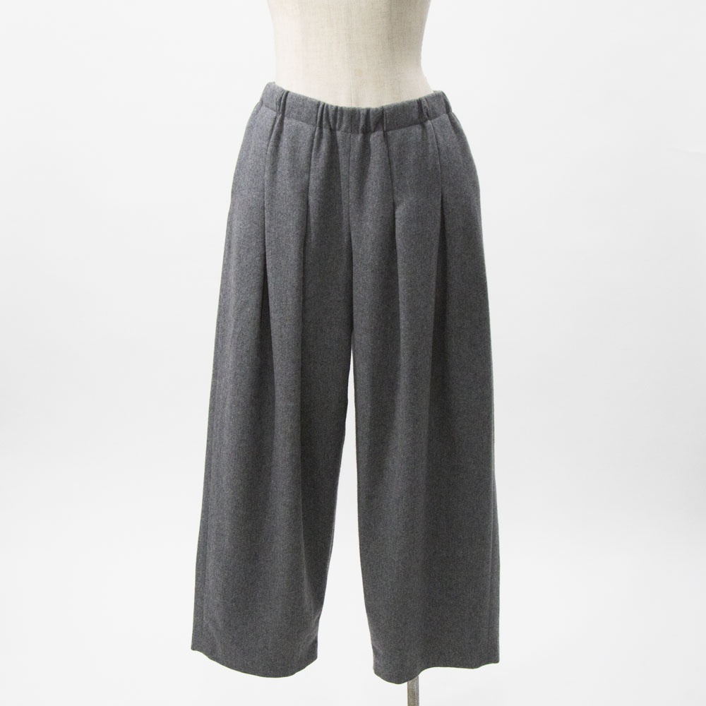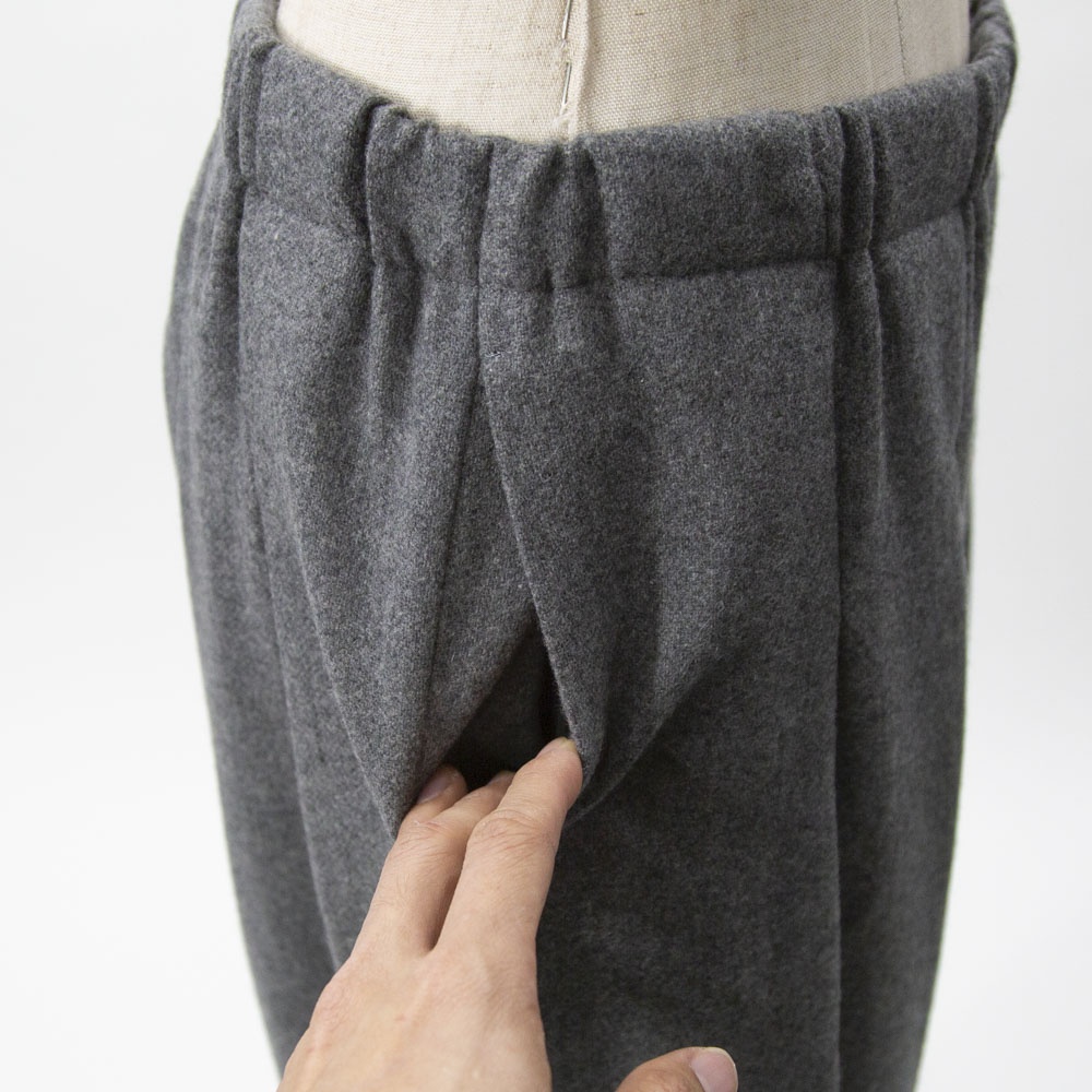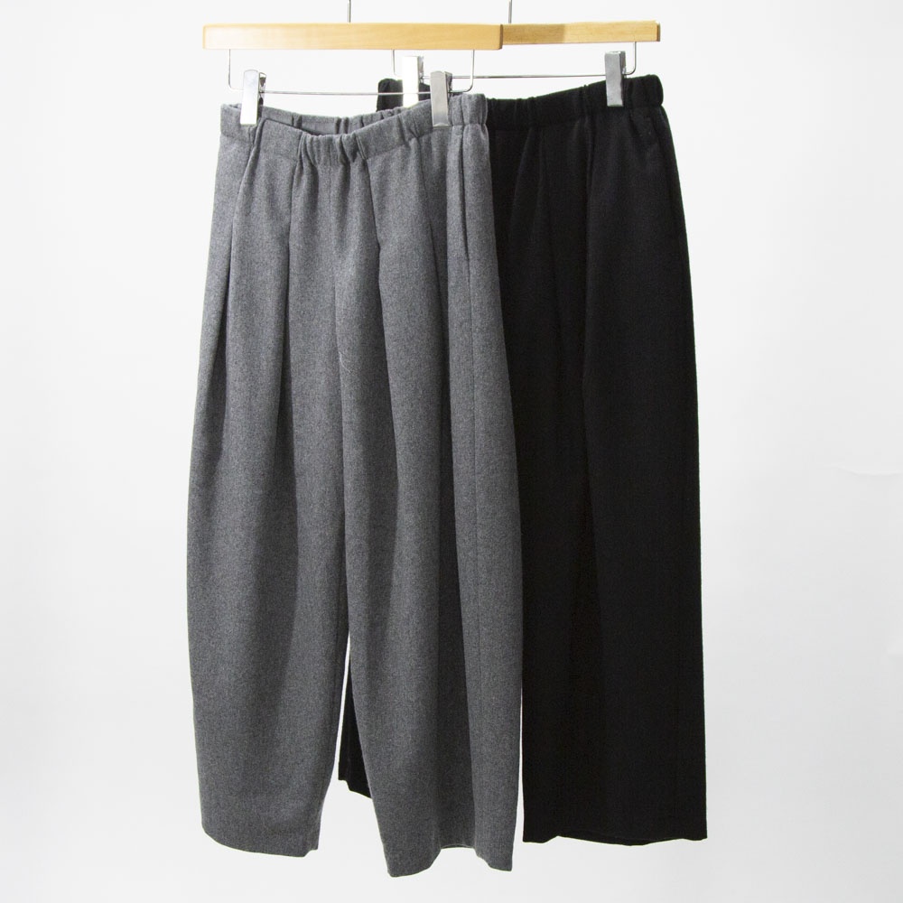 ストレッチのきいた微起毛素材のタックワイドパンツです。温かみのあるアイテムで丸みのあるシルエットは少し短めな丈感で足元のオシャレも楽しんでいただける1枚。腰下位置からタックの入ったmizuiro indらしいデザインです。ウエストはゴム使用。