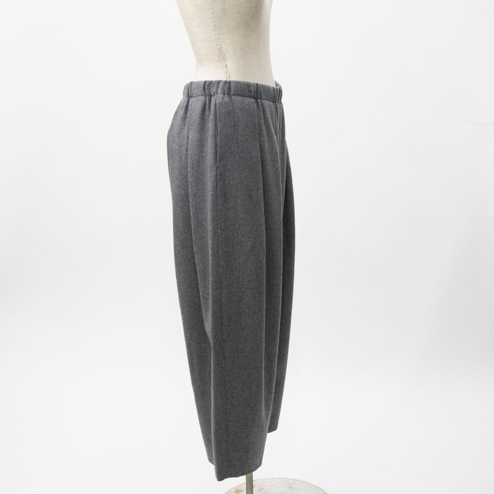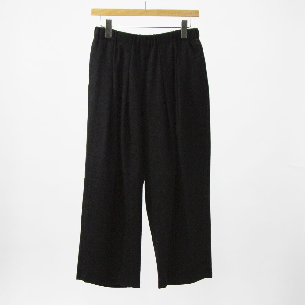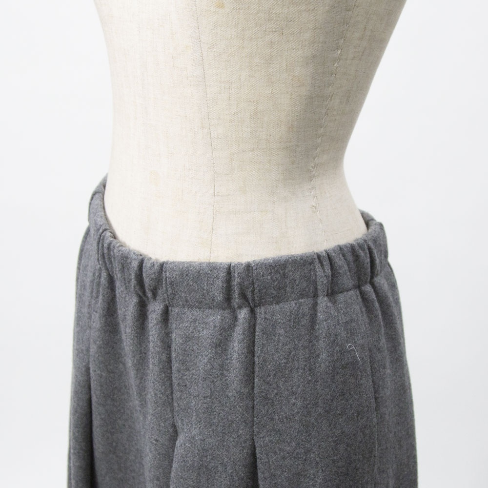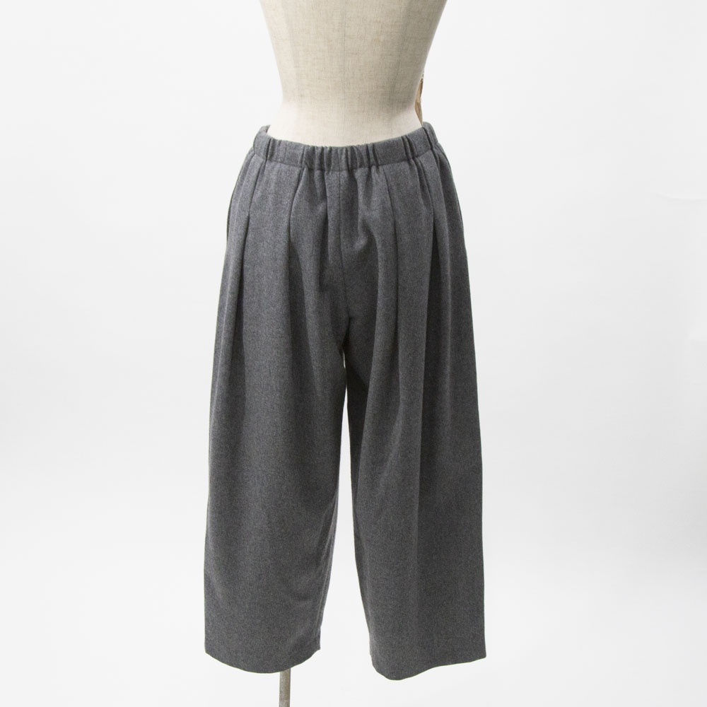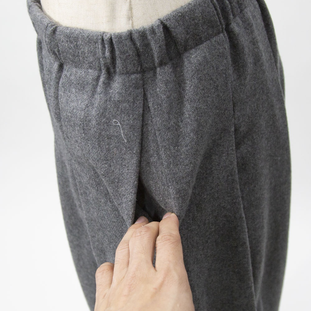 ストレッチのきいた微起毛素材のタックワイドパンツです。温かみのあるアイテムで丸みのあるシルエットは少し短めな丈感で足元のオシャレも楽しんでいただける1枚。腰下位置からタックの入ったmizuiro indらしいデザインです。ウエストはゴム使用。