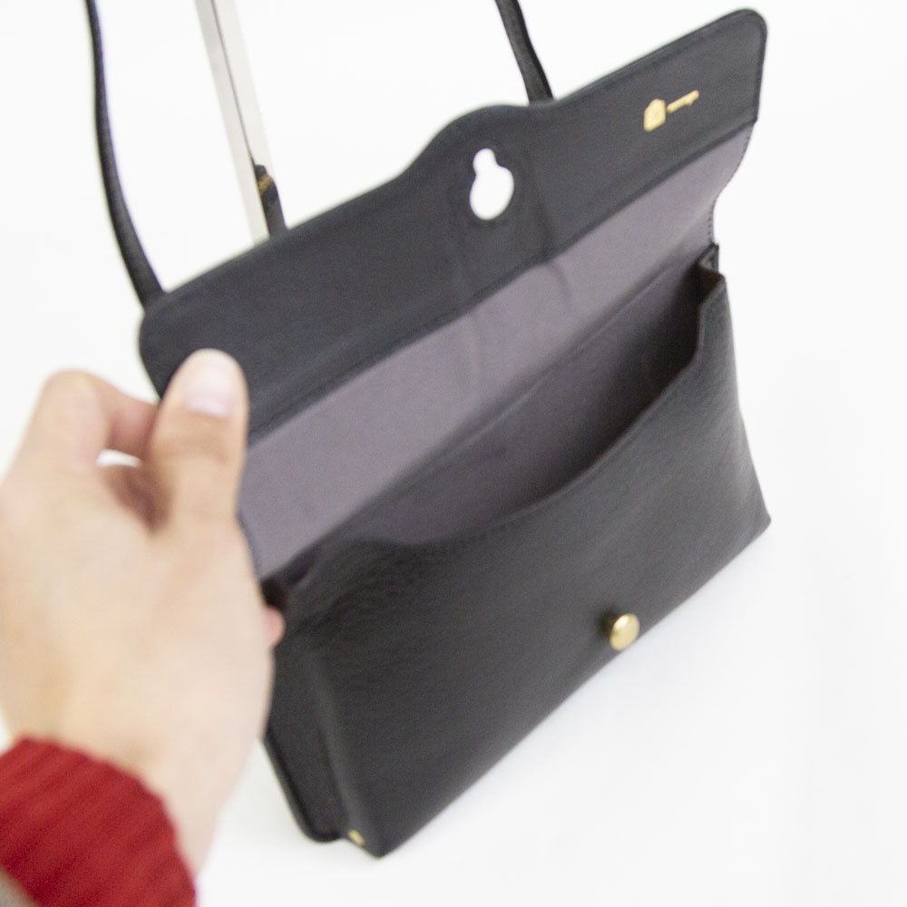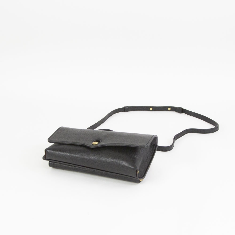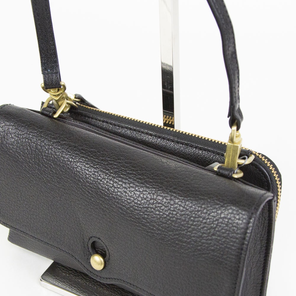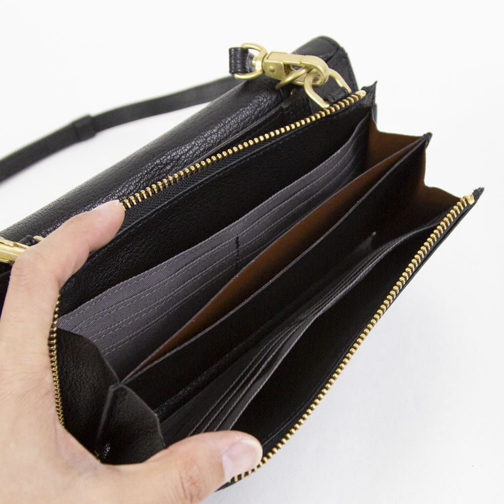取り外し可能なウォレットとポーチがひとつになるショルダーです。各々単体でショルダーをつけて使うことができます。ポシェットの背面にはポケットがついています。またベルトループもついているのでお手持ちのベルトを通してウエストポーチとしてもお使いいただけます。