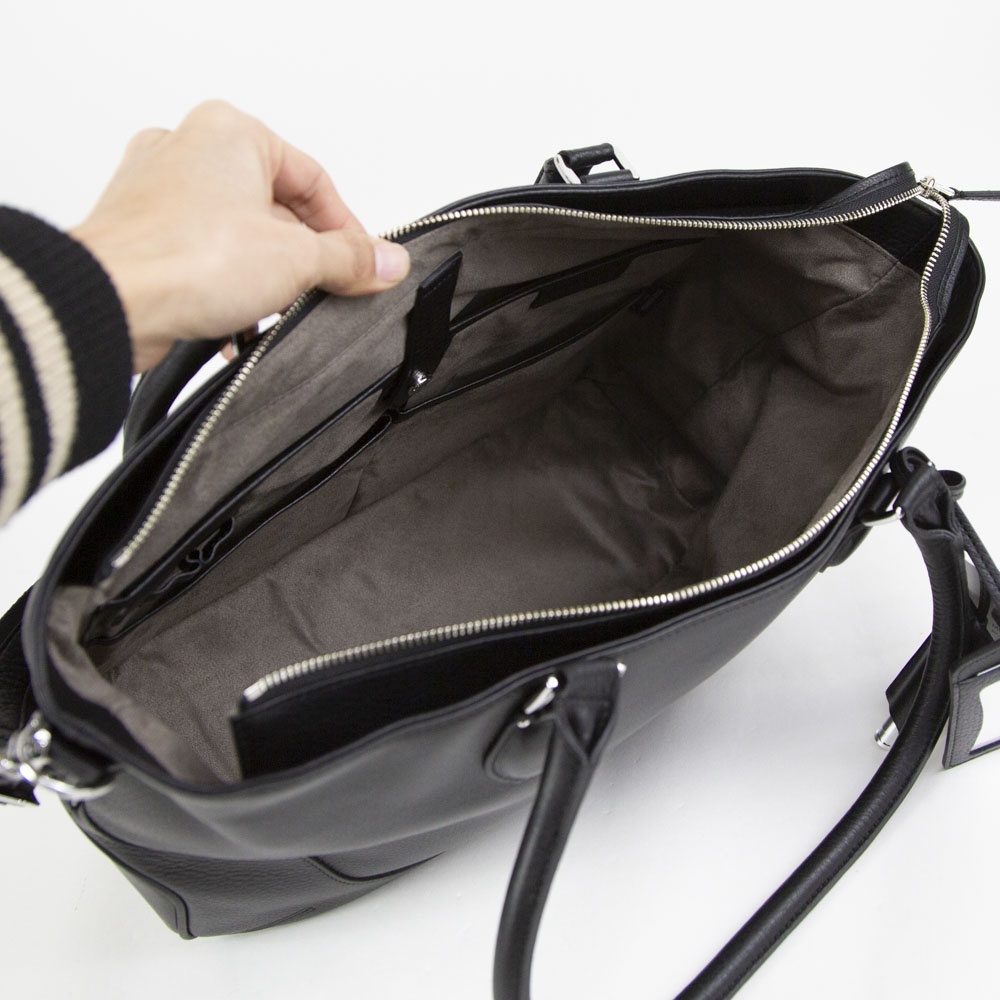 コンパートメントされたポケットやペン差しなど、スッキリスマートに収納できる内装。ポケットにはウレタンが入っているのでスマホなどを入れるのにも便利です。ボトムは底びょう付きで置いて使うのも安心。メイン収納の開口部はジップ式で中の物が見えず、セキュリティー面もしっかり。シングルジップにすることで、開きやすくなりました。前側についたあおりポケットがちょっとした小物の整理をしやすくしています。電車で座ったときに膝の上に収まりやすいサイズ感にすることで、日常のちょっとしたシーンも快適に過ごせるようになっています。