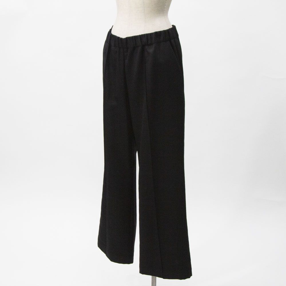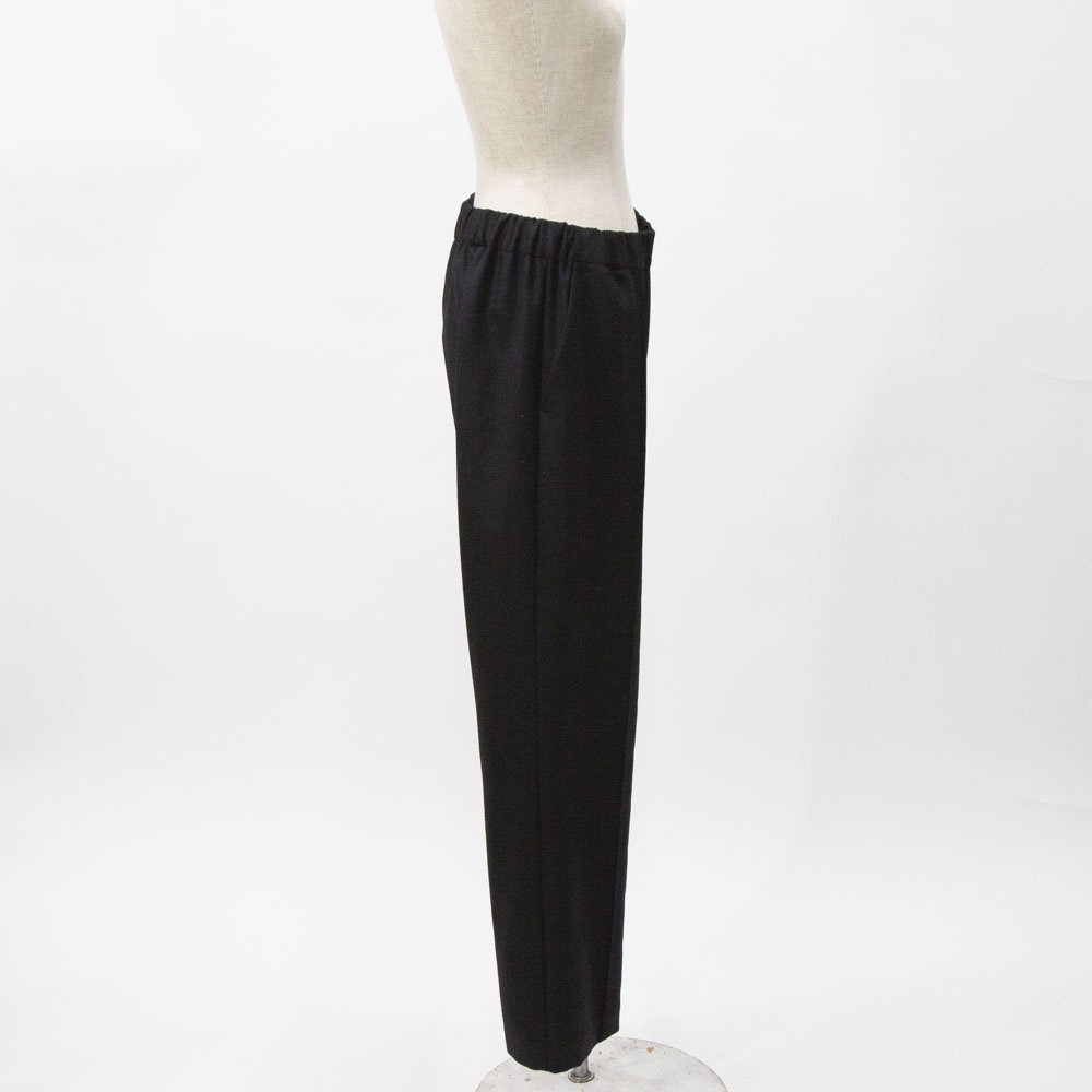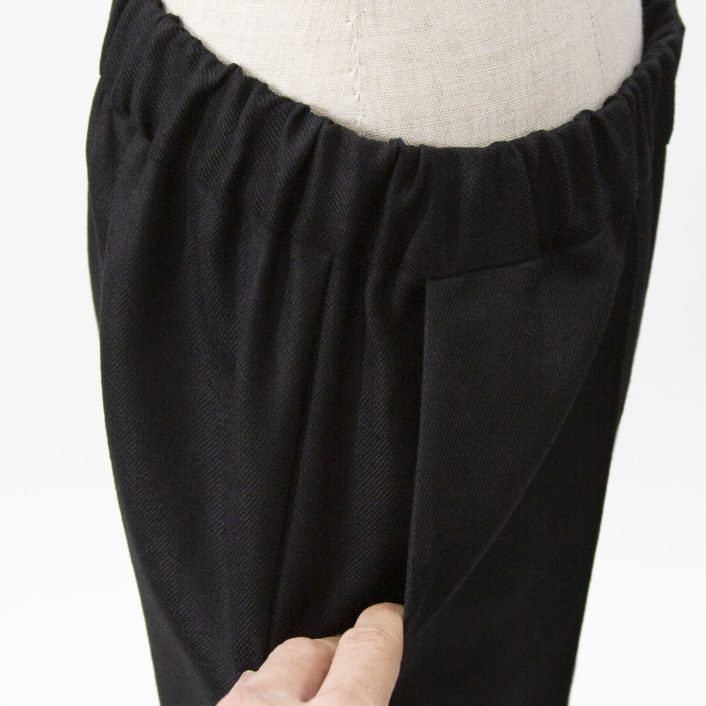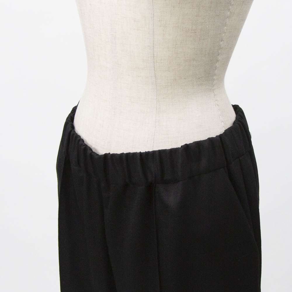 やわらかなウールツイルのパンツ。 ウエストゴム仕様で気軽に着ていただけますが、センタークリースステッチでフォーマルにも着ていただけます。 さまざまなトップスと合わせやすい、程よいシルエットです。 ウエストゴム仕様です。 脇左右にポケットがあります。 ウエスト左内側にゴム入替口があります。