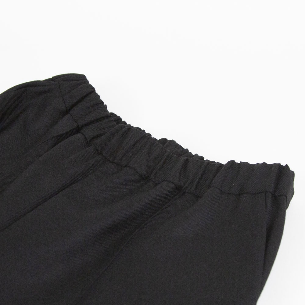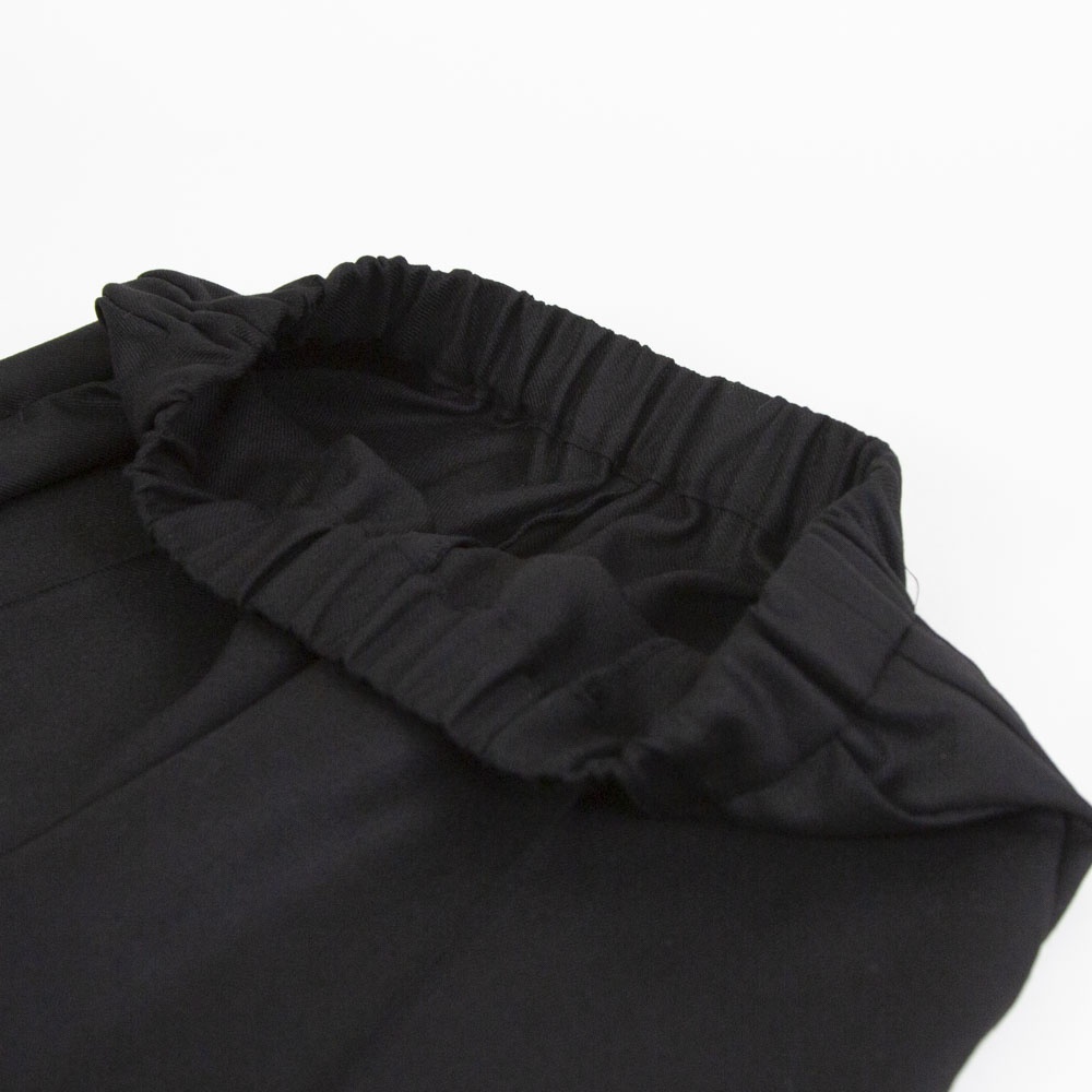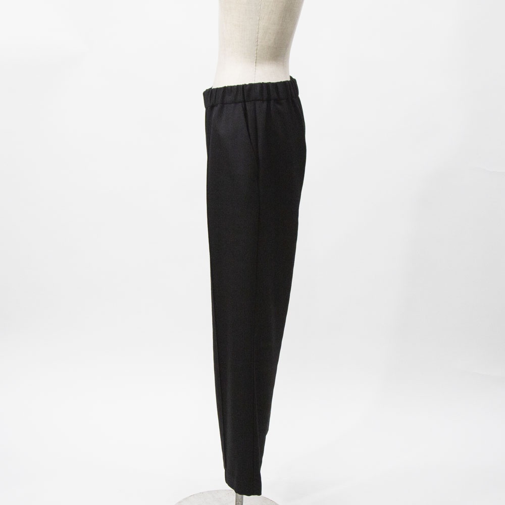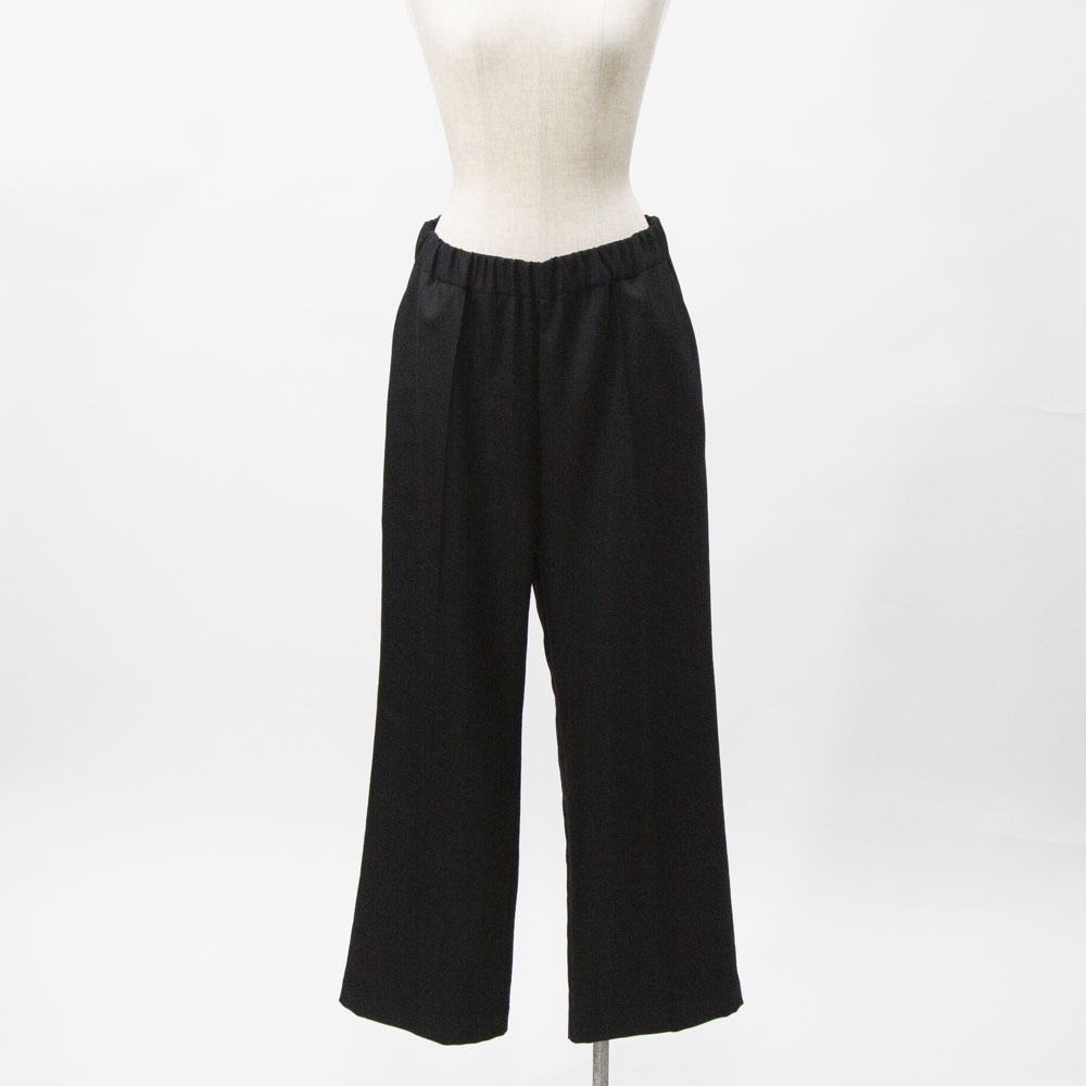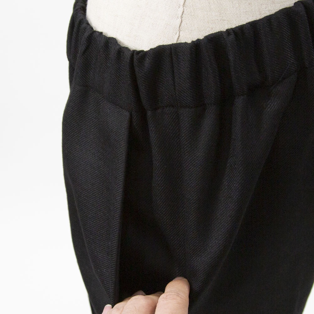 やわらかなウールツイルのパンツ。 ウエストゴム仕様で気軽に着ていただけますが、センタークリースステッチでフォーマルにも着ていただけます。 さまざまなトップスと合わせやすい、程よいシルエットです。 ウエストゴム仕様です。 脇左右にポケットがあります。 ウエスト左内側にゴム入替口があります。