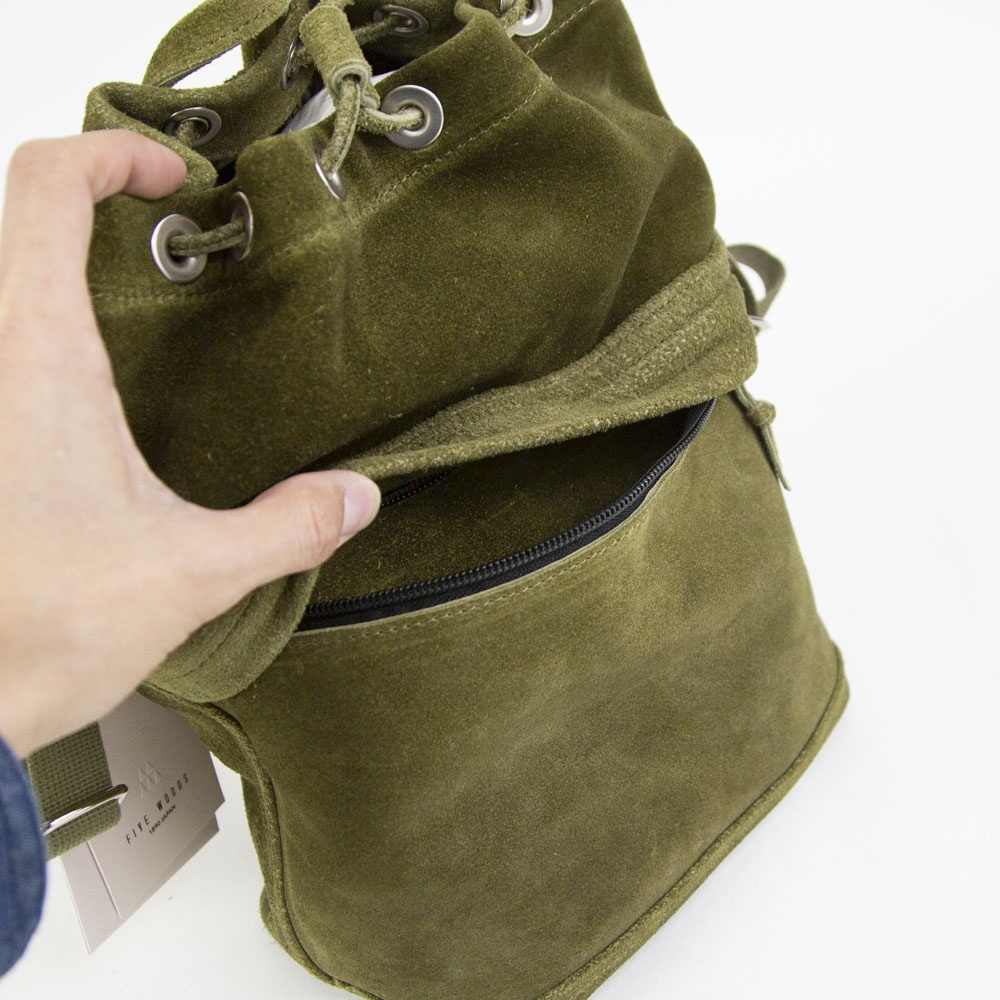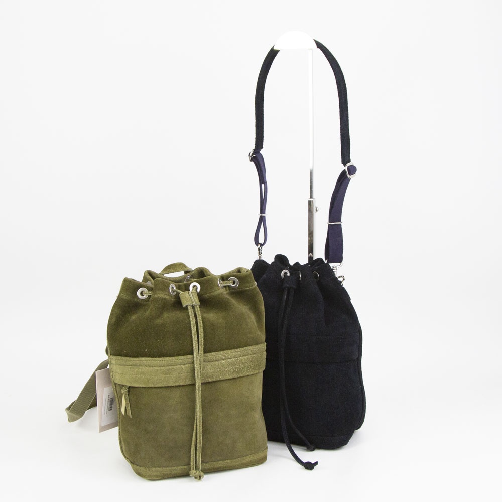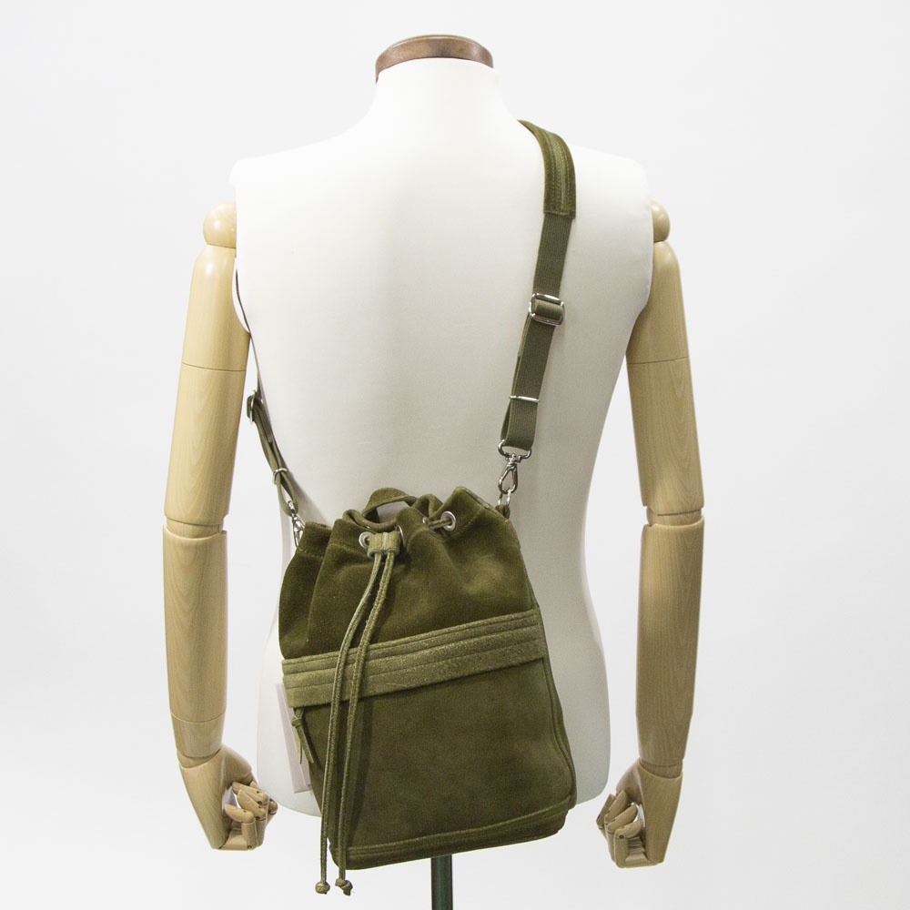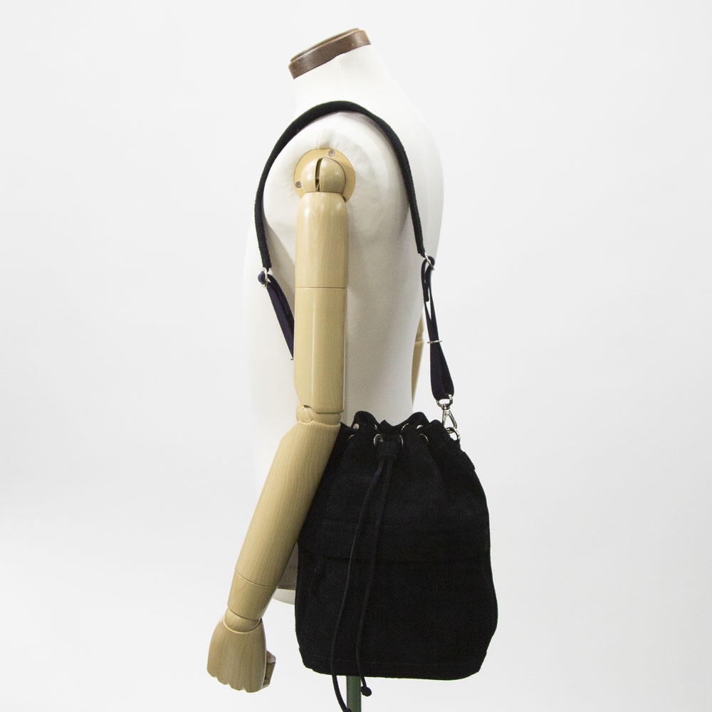 あたたかみのあるスエードの表情を活かした、上質でリラックス感のある巾着バッグ。日常の小さな必需品はもちろん、ペットボトルやコスメポーチなど嵩張るものも余裕をもって収納できます。同素材のポーチを組み合わせればより機能的に仕分けすることも可能です。フロントに設けたファスナーポケットは、スマートフォンなどよく使うものの収納に便利。内装にはペイズリー柄のオリジナルジャカード生地でつくったポケットを装備。取り外しのできるショルダーストラップが附属します。